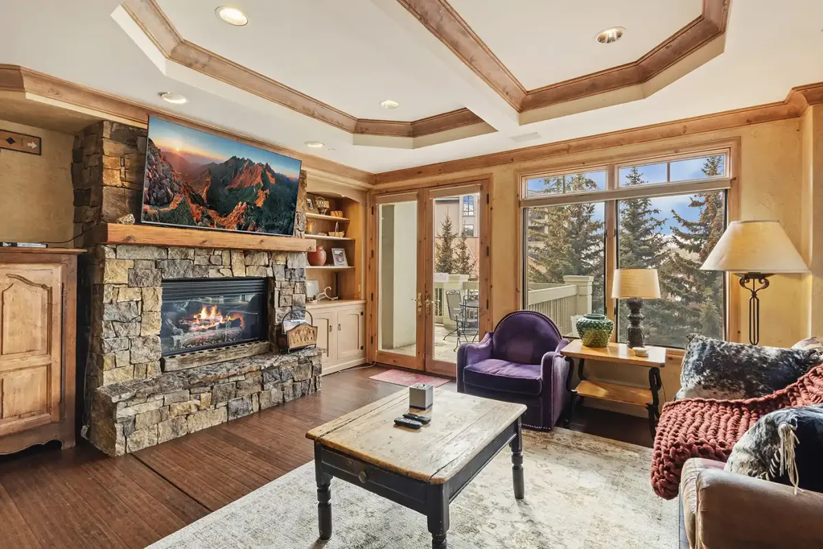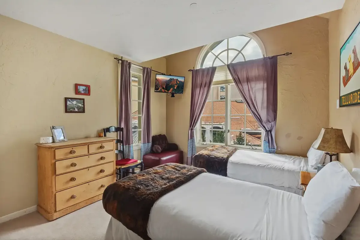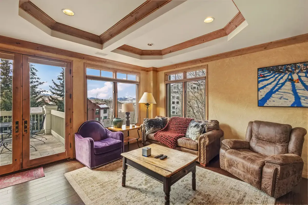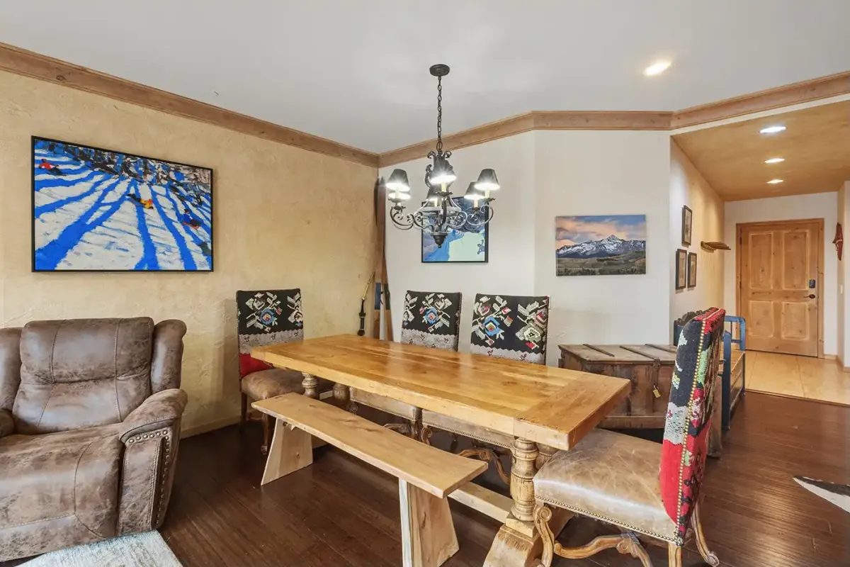 Accessed via elevator, the condo welcomes you into a tiled mudroom with space for coats and boots after a day on the slopes. From here, the home opens into a light-filled living space framed by sweeping 180-degree southwest views. Step onto the private deck to take in vistas of the Wilson Peak range, vibrant alpine sunsets, and the lively plaza and seasonal ice-skating rink below.