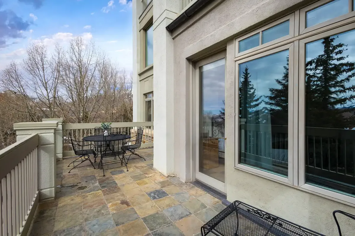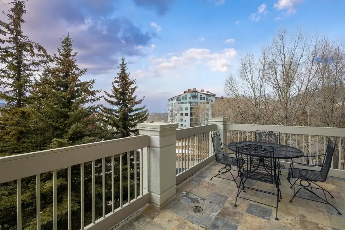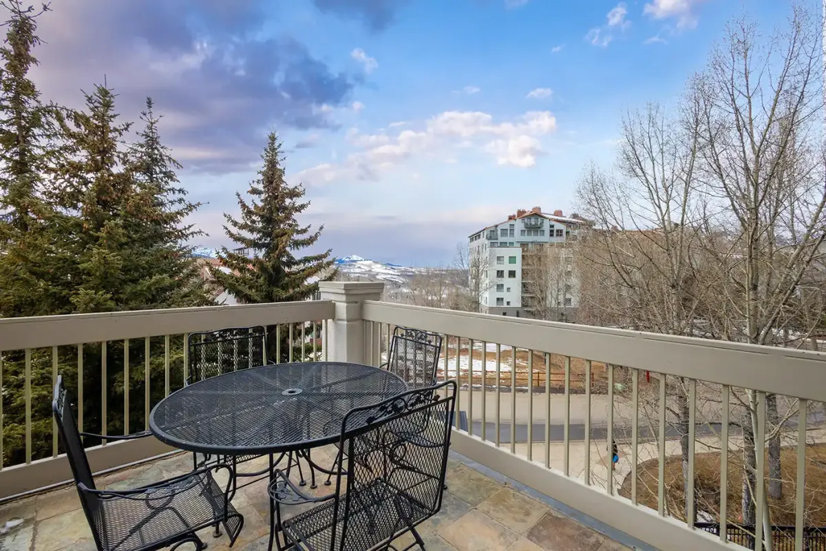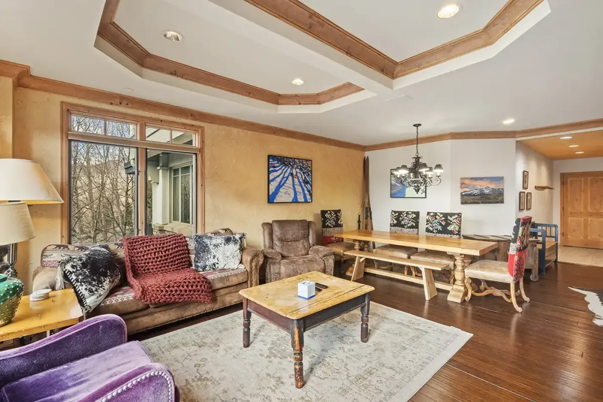 Accessed via elevator, the condo welcomes you into a tiled mudroom with space for coats and boots after a day on the slopes. From here, the home opens into a light-filled living space framed by sweeping 180-degree southwest views. Step onto the private deck to take in vistas of the Wilson Peak range, vibrant alpine sunsets, and the lively plaza and seasonal ice-skating rink below.