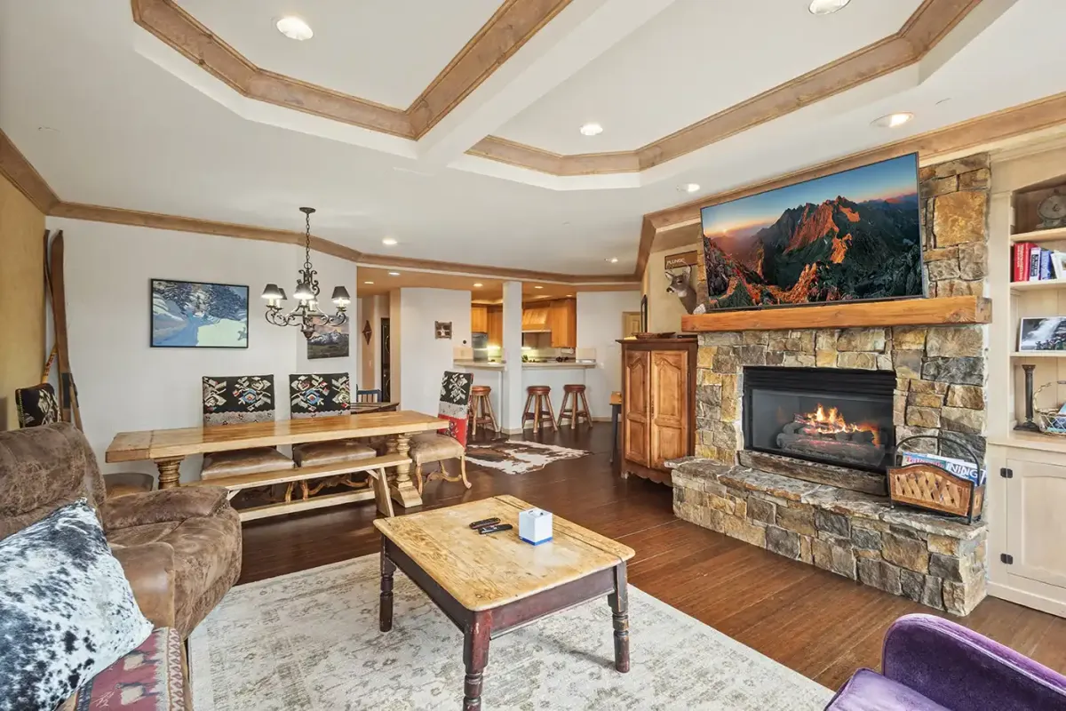 The living room features a gas fireplace and flatscreen TV, creating a cozy setting for après-ski relaxation. A dining table with seating for six anchors the space, making it easy to gather for meals or game nights.