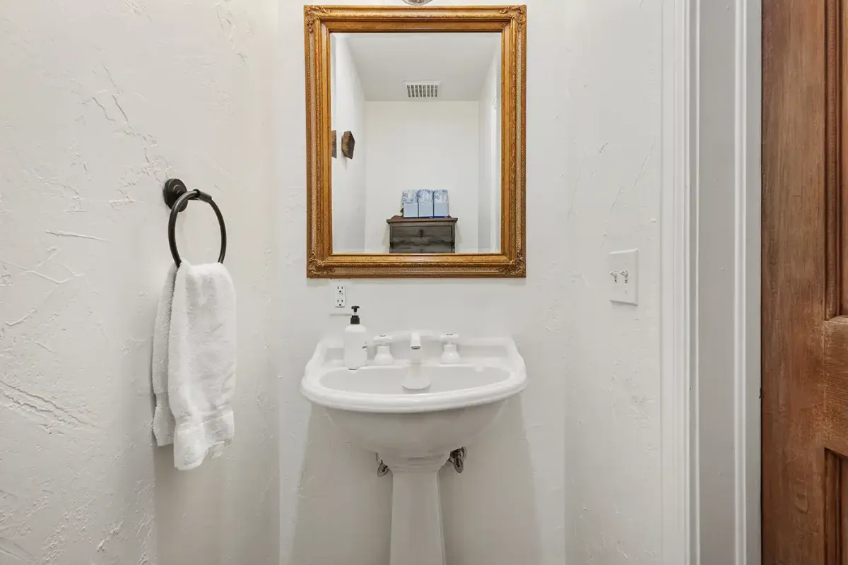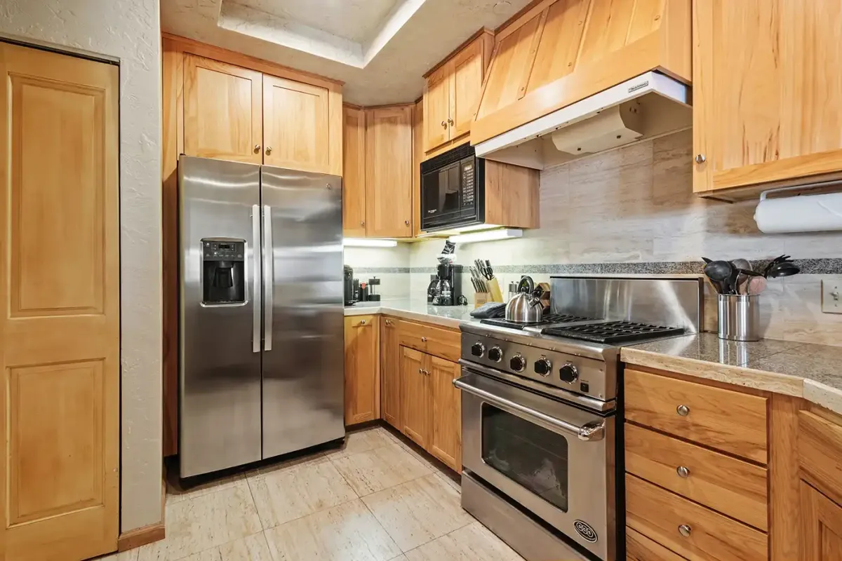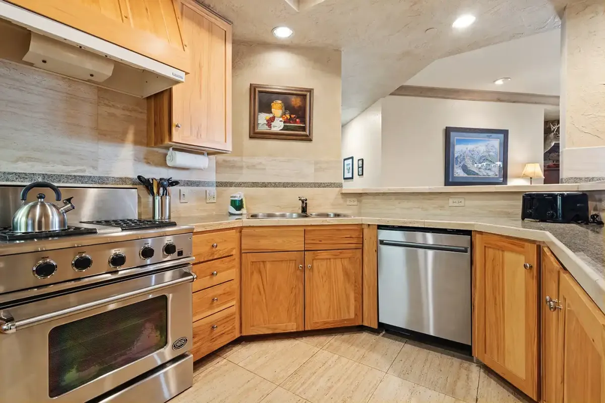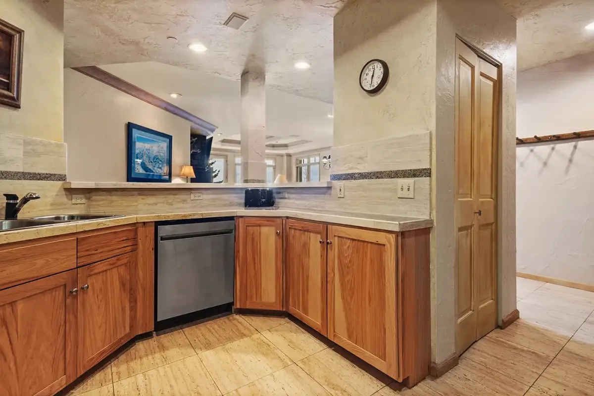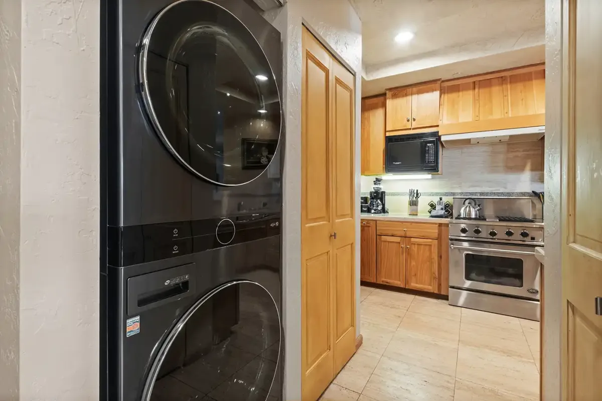 Just off the entry, the kitchen is equipped with granite countertops and a breakfast bar with seating for three—ideal for morning coffee before first chair. A washer and dryer are conveniently located next to the kitchen for added ease during extended stays.