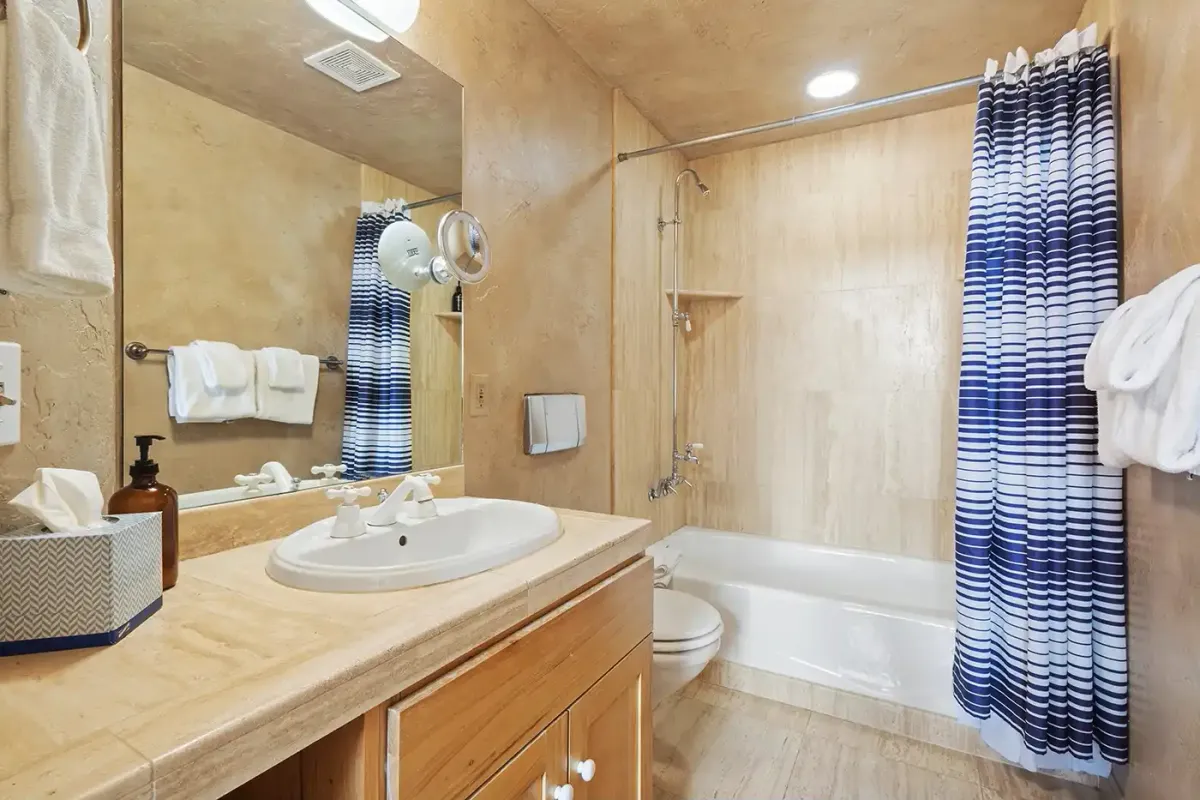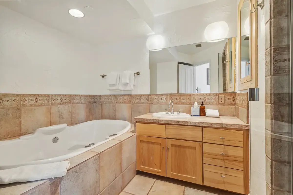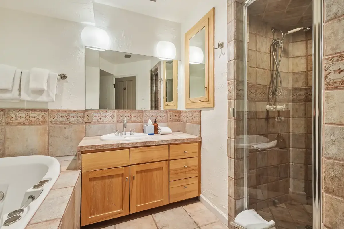 Down the hallway, the primary suite offers a queen bed, flatscreen TV, and a private bath designed for indulgence, complete with a jetted soaking tub, separate steam shower, and beautiful stone finishes. The second bedroom features a split-king bed for flexible sleeping arrangements and its own private bathroom with a shower/tub combination.