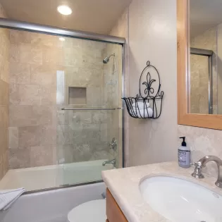 The primary bedroom suite is an exquisite, private hideaway, and includes a king-size bed that sits beneath rustic, exposed wood beams. There’s lots of closet space, an HDTV, and a spa-like ensuite bathroom with a step-in shower and separate tub. A curved stone stairway leads up to the two additional bedrooms, each with queen-size beds and attached full bathrooms. There’s also a laundry room with a stacked washer and dryer.