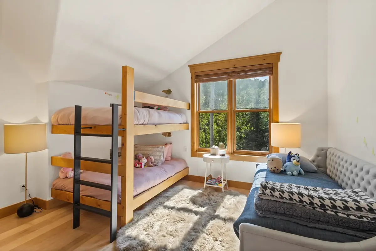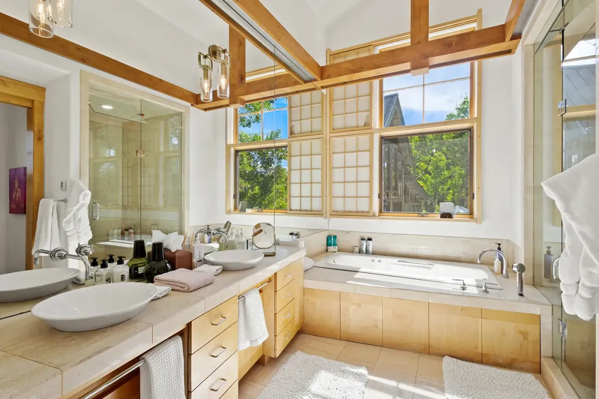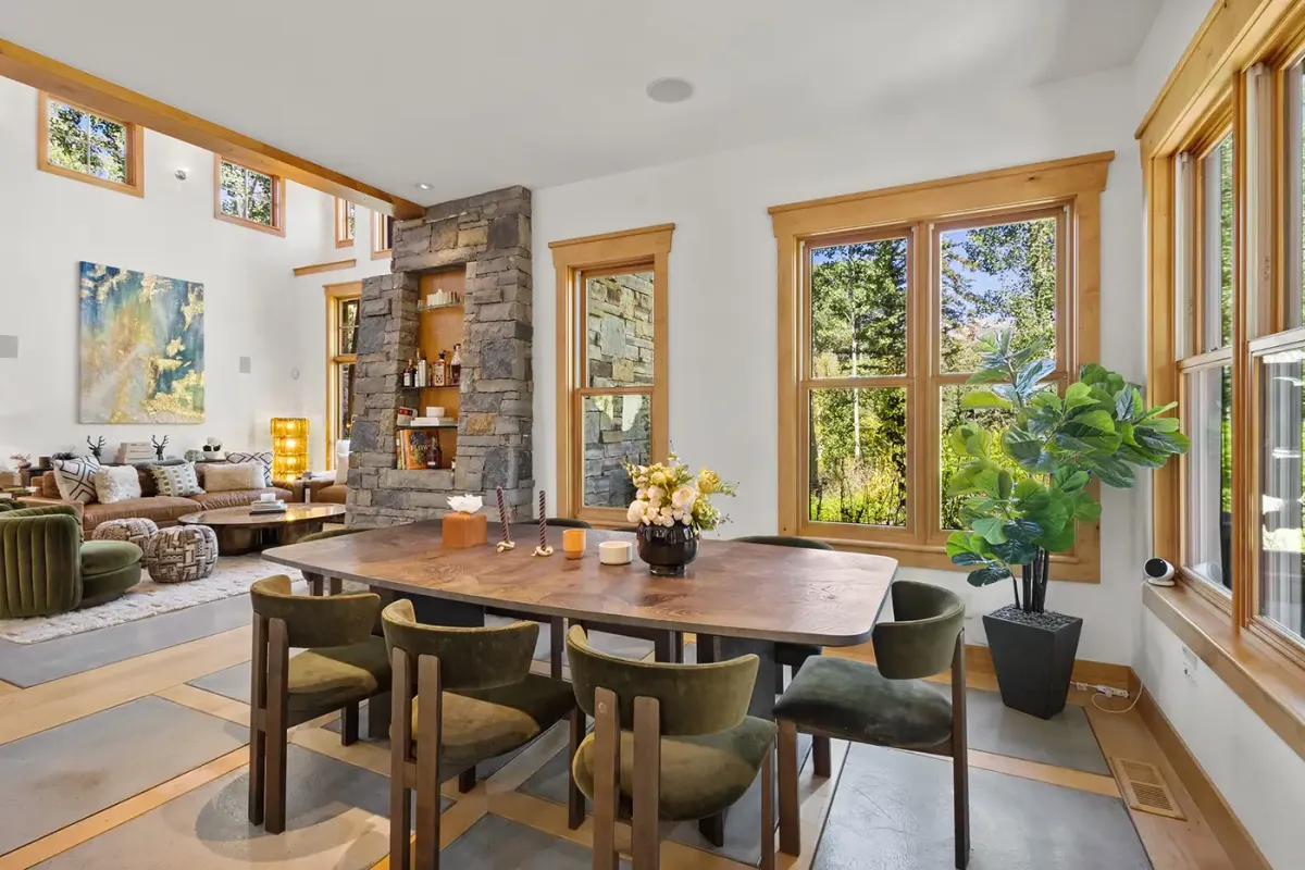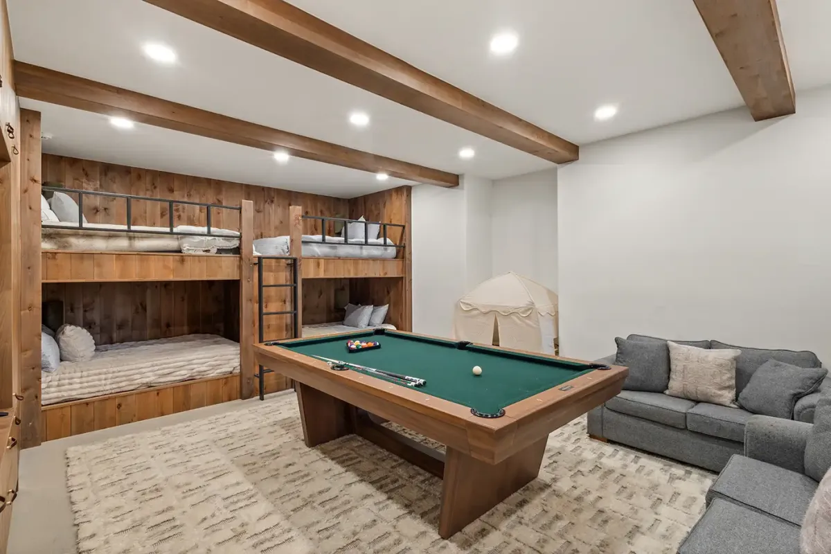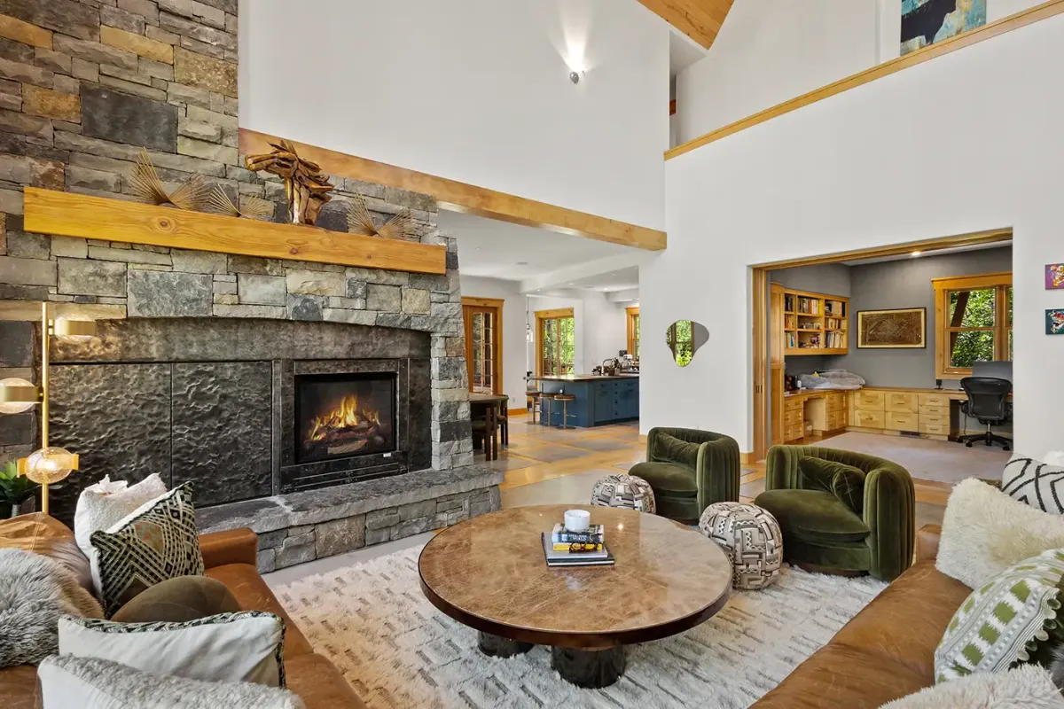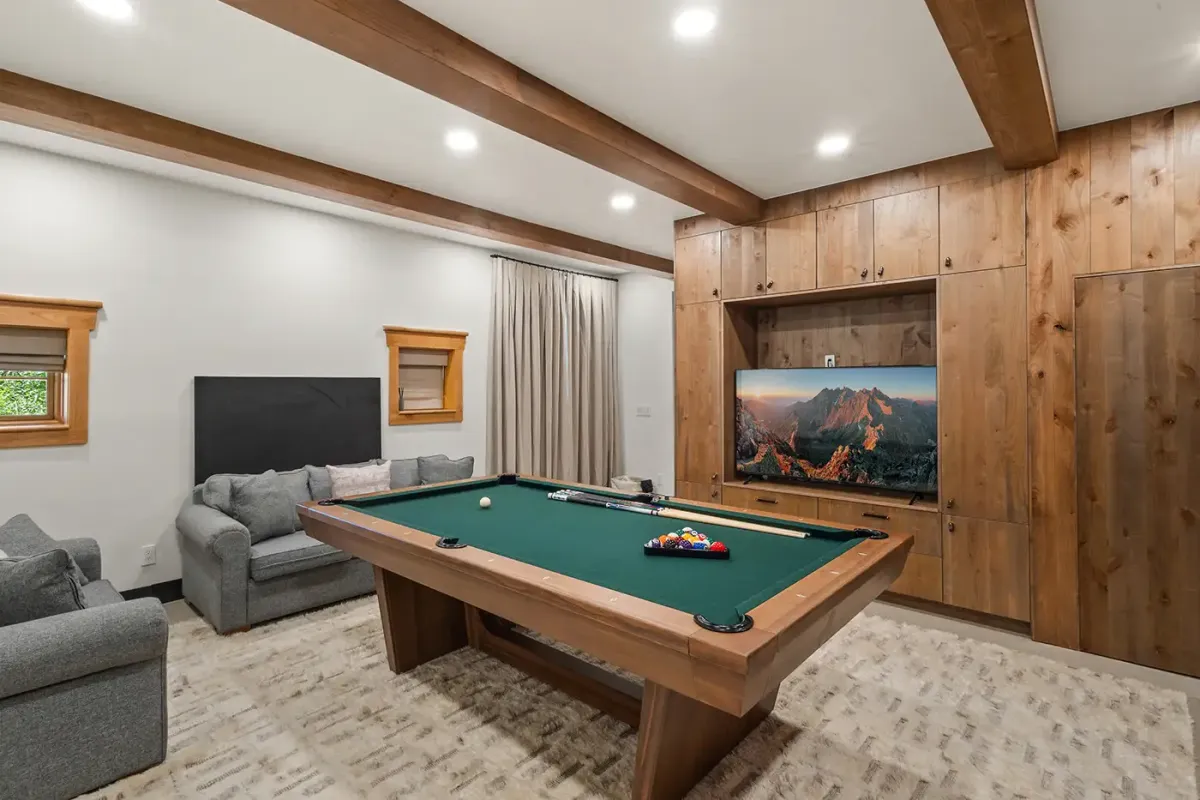 Additional amenities elevate the experience, including a second family room with vaulted ceilings and a fireplace, wide-plank white oak floors, and a spacious mudroom to accommodate gear after a day of adventure. Thoughtful touches and modern furnishings throughout the home create a seamless blend of casual elegance and practicality.