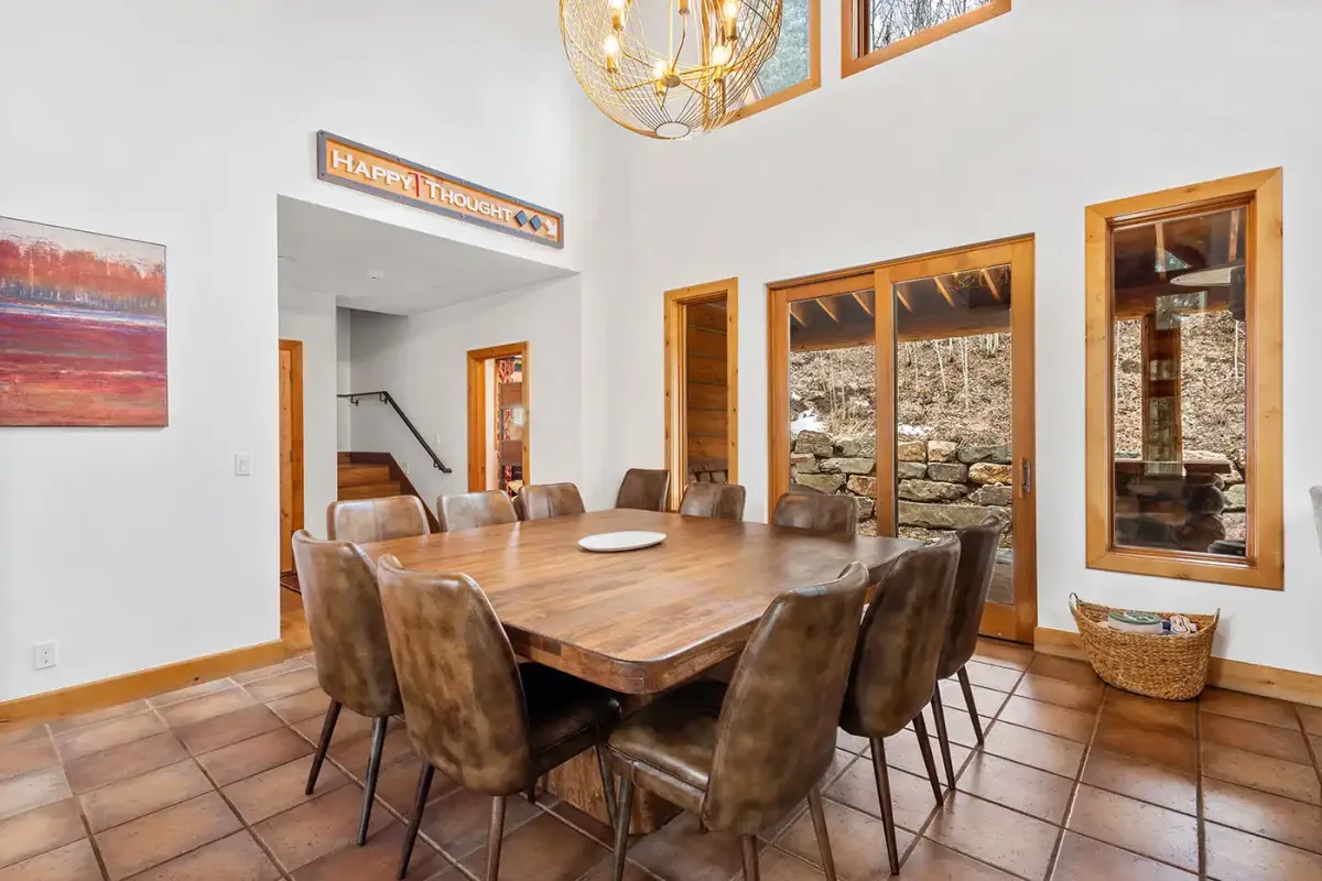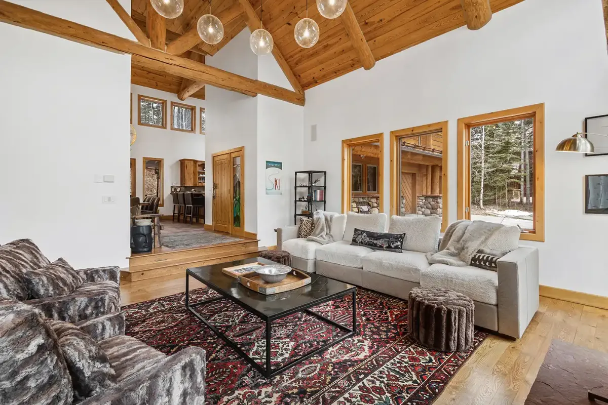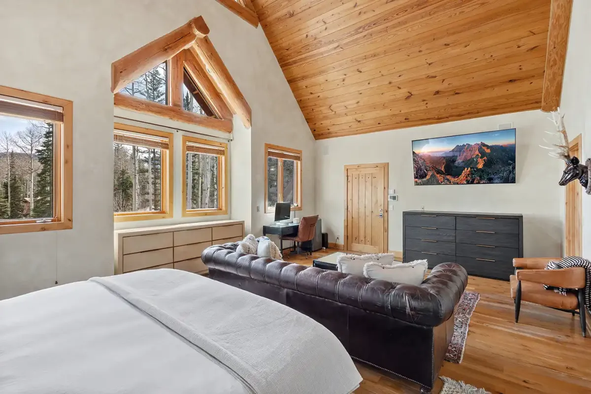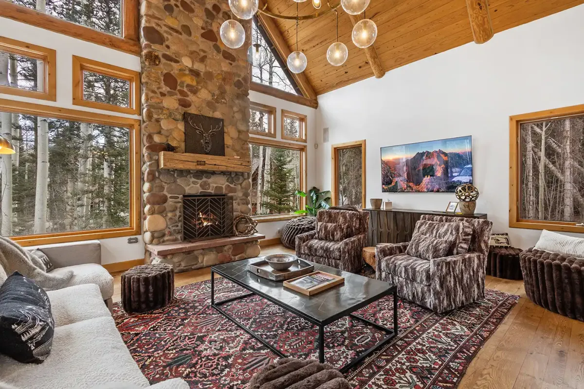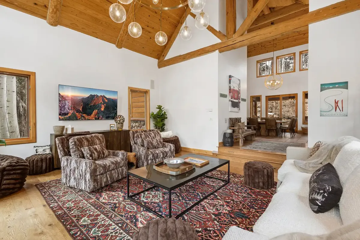 Step inside to a welcoming, light-filled interior where vaulted ceilings and expansive windows frame beautiful views of the San Sophia Range. The sunken living room invites you to unwind with a customizable Lovesac sectional, oversized loungers, cozy armchairs, and a large flat-screen TV—all centered around a stunning stone fireplace. It’s the perfect place to gather after a day of skiing, hiking, or exploring.