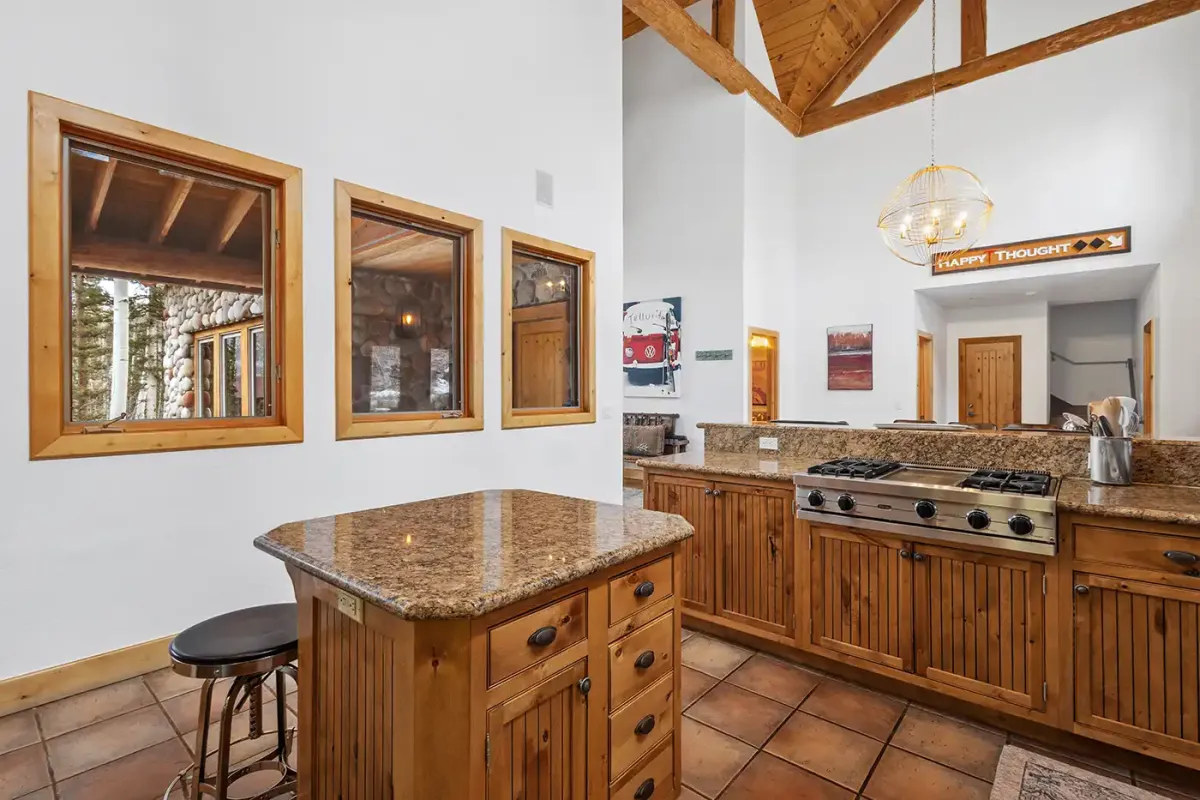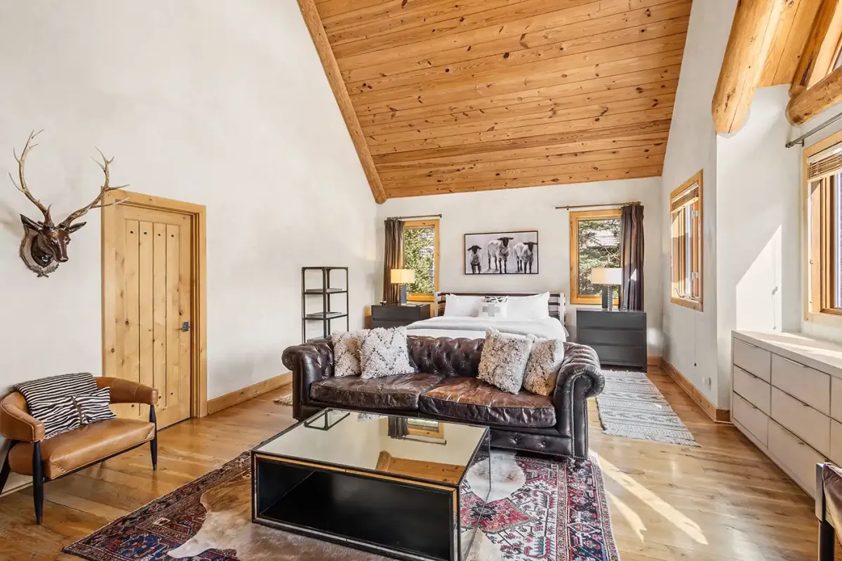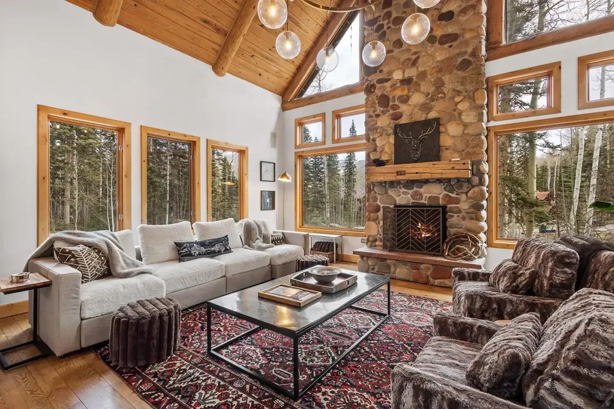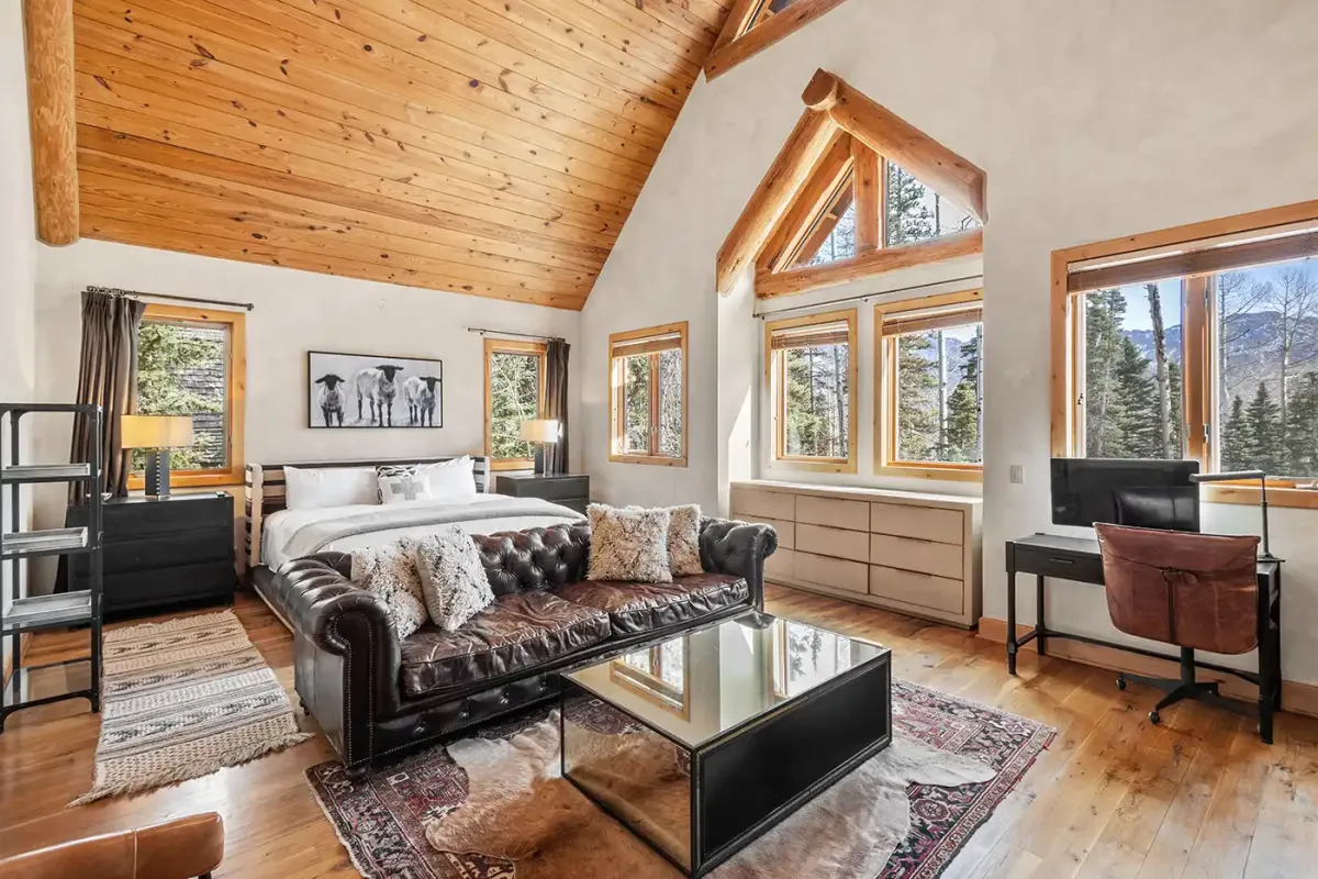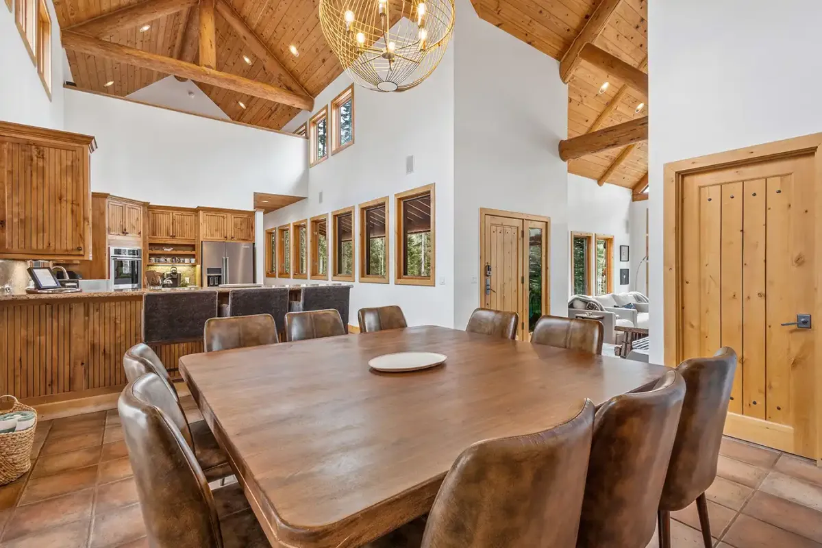 Step inside to a welcoming, light-filled interior where vaulted ceilings and expansive windows frame beautiful views of the San Sophia Range. The sunken living room invites you to unwind with a customizable Lovesac sectional, oversized loungers, cozy armchairs, and a large flat-screen TV—all centered around a stunning stone fireplace. It’s the perfect place to gather after a day of skiing, hiking, or exploring.