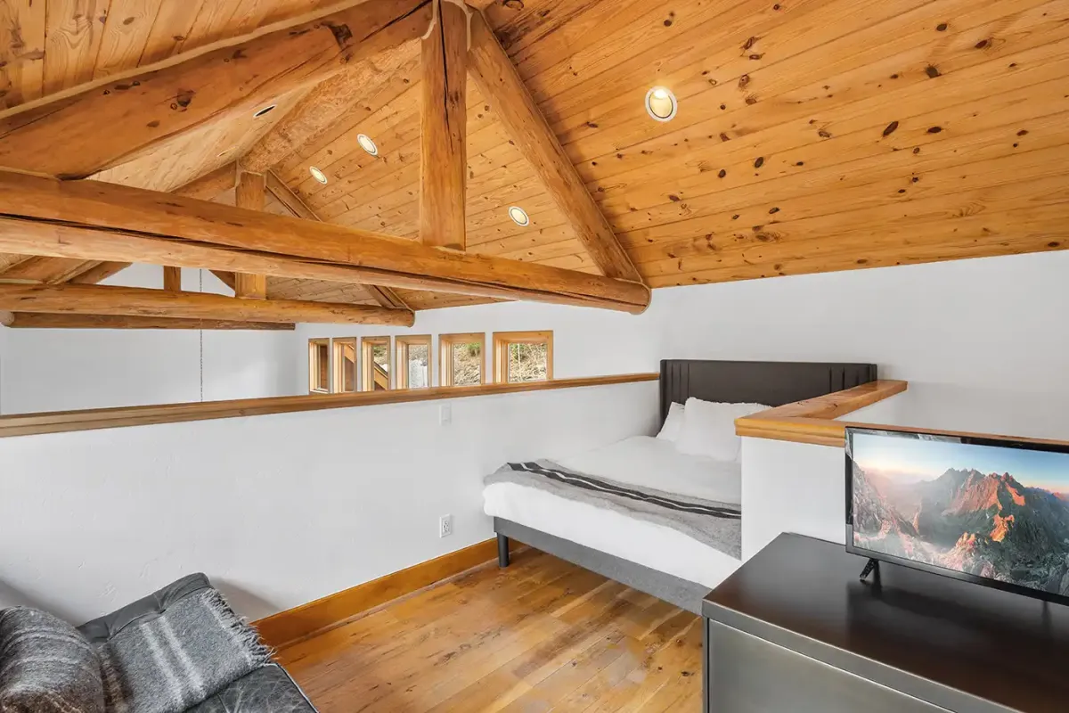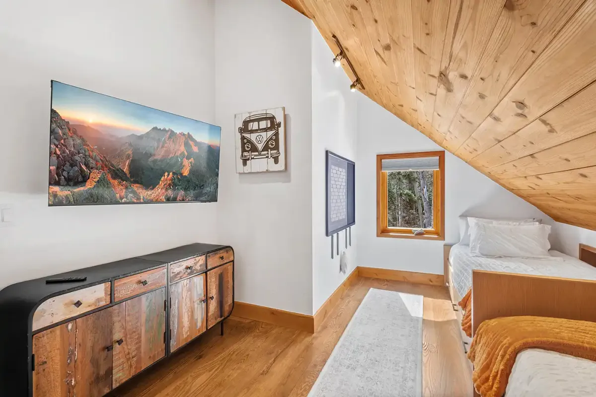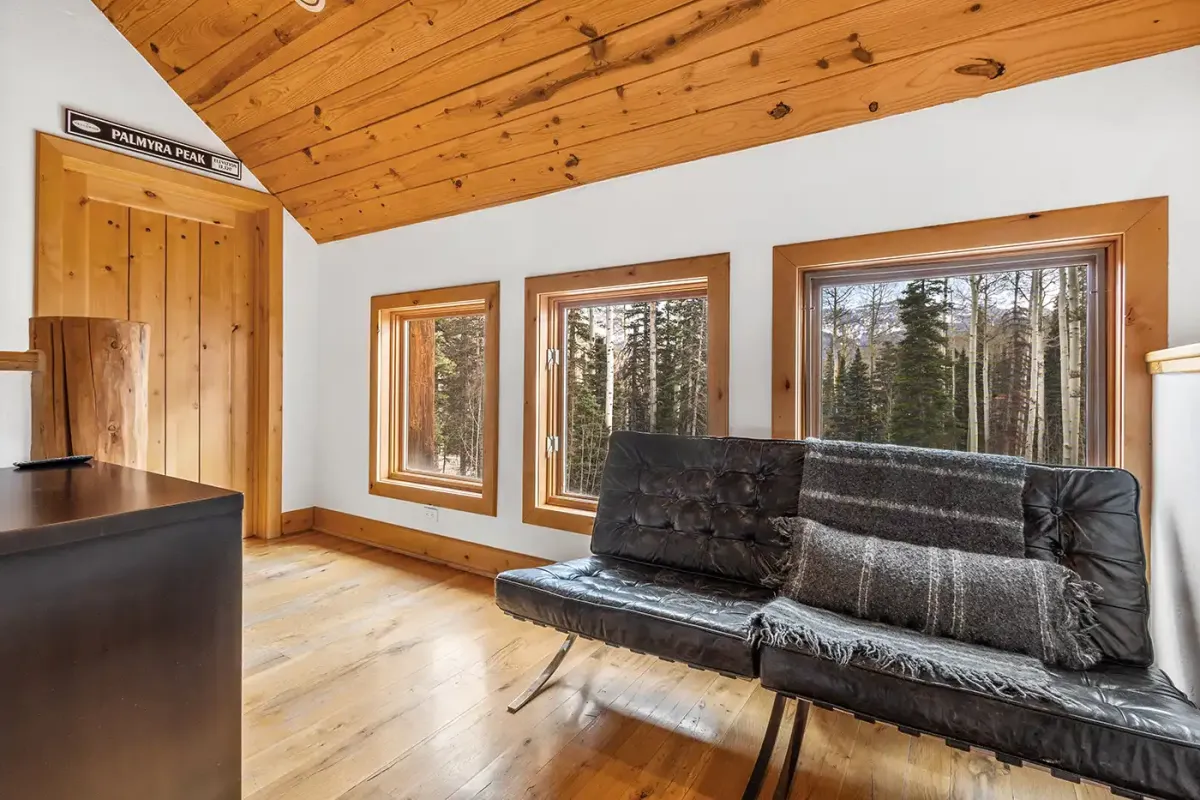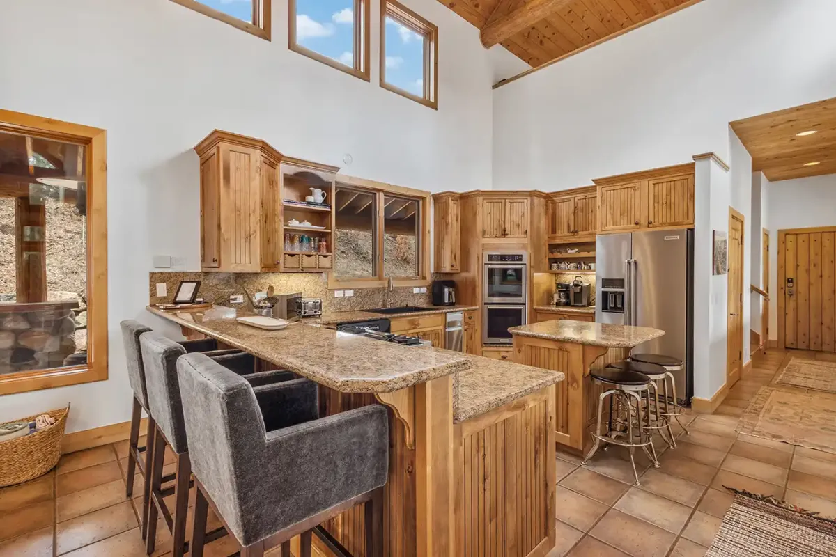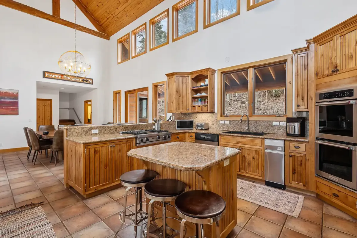 Step inside to a welcoming, light-filled interior where vaulted ceilings and expansive windows frame beautiful views of the San Sophia Range. The sunken living room invites you to unwind with a customizable Lovesac sectional, oversized loungers, cozy armchairs, and a large flat-screen TV—all centered around a stunning stone fireplace. It’s the perfect place to gather after a day of skiing, hiking, or exploring.