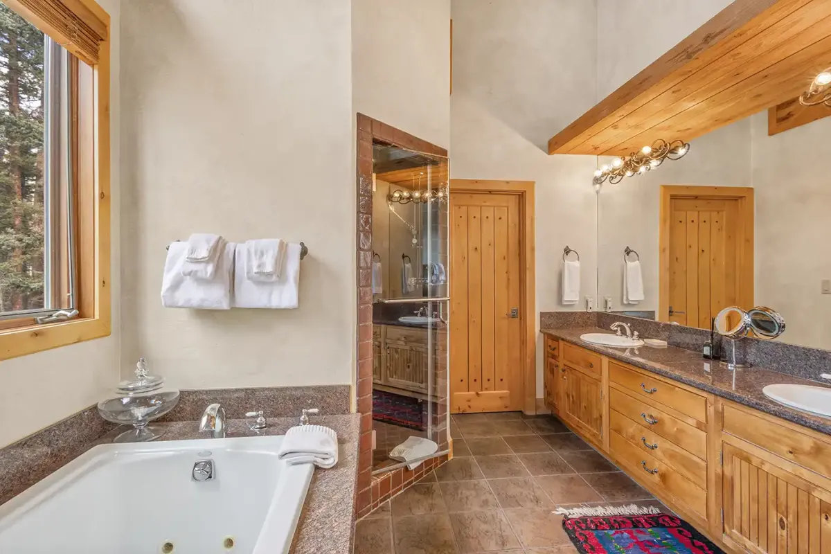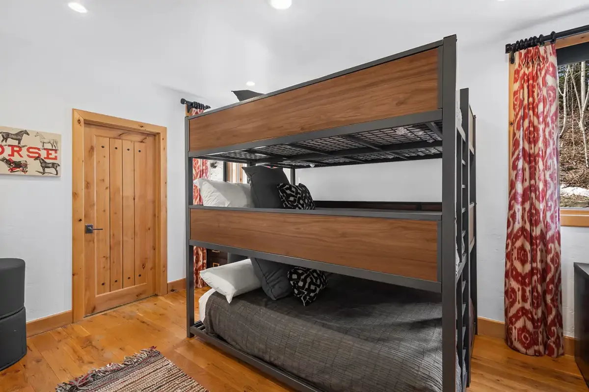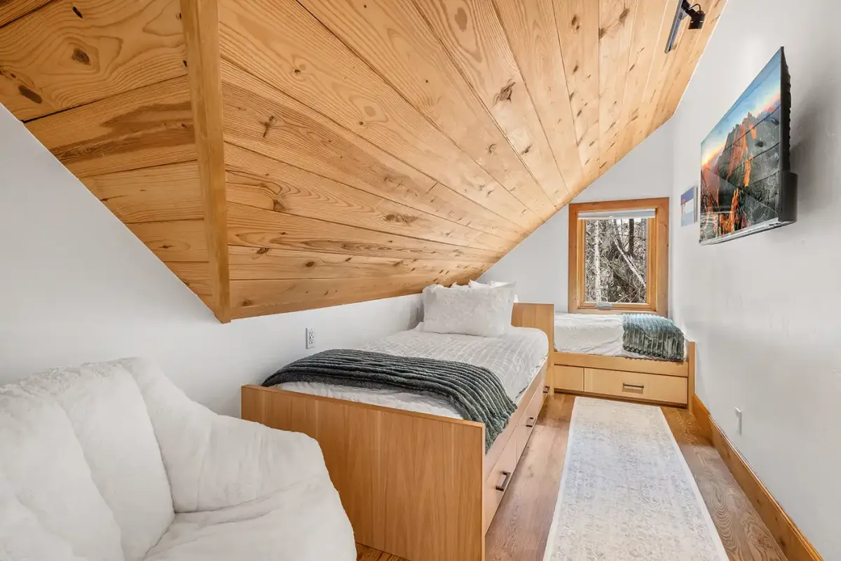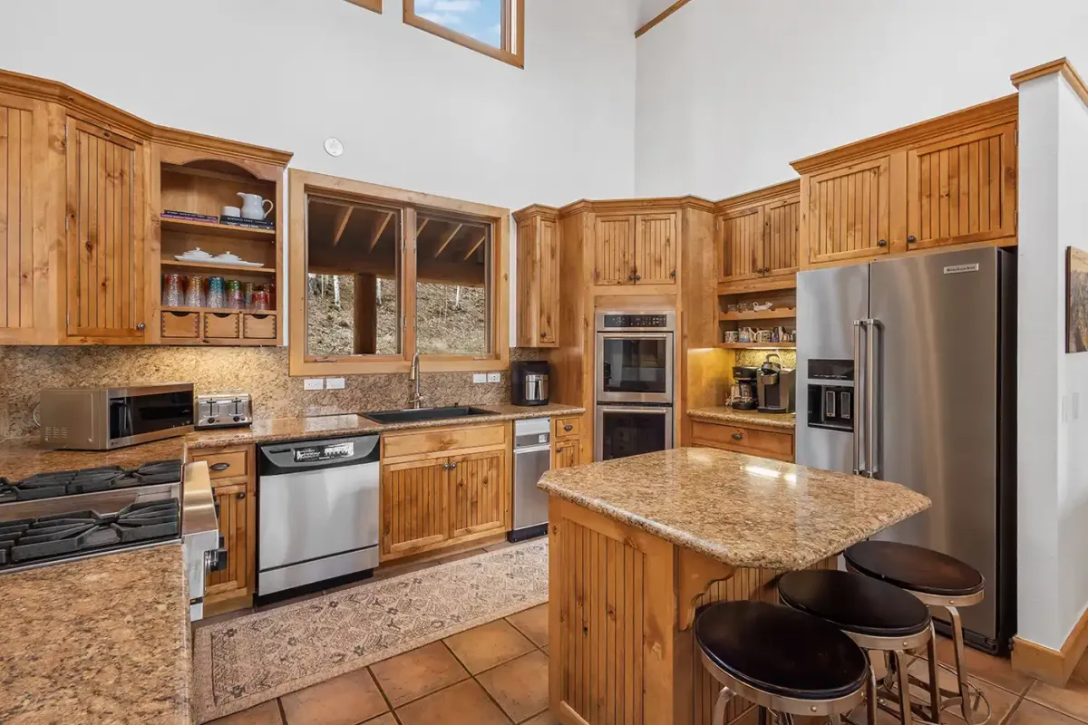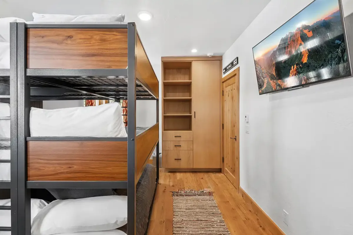 Step inside to a welcoming, light-filled interior where vaulted ceilings and expansive windows frame beautiful views of the San Sophia Range. The sunken living room invites you to unwind with a customizable Lovesac sectional, oversized loungers, cozy armchairs, and a large flat-screen TV—all centered around a stunning stone fireplace. It’s the perfect place to gather after a day of skiing, hiking, or exploring.