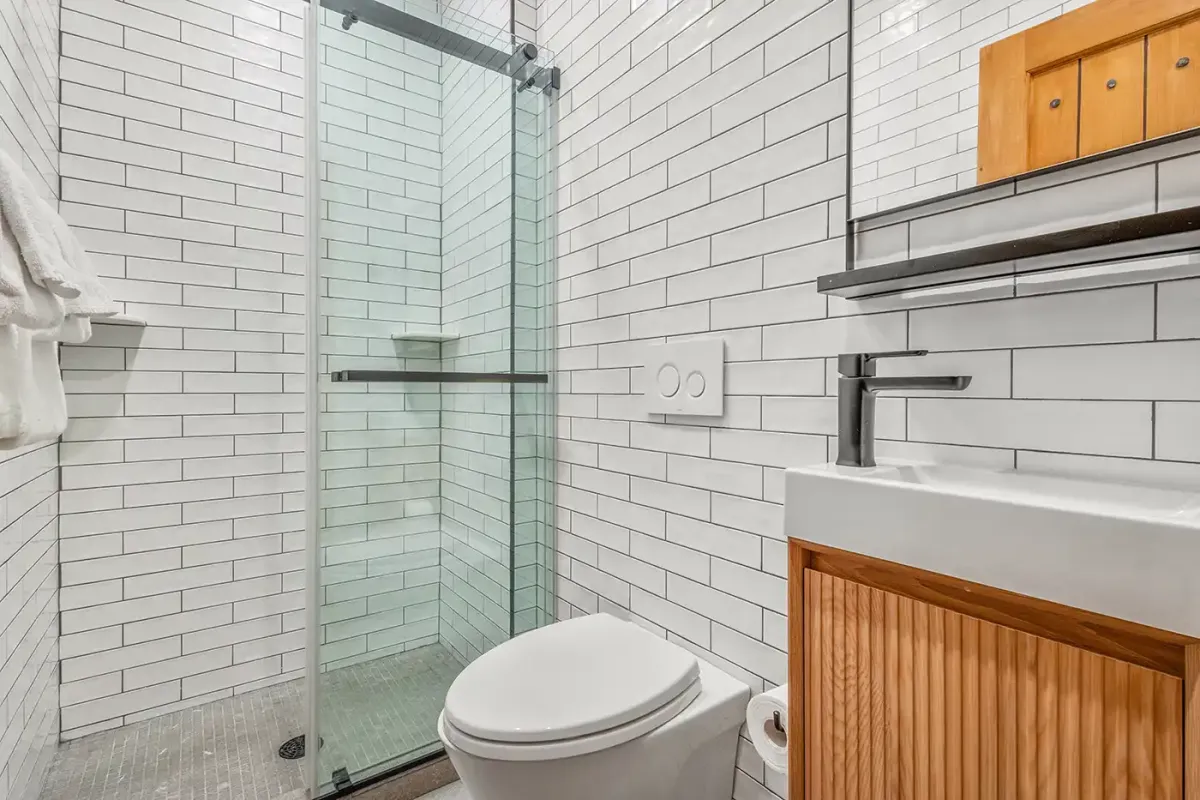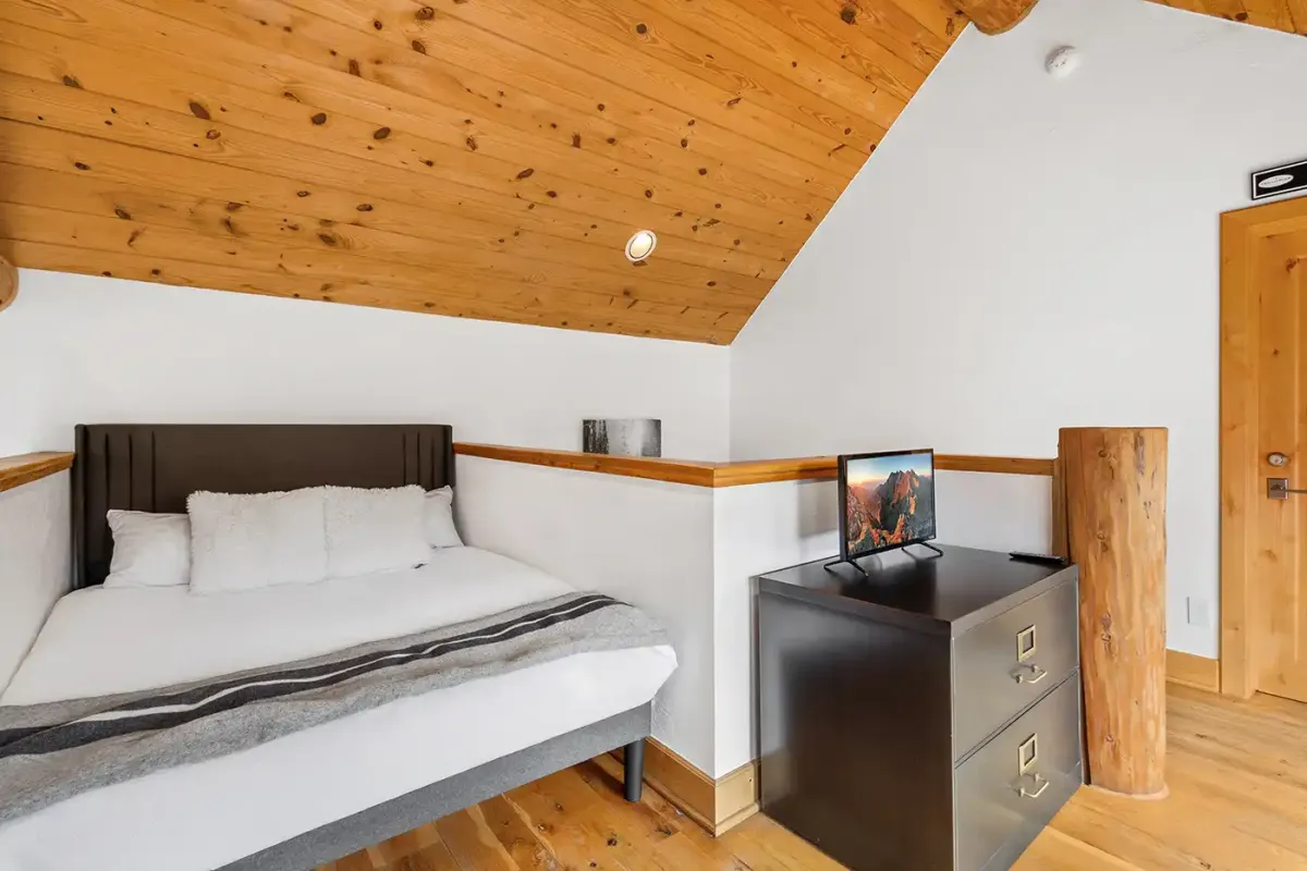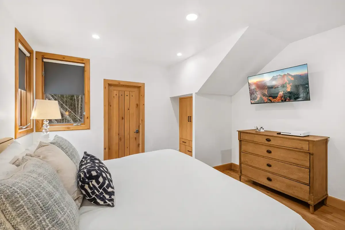 Tucked away for privacy, the primary suite offers a peaceful retreat with a king bed, cozy seating area, flat-screen TV, and a dedicated workspace complete with an Apple monitor—ideal for remote work. The en suite bathroom features a deep soaking tub, glass shower, and dual vanity, creating a spa-like experience at home.