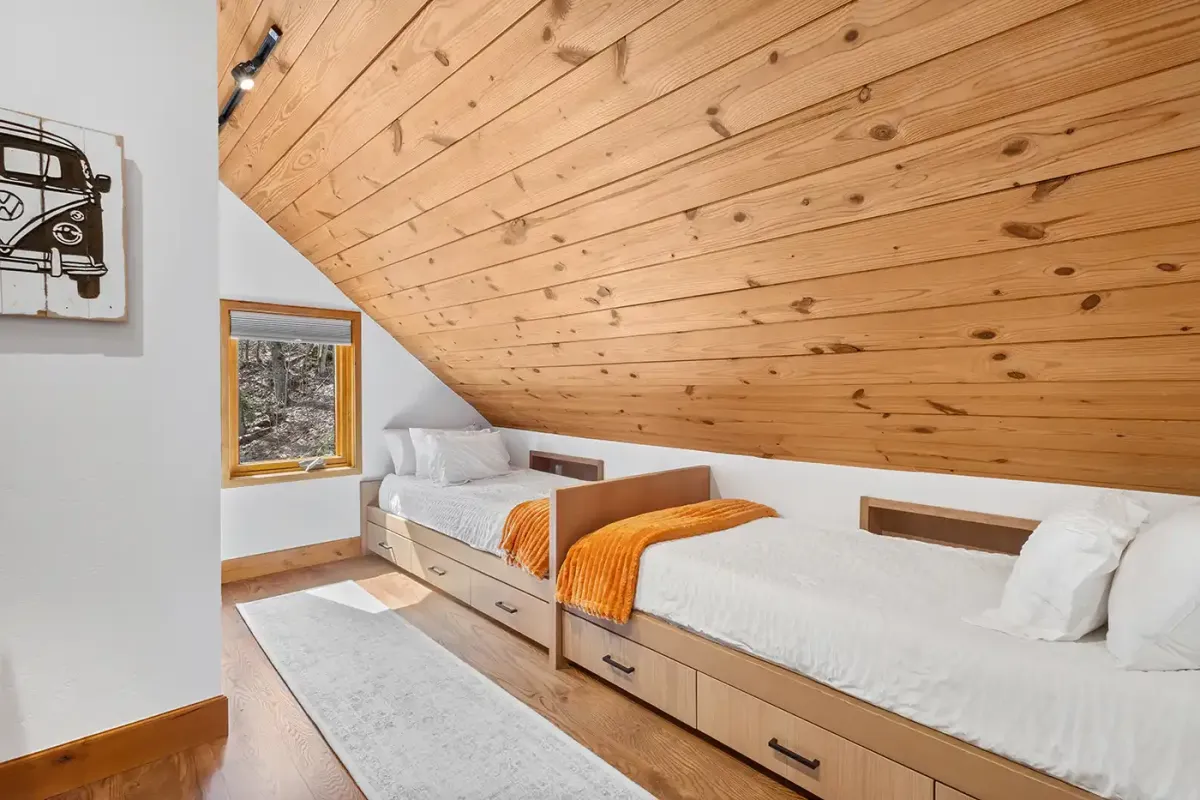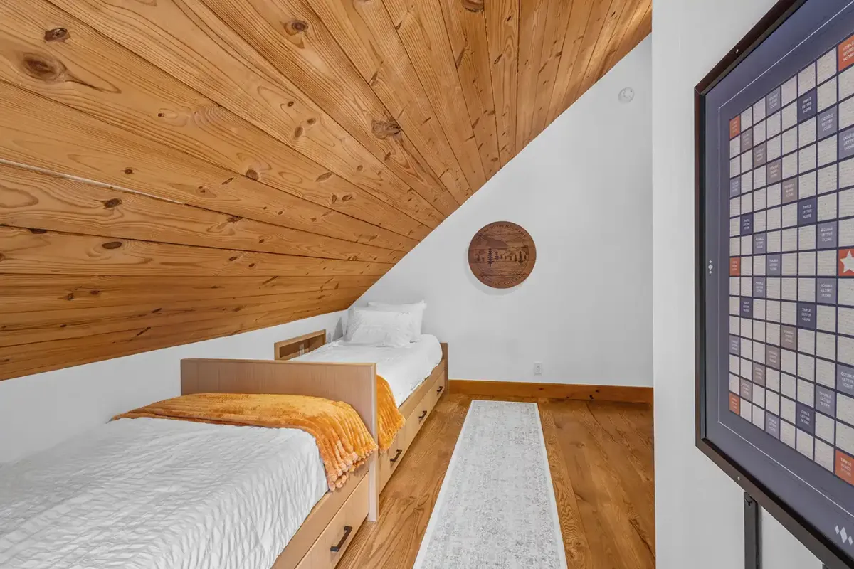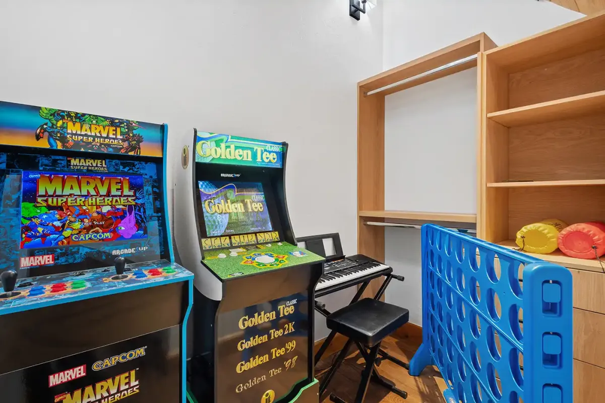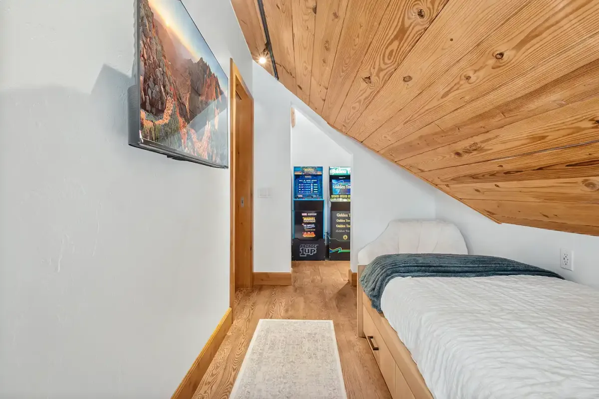 Additional bedrooms are thoughtfully designed for both comfort and flexibility. A bunk room with three full-size beds, a flat screen TV, and a private en suite is perfect for kids or group stays, while another king bedroom on the main level offers its own en suite bath. Upstairs, two additional bedrooms each feature twin beds and flat-screen TVs, sharing a newly updated bathroom. One of these rooms includes a fun bonus game area with arcade games and a giant Connect 4, creating a built-in space for entertainment.