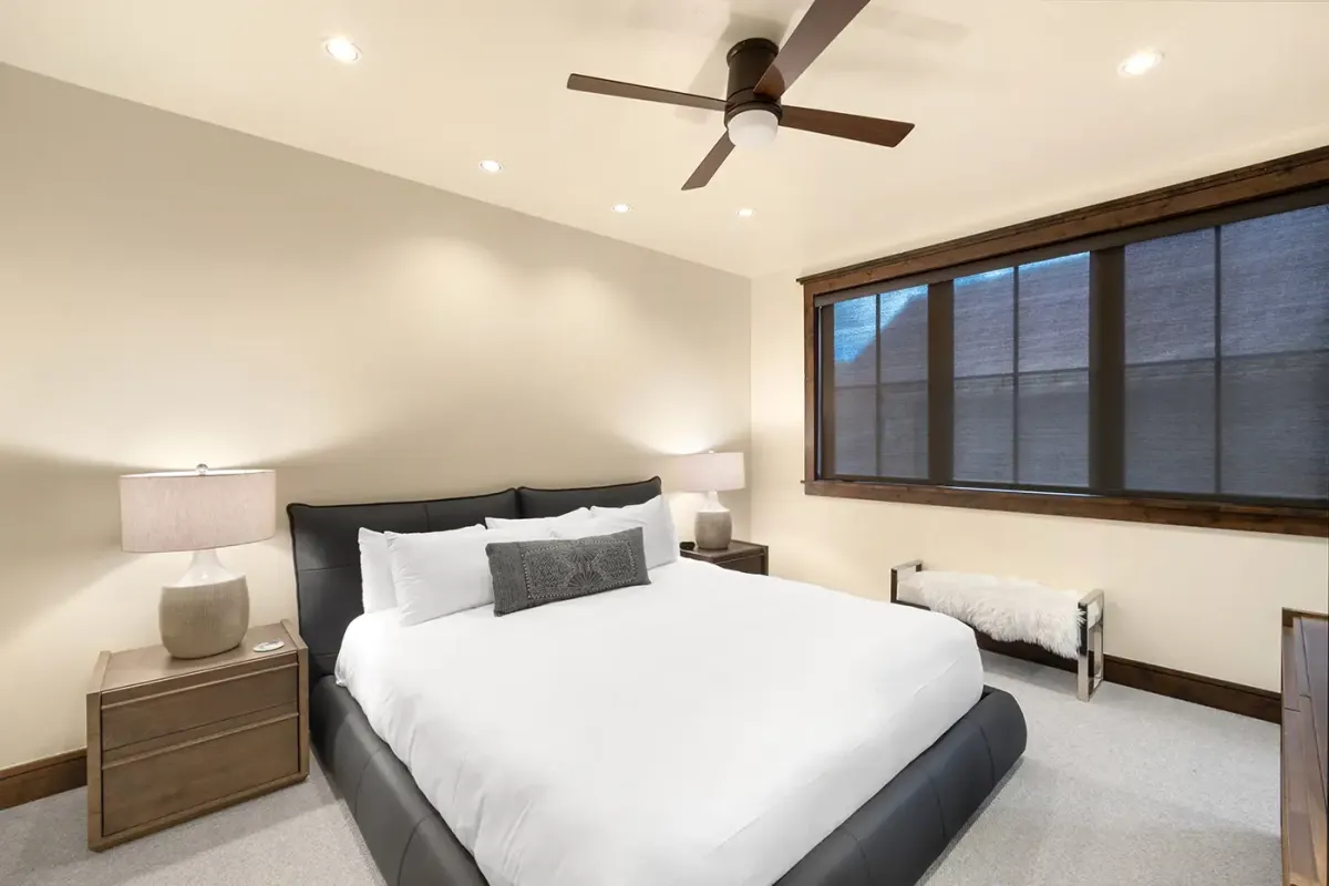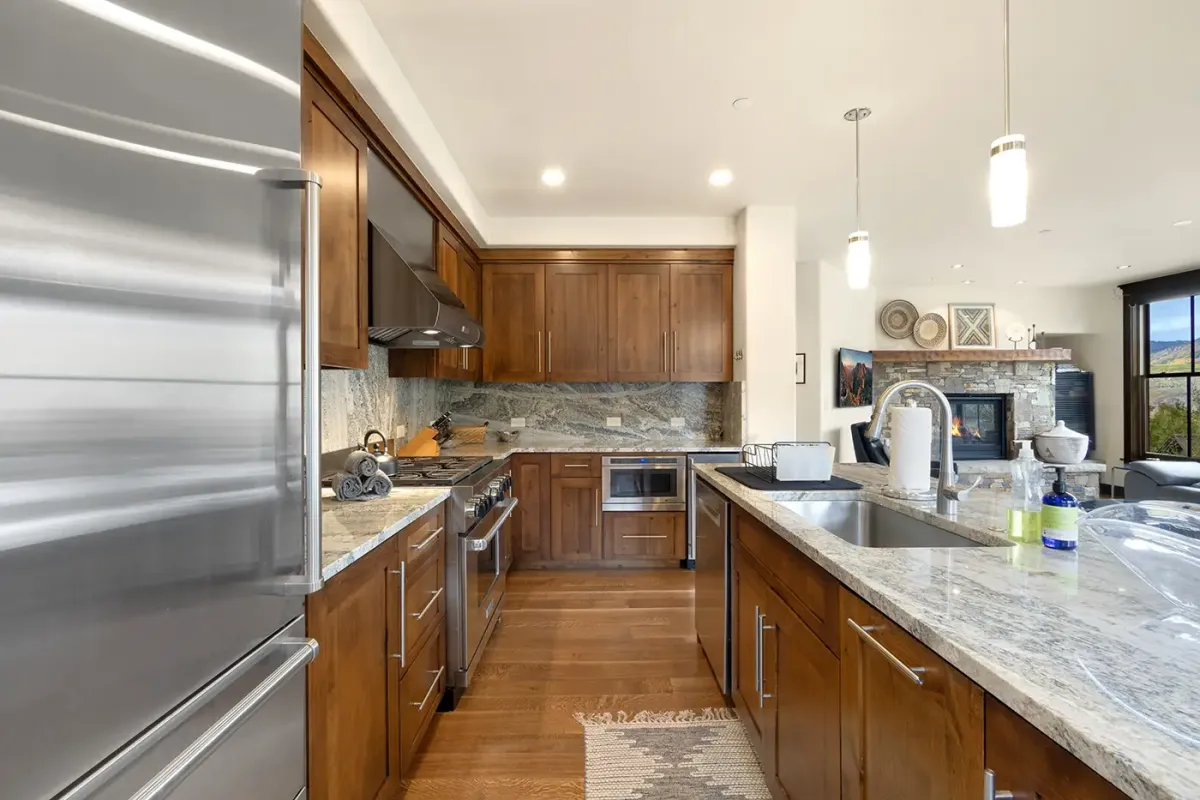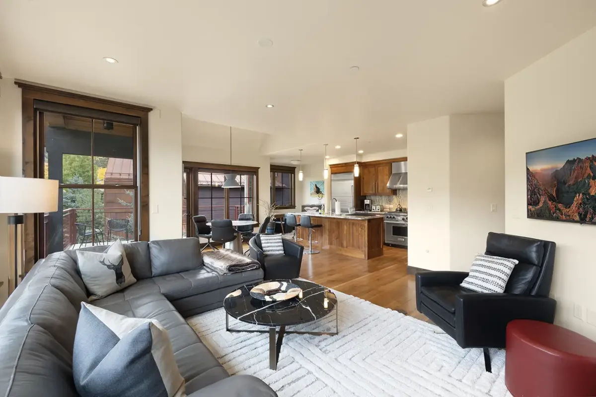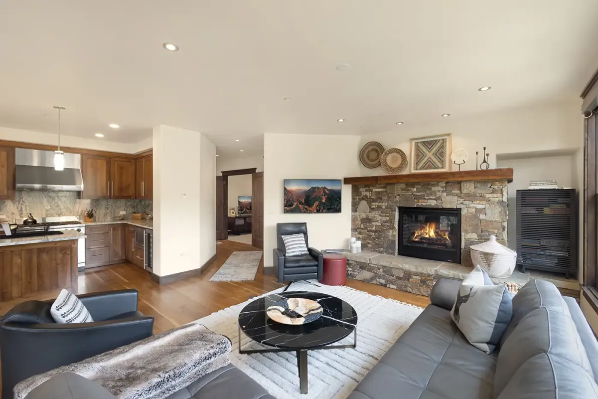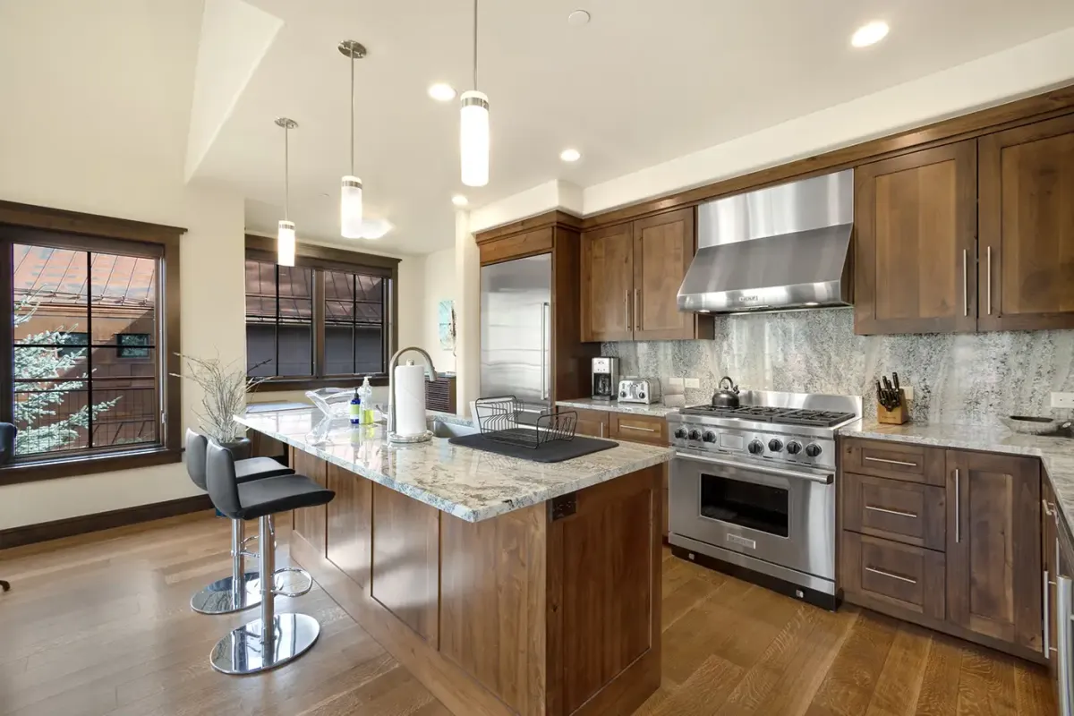 The open-concept great room welcomes you with soaring windows that fill the home with natural light and showcase views of the surrounding peaks. A plush sofa, cozy fireplace, and warm modern décor create the perfect gathering space after a day on the mountain. The adjacent dining area seats four, while the fully equipped kitchen features stainless steel appliances, granite countertops, and a large island with seating for three—ideal for both casual breakfasts and intimate dinners.