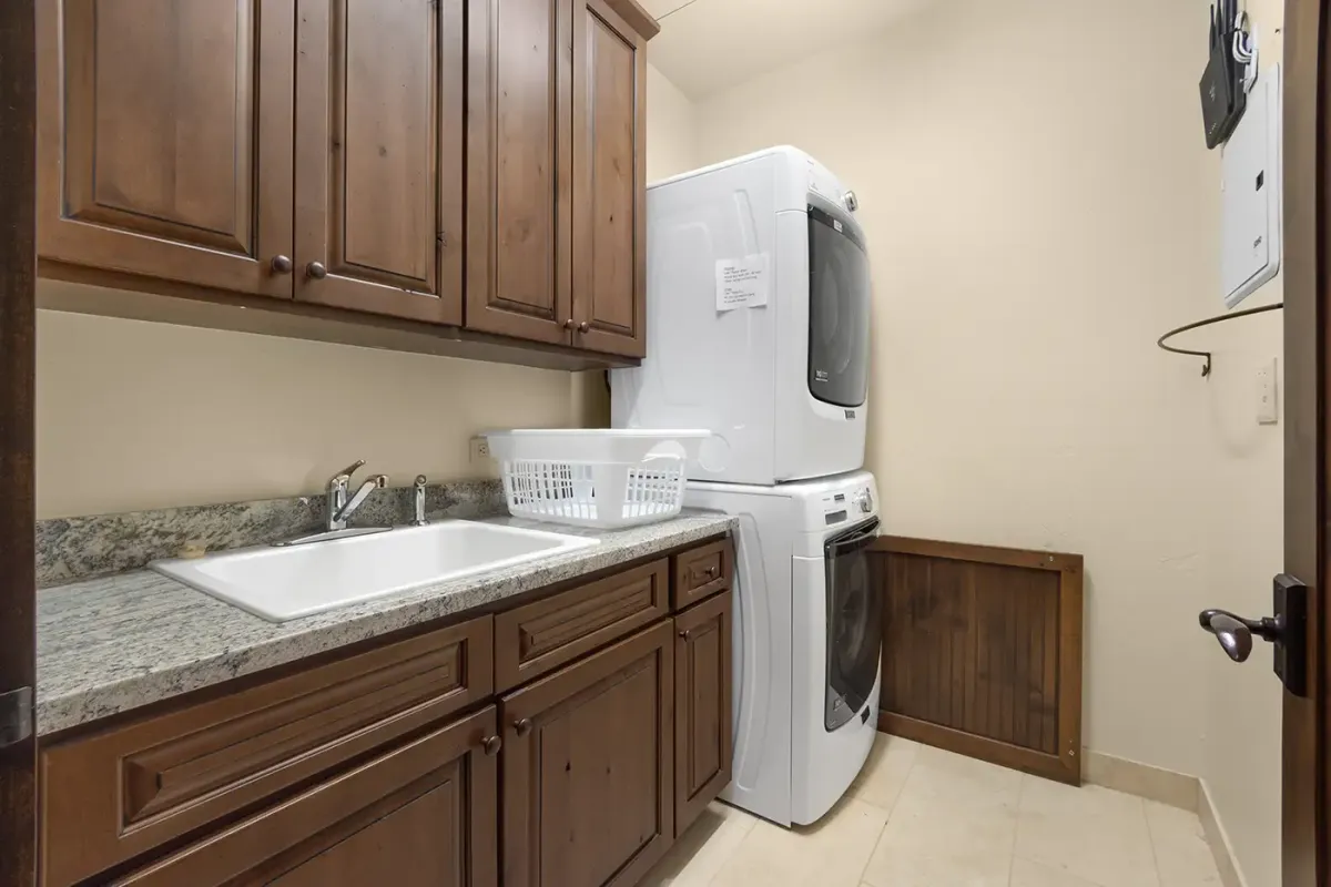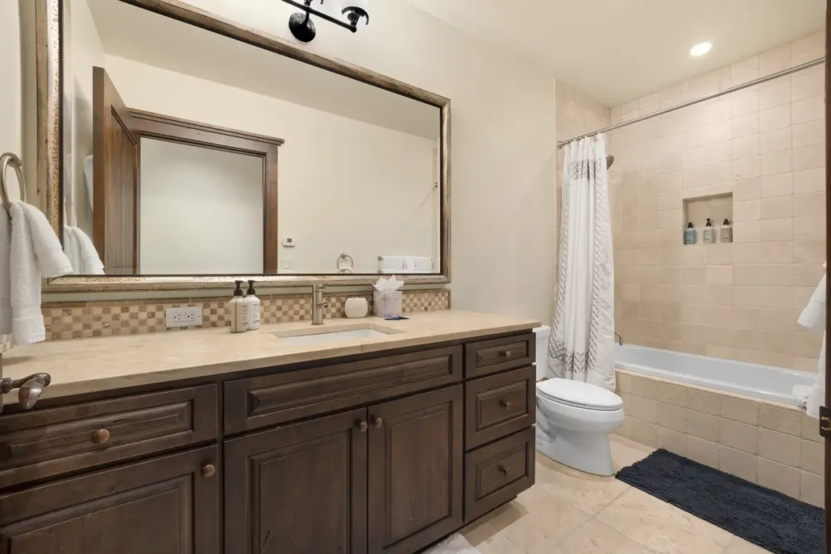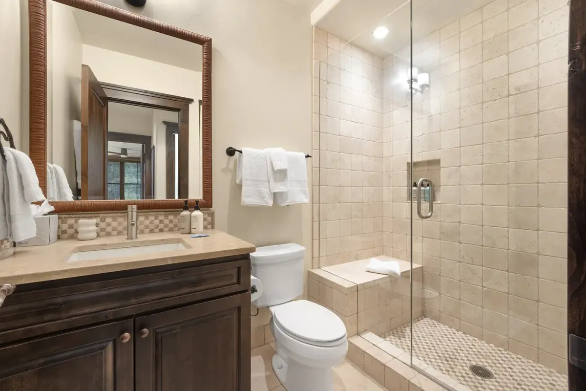 The Primary Suite is a tranquil haven, complete with a king-size bed and a spa-inspired en suite bathroom featuring dual vanities, a soaking tub, and a separate glass shower. Two additional guest suites provide comfort and flexibility: one with a split king that can convert into twin beds, and another with a queen sleeper sofa. Each suite enjoys its own full bathroom, offering privacy and convenience for families or groups traveling together.