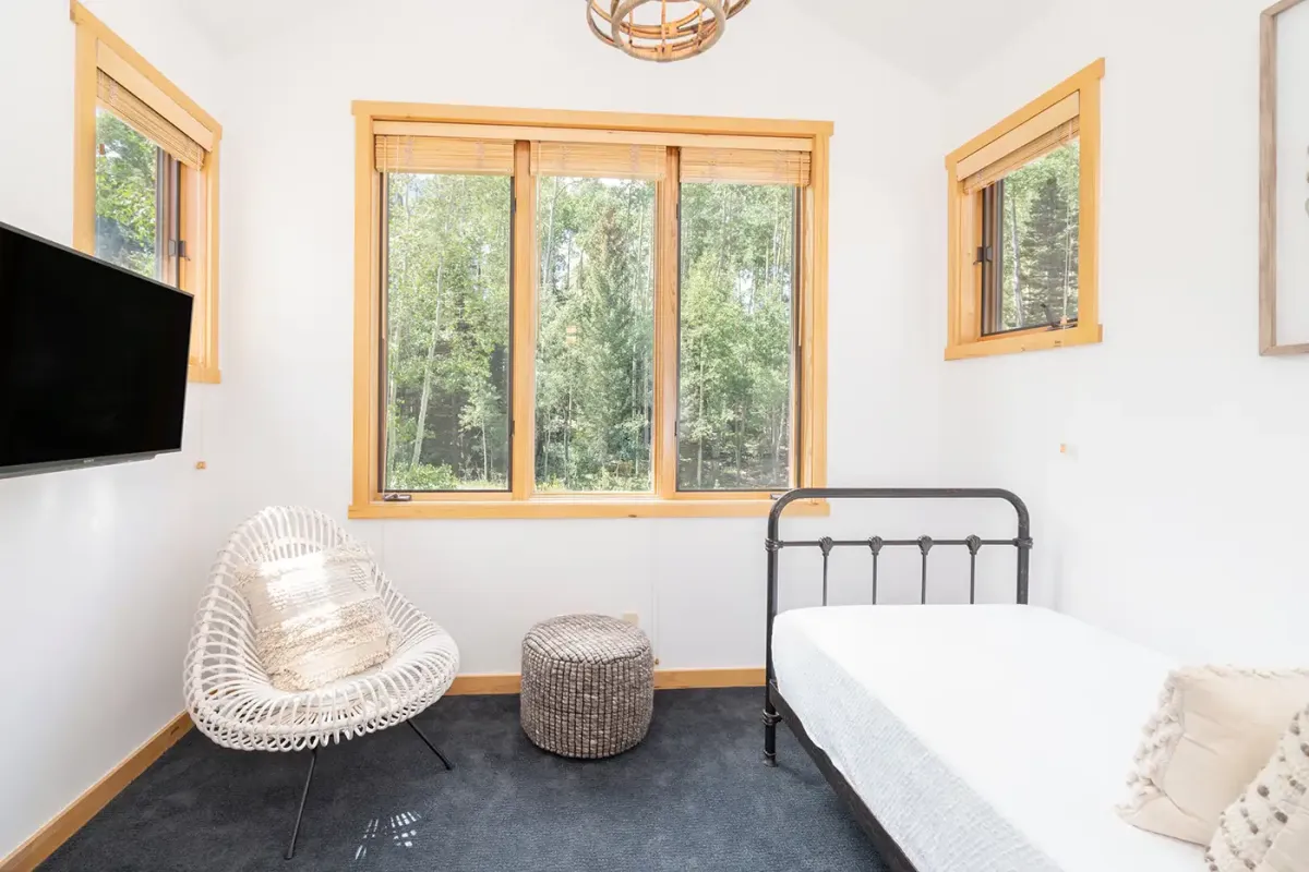 As you go down the stairs the second level has another beautiful living area to allow for some space with larger groups complete with a full sectional, TV, wet bar and beautiful fireplace with a floor to ceiling black and white tiles . To the right of the living area is the orange guest bedroom with two twins and farther down is the green room with a King bed and en-suite bathroom with a shower. The green room can also work as a secondary suite as it features an in the trees type feeling and a window seating area.