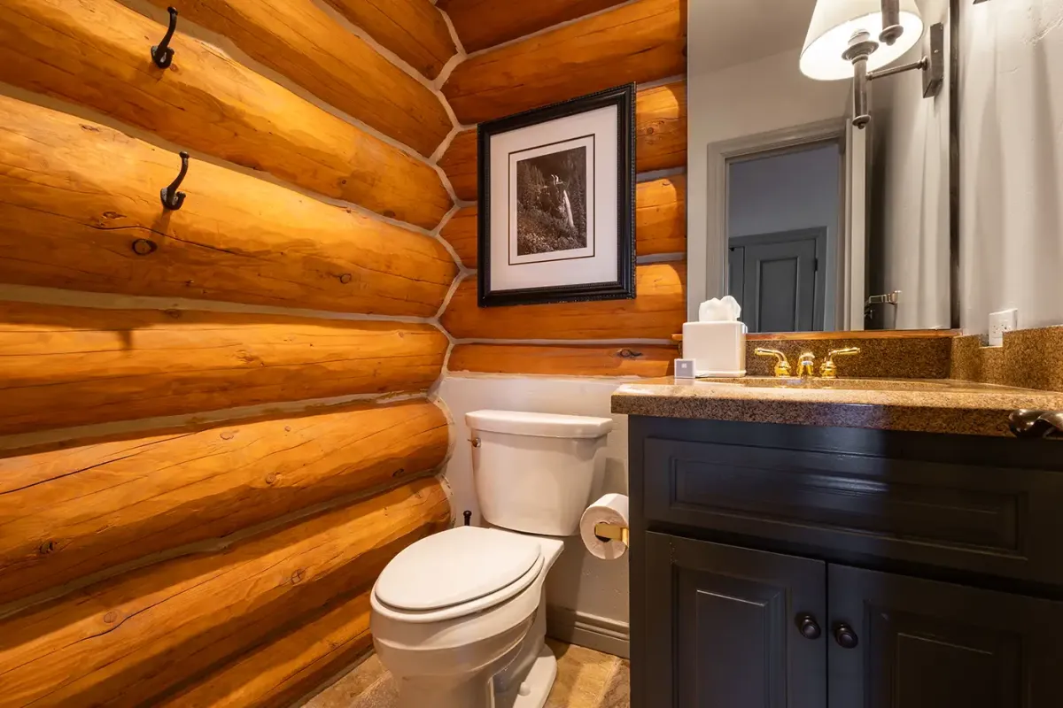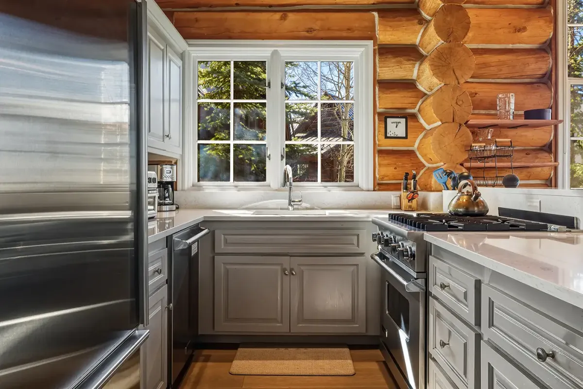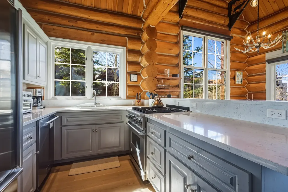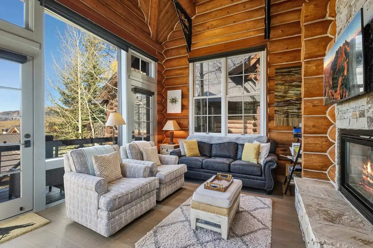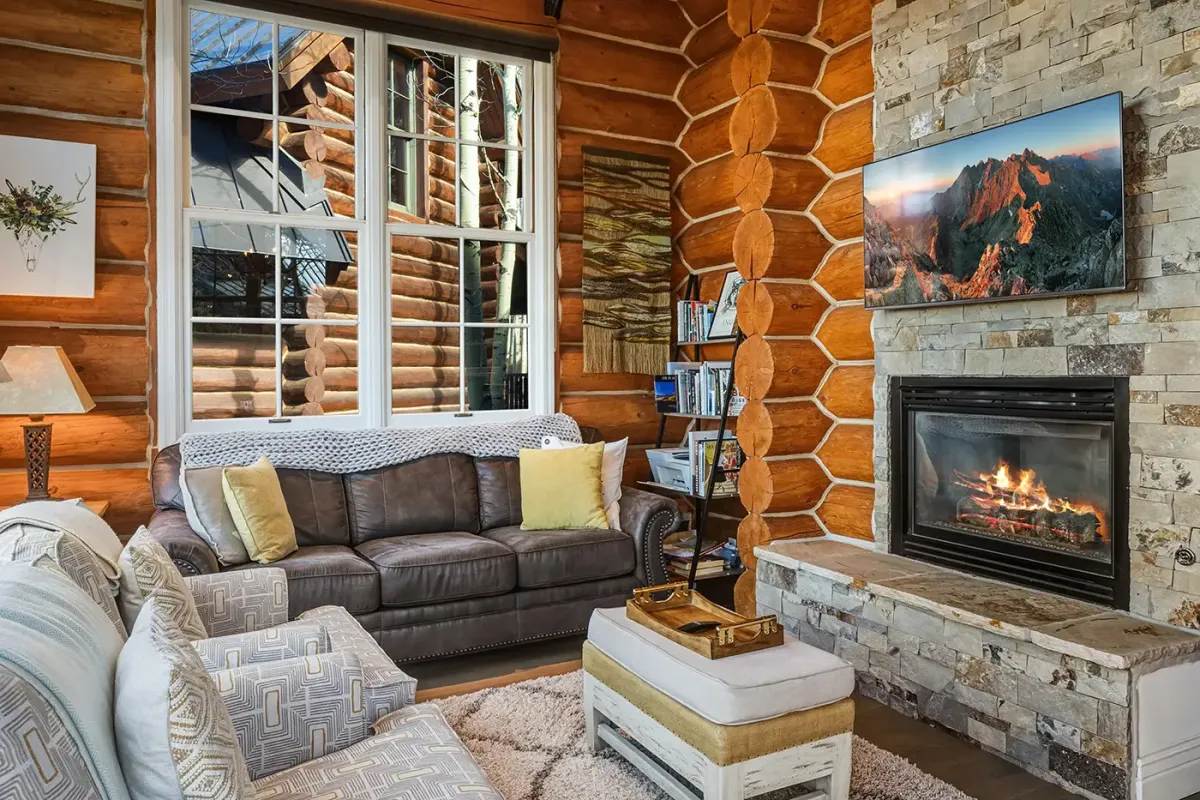 The living room invites relaxation with its cozy sofa, two armchairs, and a limestone-accented gas fireplace framed by rustic log walls and vaulted ceilings. Curl up with a good book, play a board game by the fire, or unwind with a favorite film after a day outdoors. A west-facing door opens to a private patio with seating and a grill, where you can take in stunning mountain sunsets and crisp alpine air.