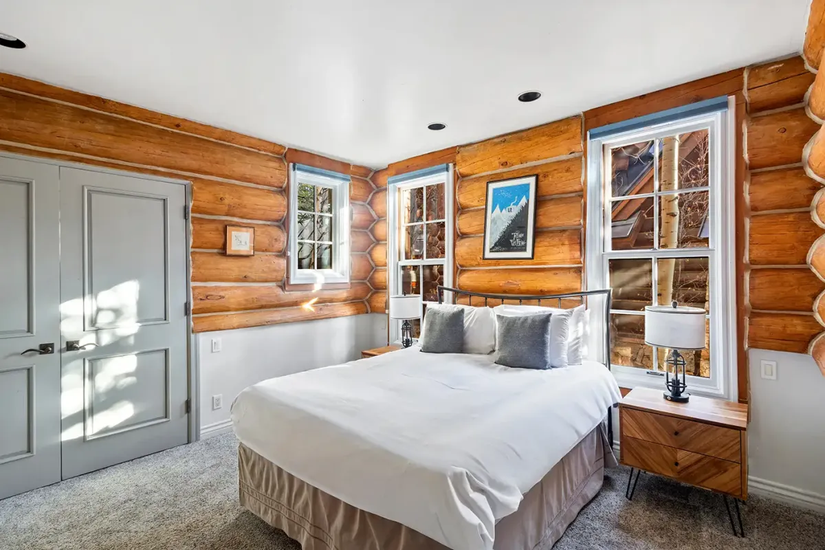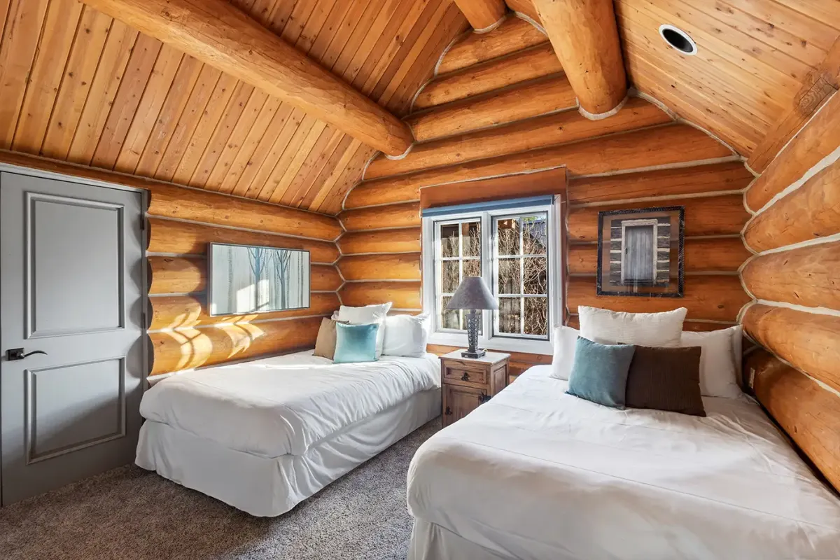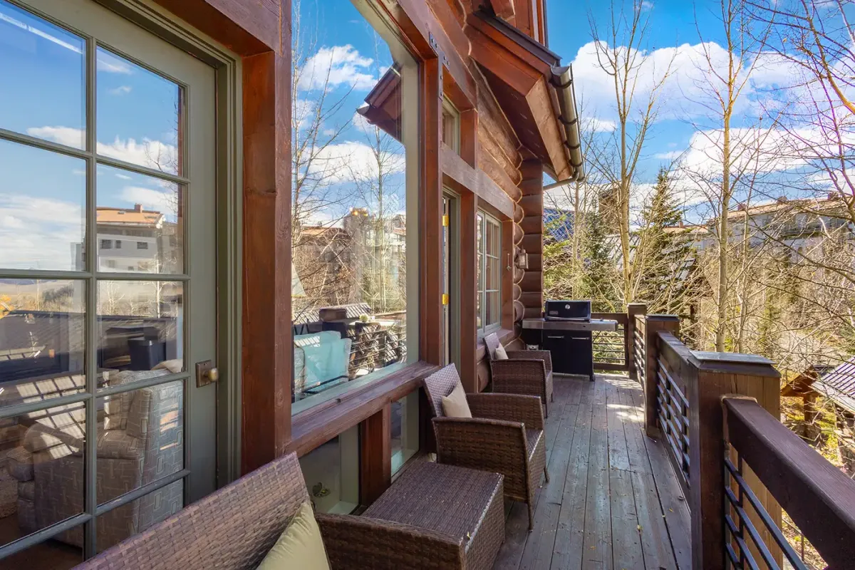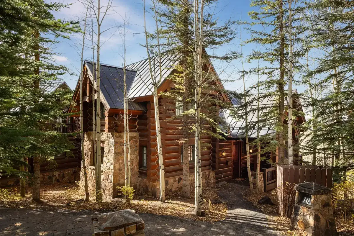 The living room invites relaxation with its cozy sofa, two armchairs, and a limestone-accented gas fireplace framed by rustic log walls and vaulted ceilings. Curl up with a good book, play a board game by the fire, or unwind with a favorite film after a day outdoors. A west-facing door opens to a private patio with seating and a grill, where you can take in stunning mountain sunsets and crisp alpine air.