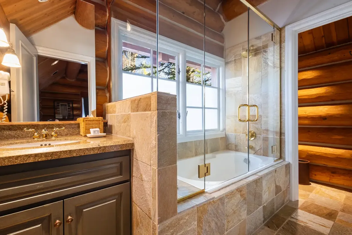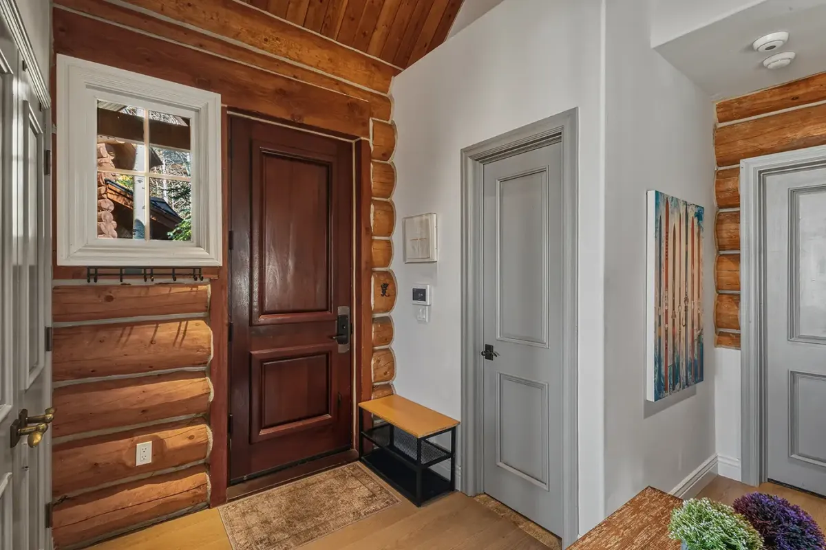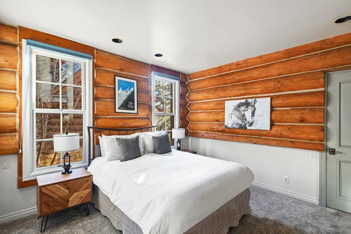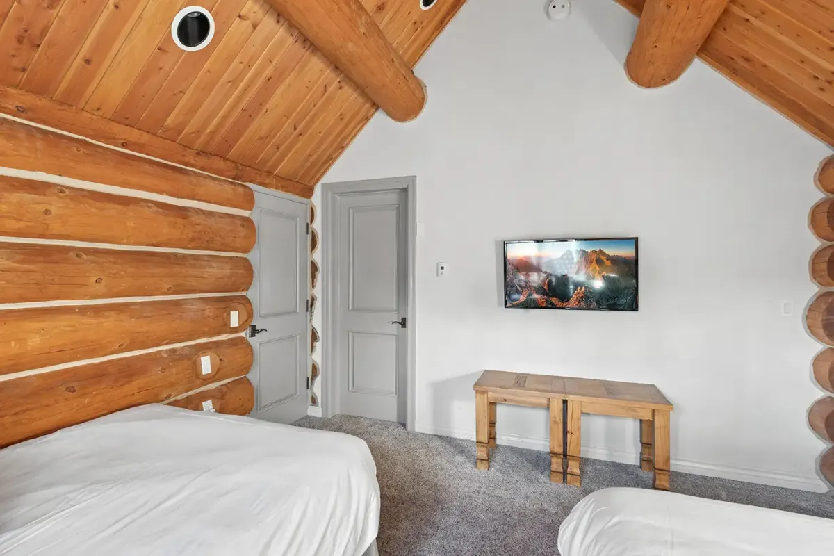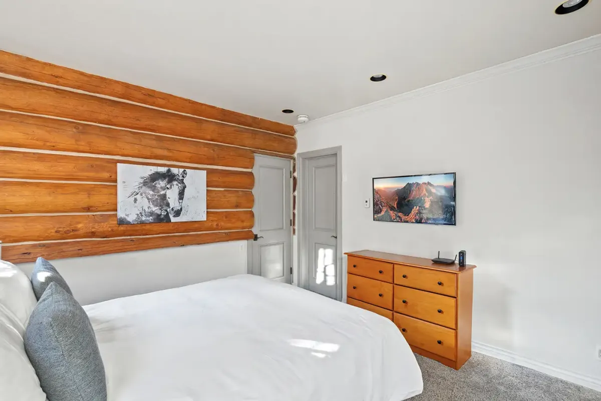 The living room invites relaxation with its cozy sofa, two armchairs, and a limestone-accented gas fireplace framed by rustic log walls and vaulted ceilings. Curl up with a good book, play a board game by the fire, or unwind with a favorite film after a day outdoors. A west-facing door opens to a private patio with seating and a grill, where you can take in stunning mountain sunsets and crisp alpine air.