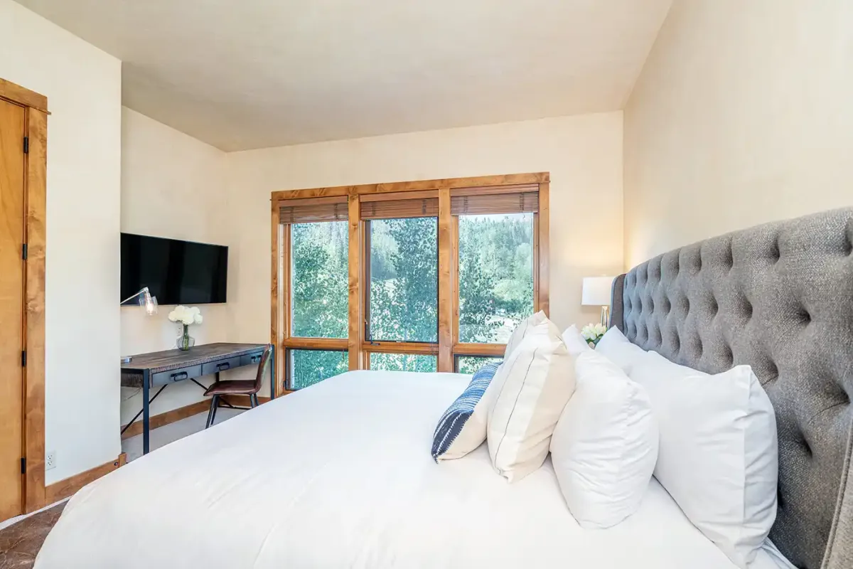 Next to the kitchen is the first guest bedroom, which is a bunk room with a full-over-full-size bunk that will delight kids of all ages. The primary bedroom is down a short hallway and includes a deluxe king-size bed, plenty of storage space, and a beautiful mountain view through the large windows. The private, ensuite bathroom includes a tub/shower combo and a double vanity.