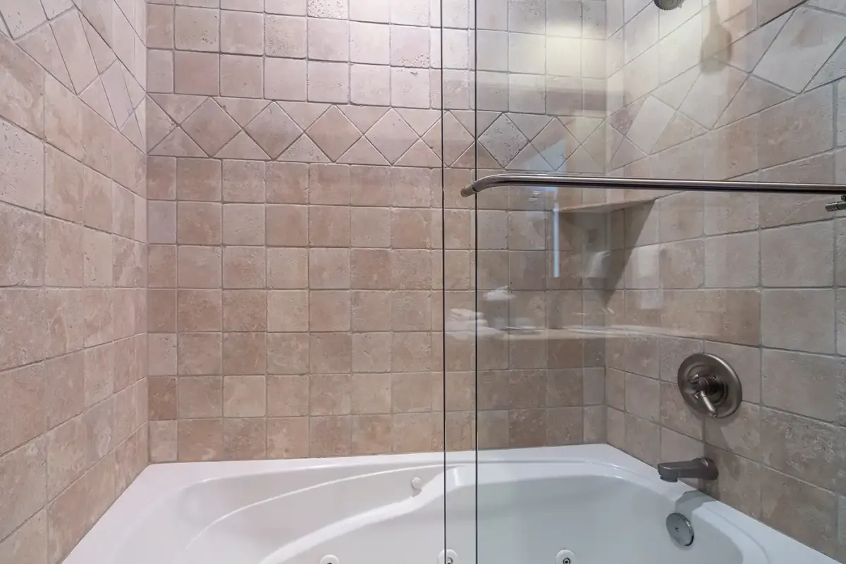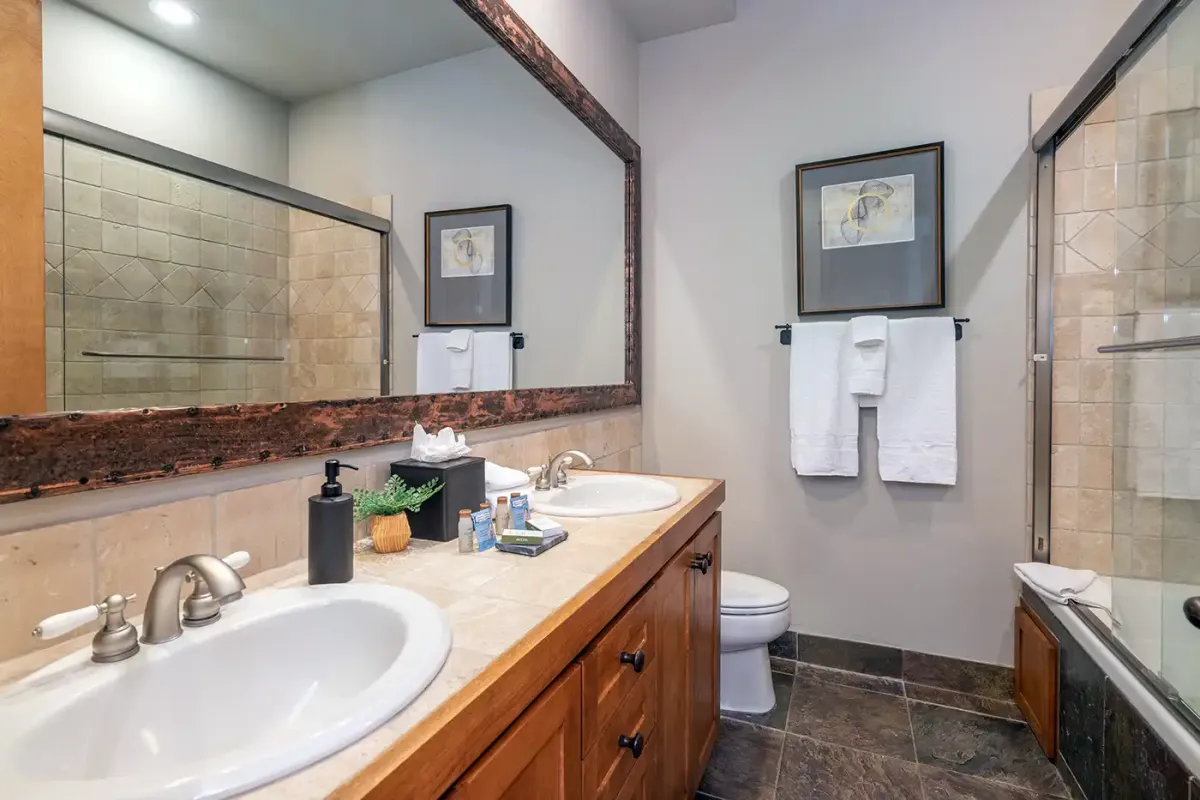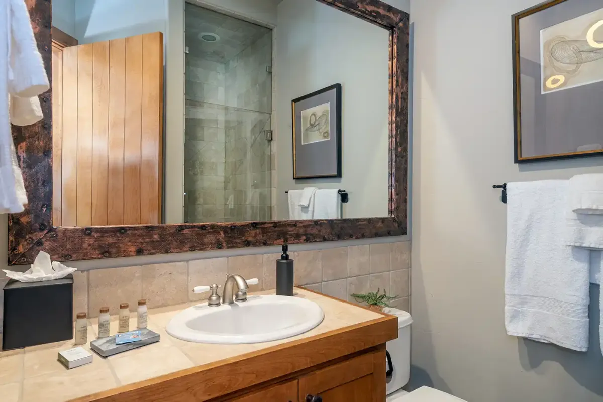 The main living area is spacious and bright, with rustic wood floors and lots of sunny windows overlooking the ski area. A leather sofa, two leather club chairs, and plenty of footrests invite you to kick back and relax, while the stone fireplace adds warmth to those chilly mountain evenings. A convenient full bathroom with a glass-enclosed shower is right around the corner.