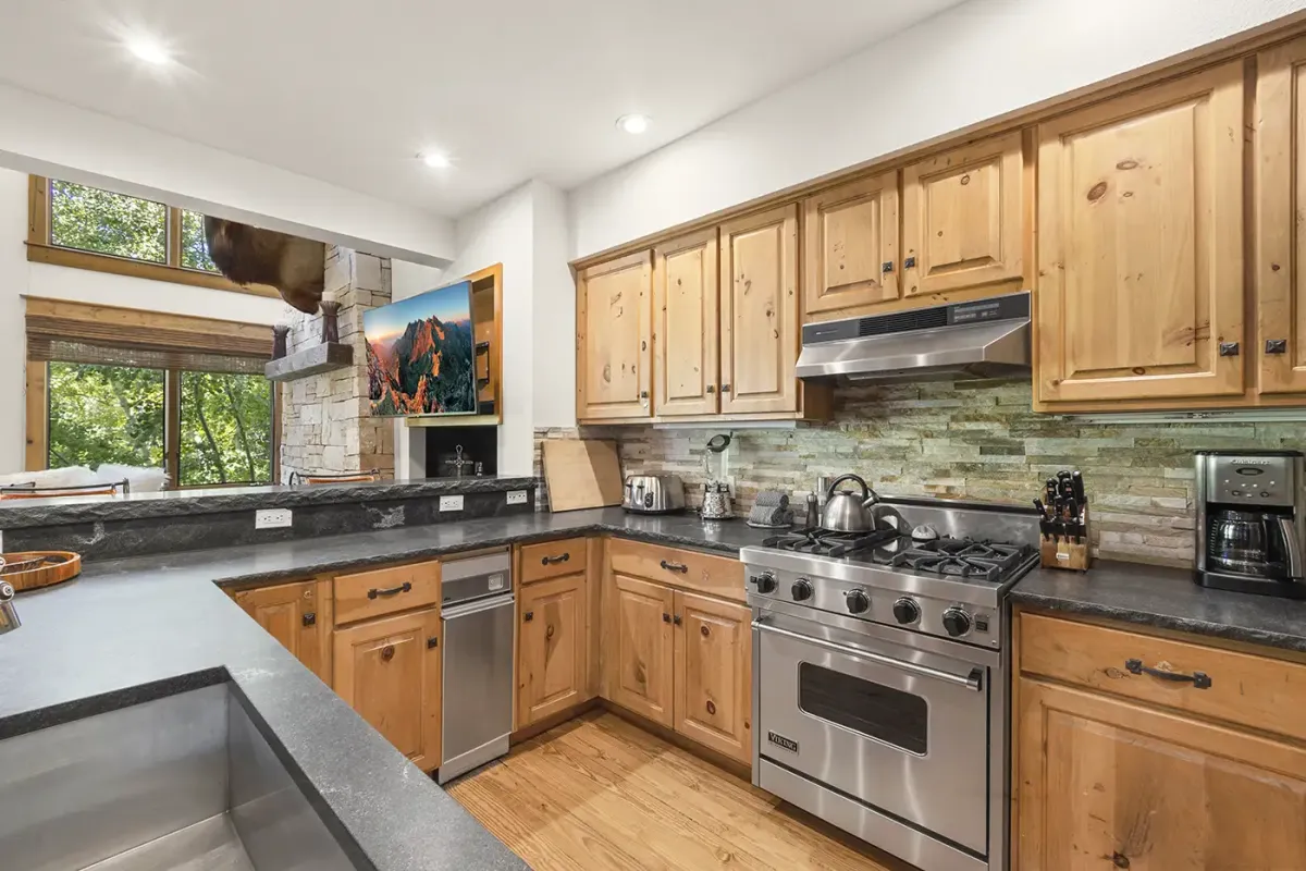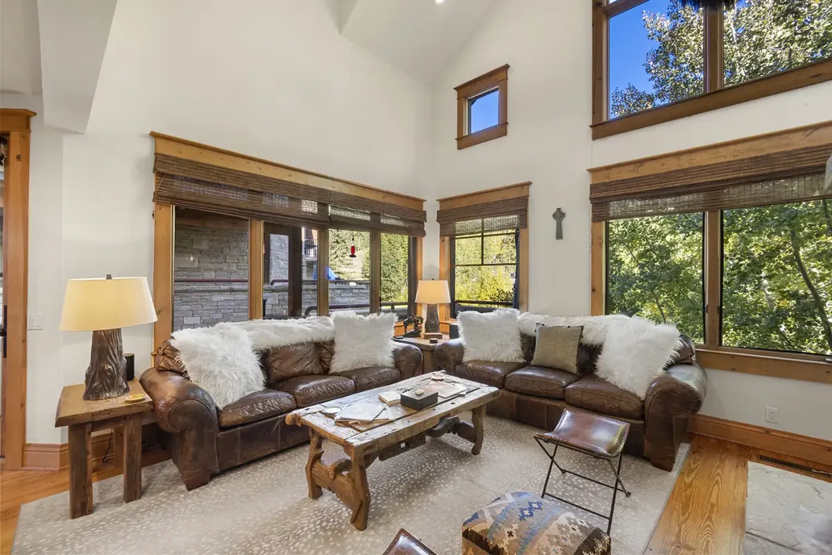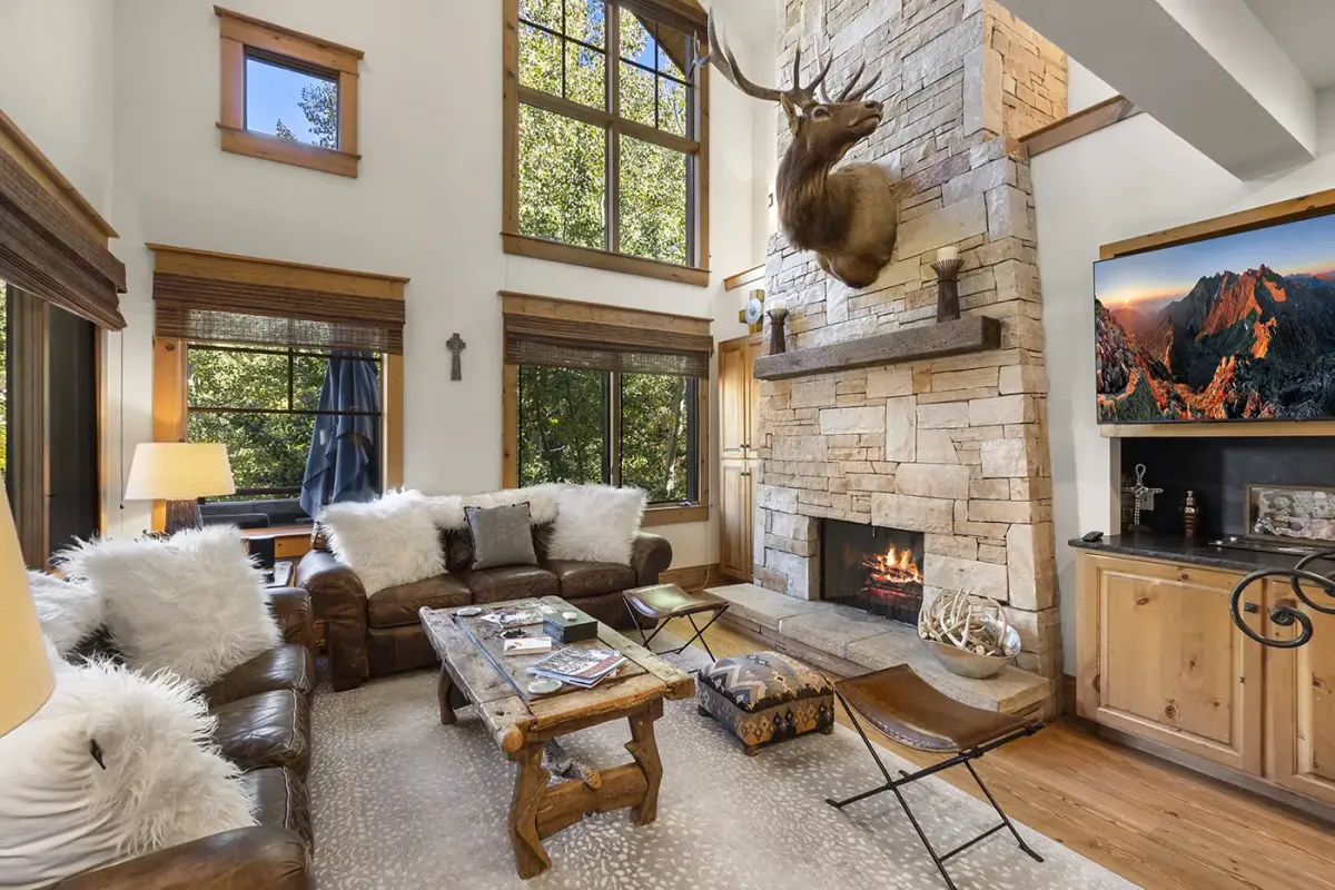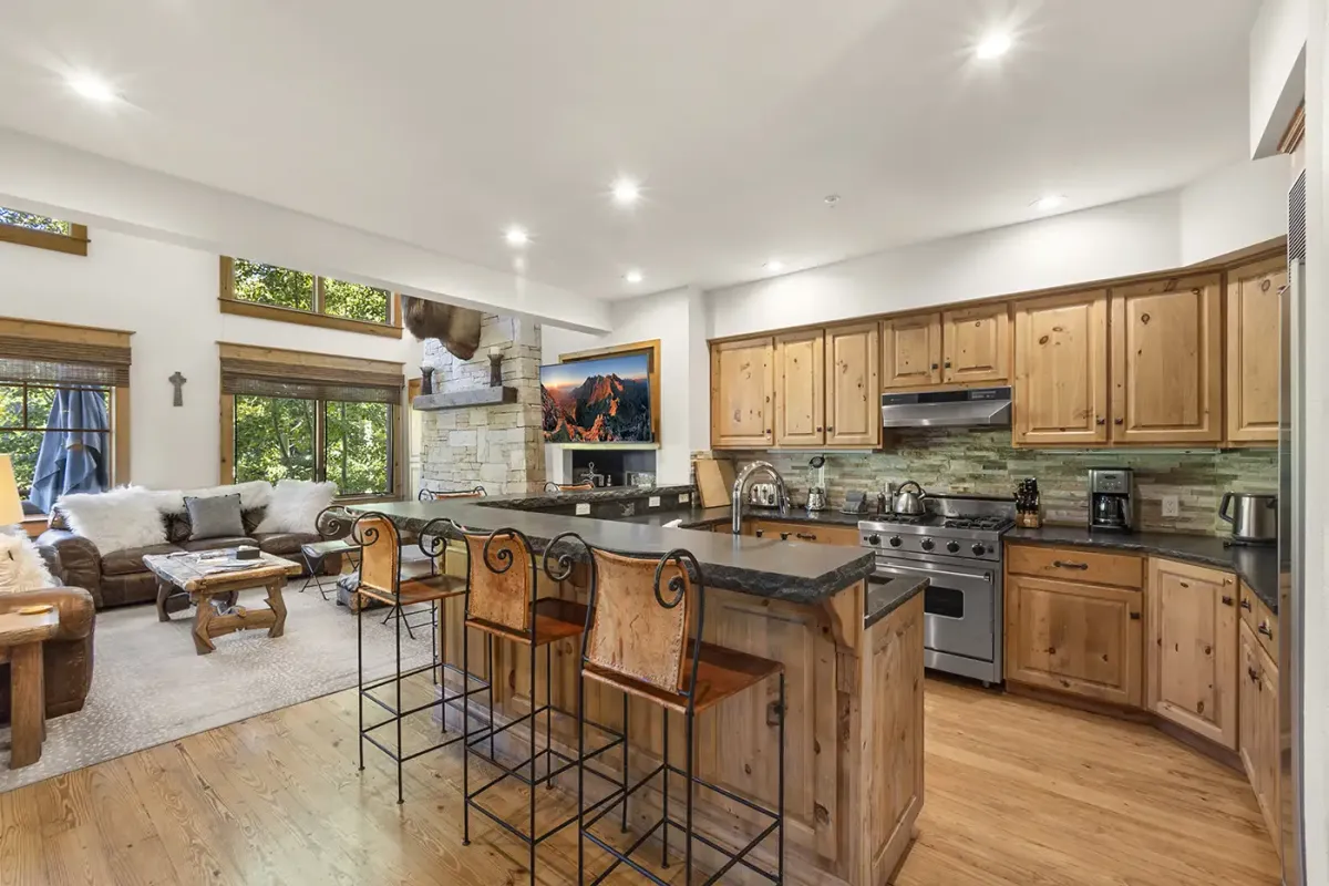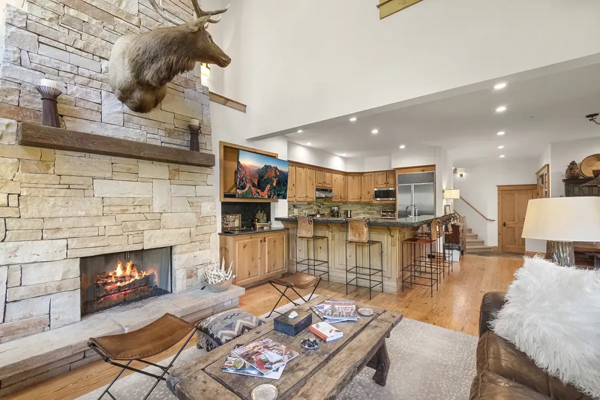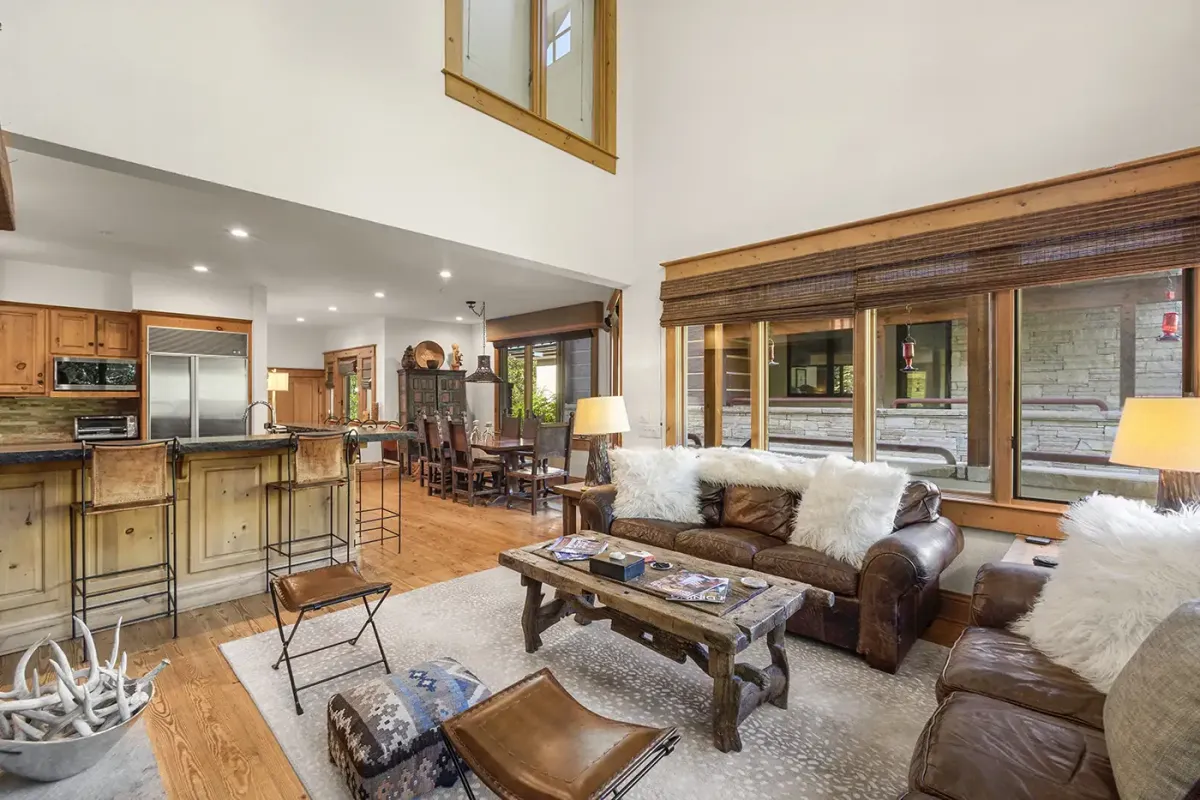 Step into the open-concept living room, where leather furnishings, a stacked-stone gas fireplace, and floor-to-ceiling windows invite you to relax in comfort and style. Natural light floods the space, while the expansive private deck wraps around the south end of the home, delivering panoramic views of the ski slopes. Fire up the propane grill and enjoy après-ski lounging in full view of the action.