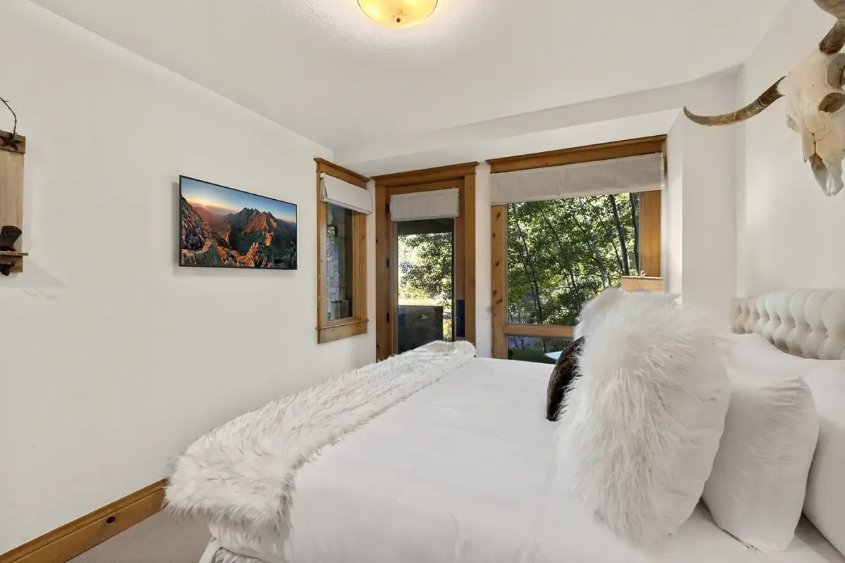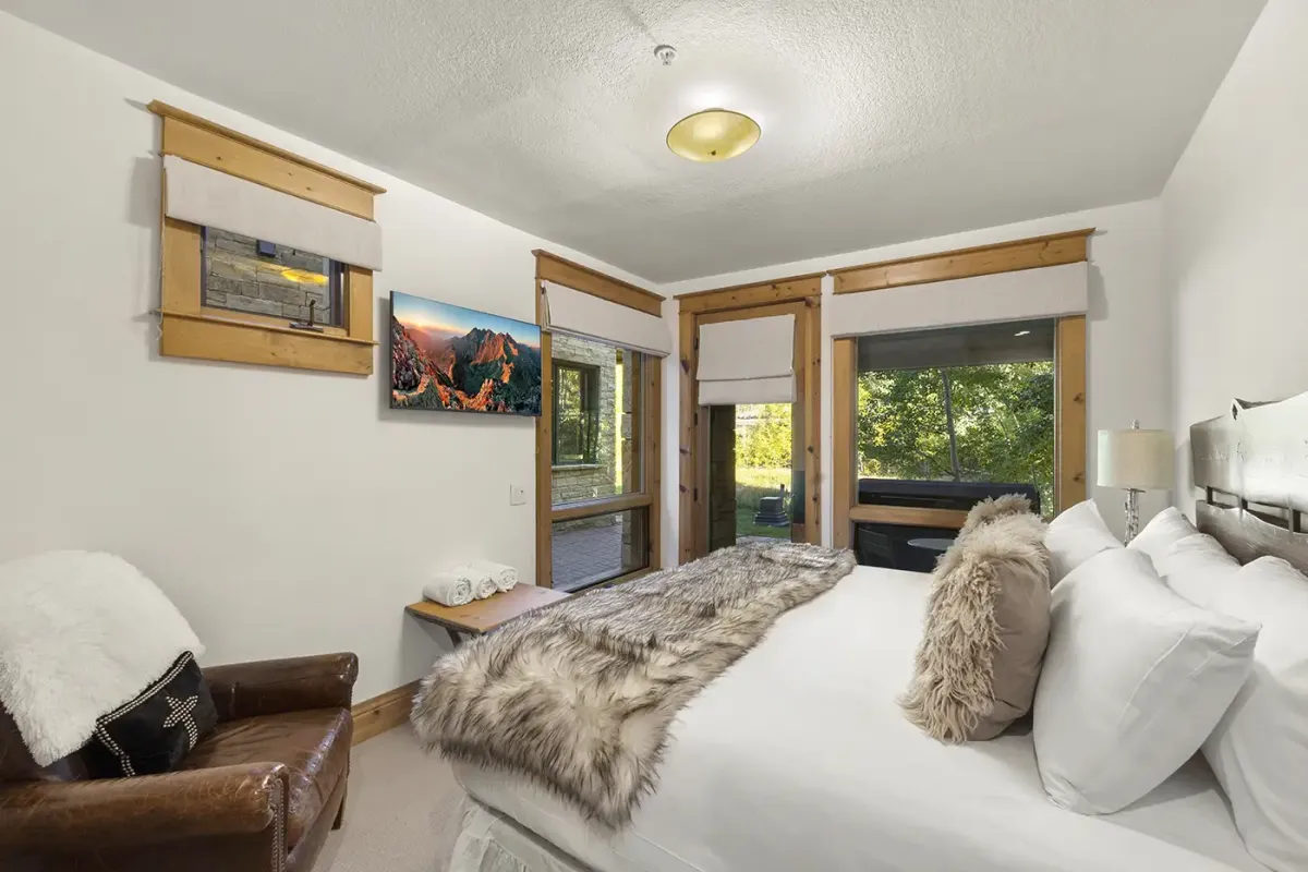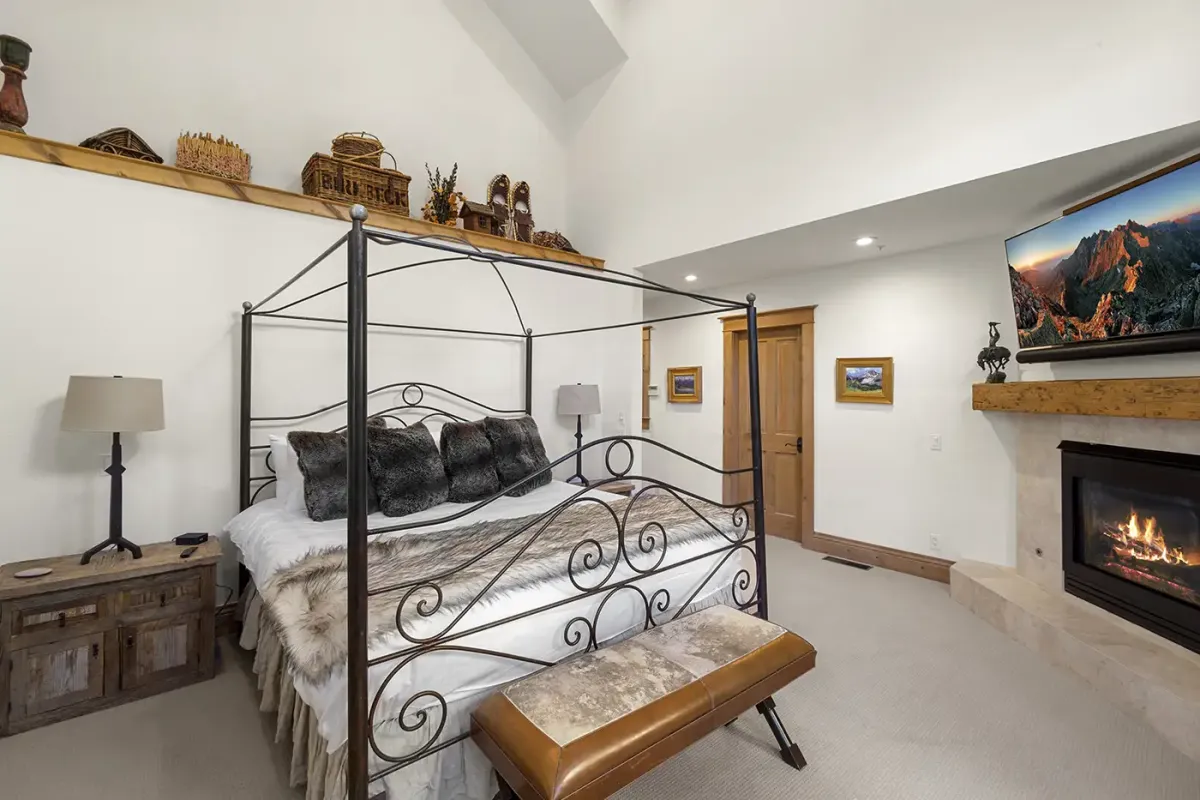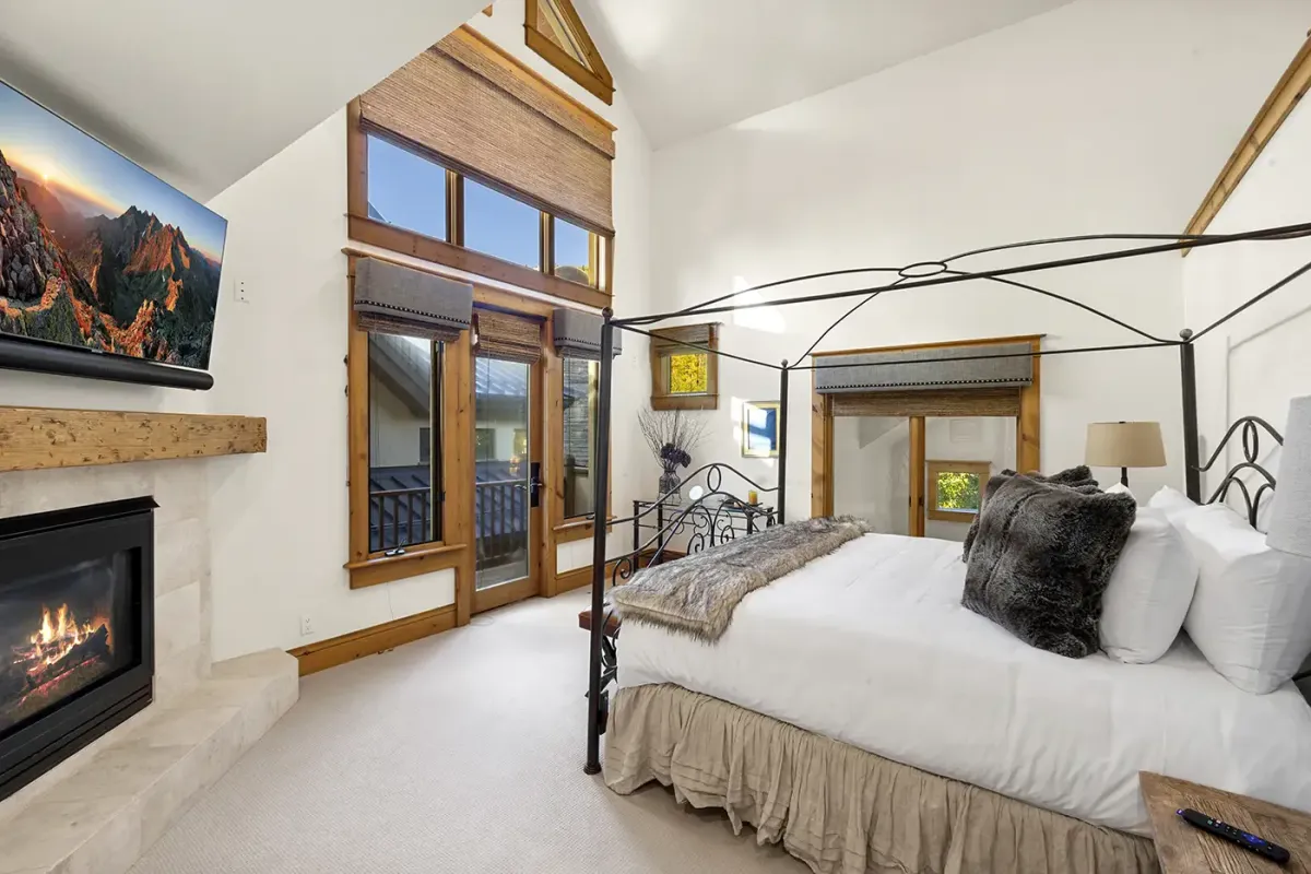 Retreat upstairs to the primary suite, where vaulted ceilings, a king-sized bed, flat-screen TV, and gas fireplace create a serene and luxurious escape. The ensuite bathroom features a steam shower and jetted tub—ideal for soaking after a day on the slopes.