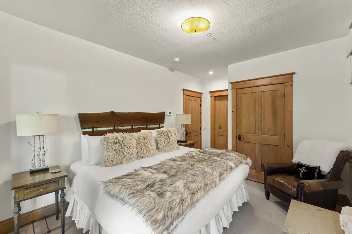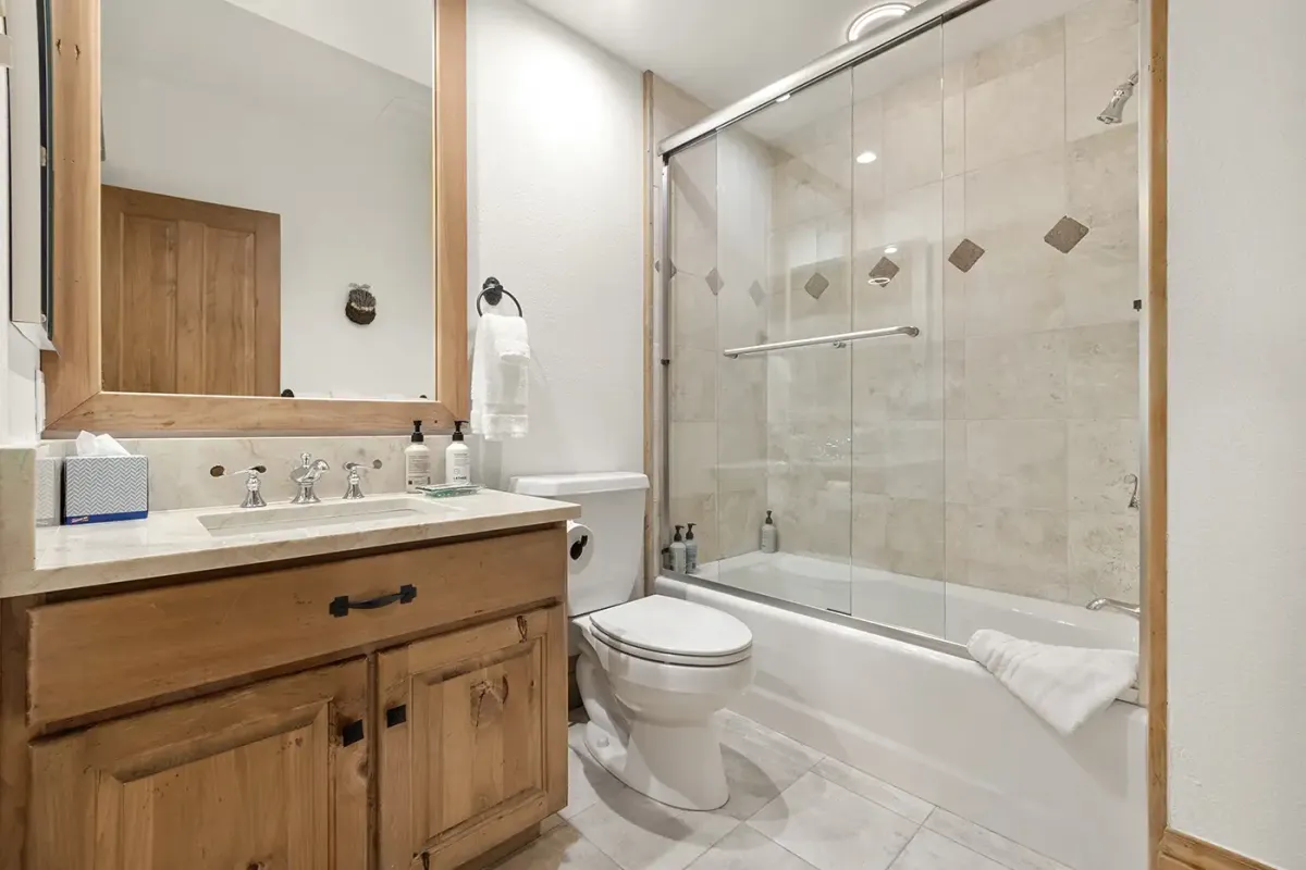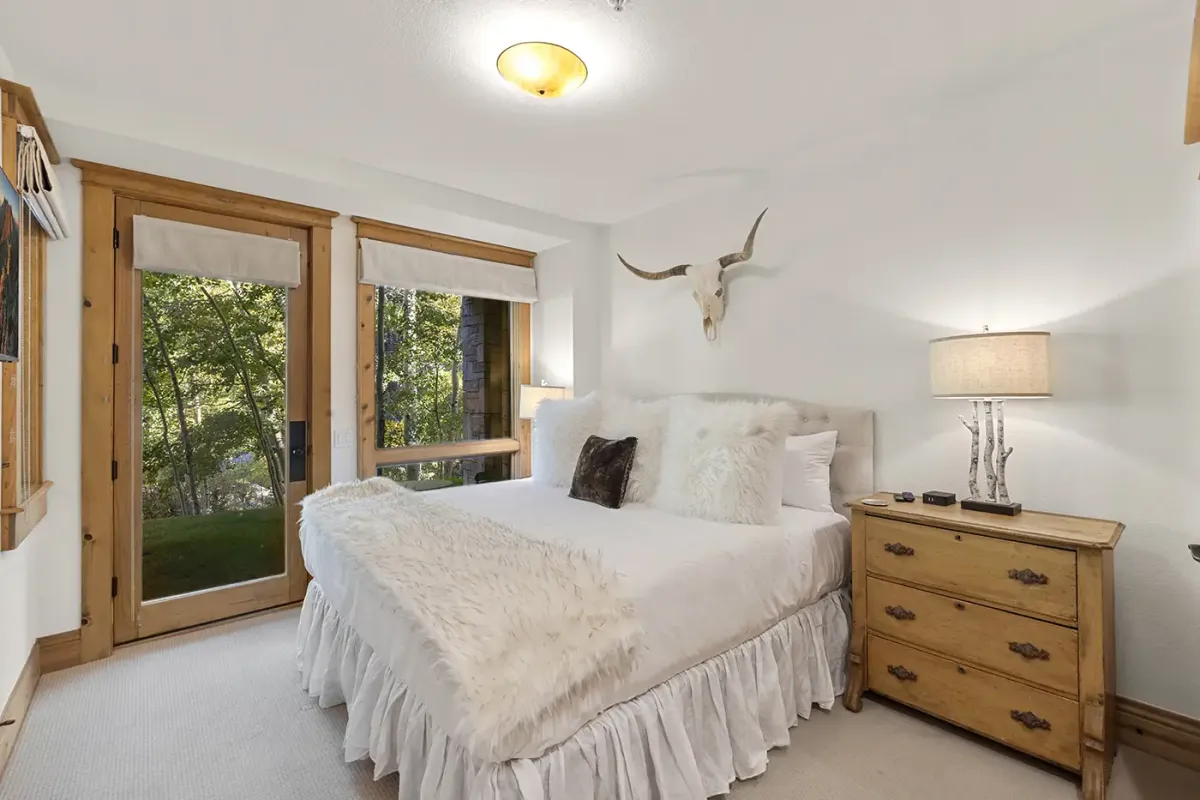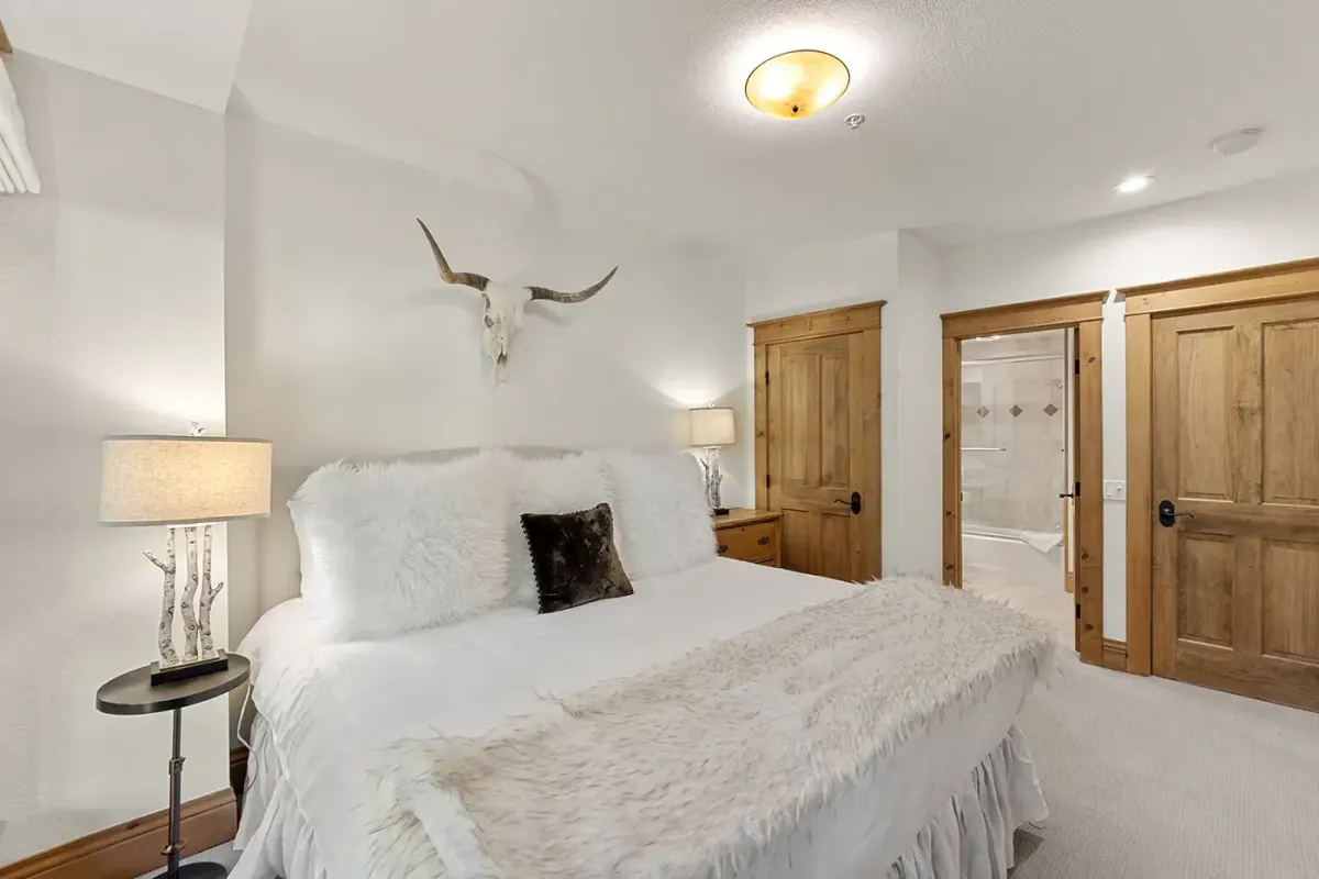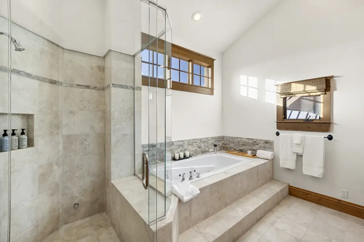 Retreat upstairs to the primary suite, where vaulted ceilings, a king-sized bed, flat-screen TV, and gas fireplace create a serene and luxurious escape. The ensuite bathroom features a steam shower and jetted tub—ideal for soaking after a day on the slopes.