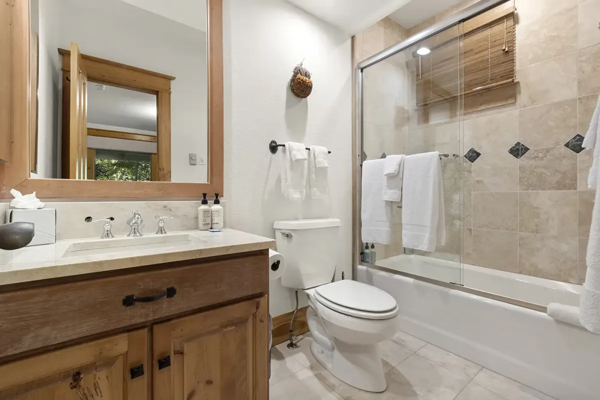 Downstairs, two additional guest rooms provide ultimate flexibility. One features a king bed and ensuite bath with a shower/tub combo, while the other offers a split king (can be arranged as two twins upon request) with an ensuite bathroom. Each room includes its own flat-screen TV for added comfort.