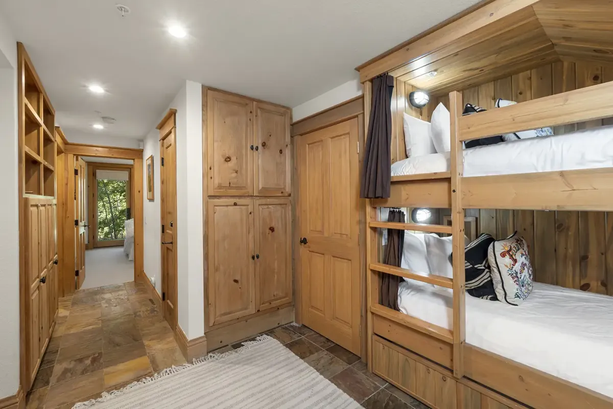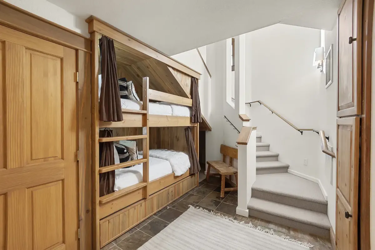 A cozy bunk nook beneath the stairwell includes a twin bunk bed with a trundle—perfect for little adventurers—and a built-in reading area just for them.
