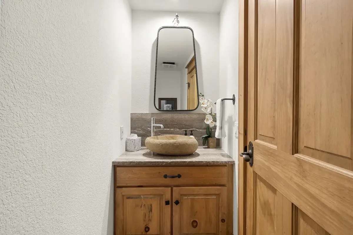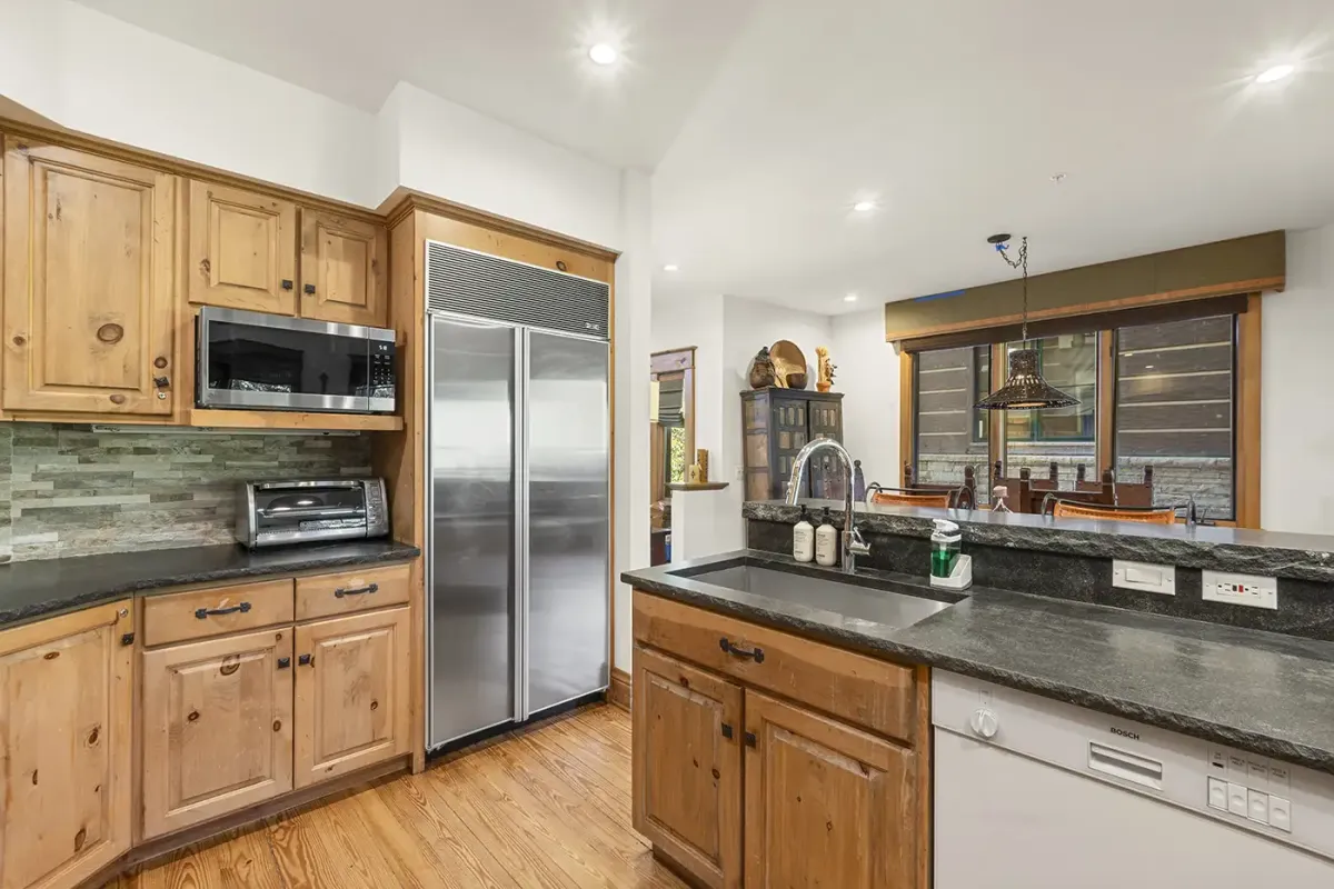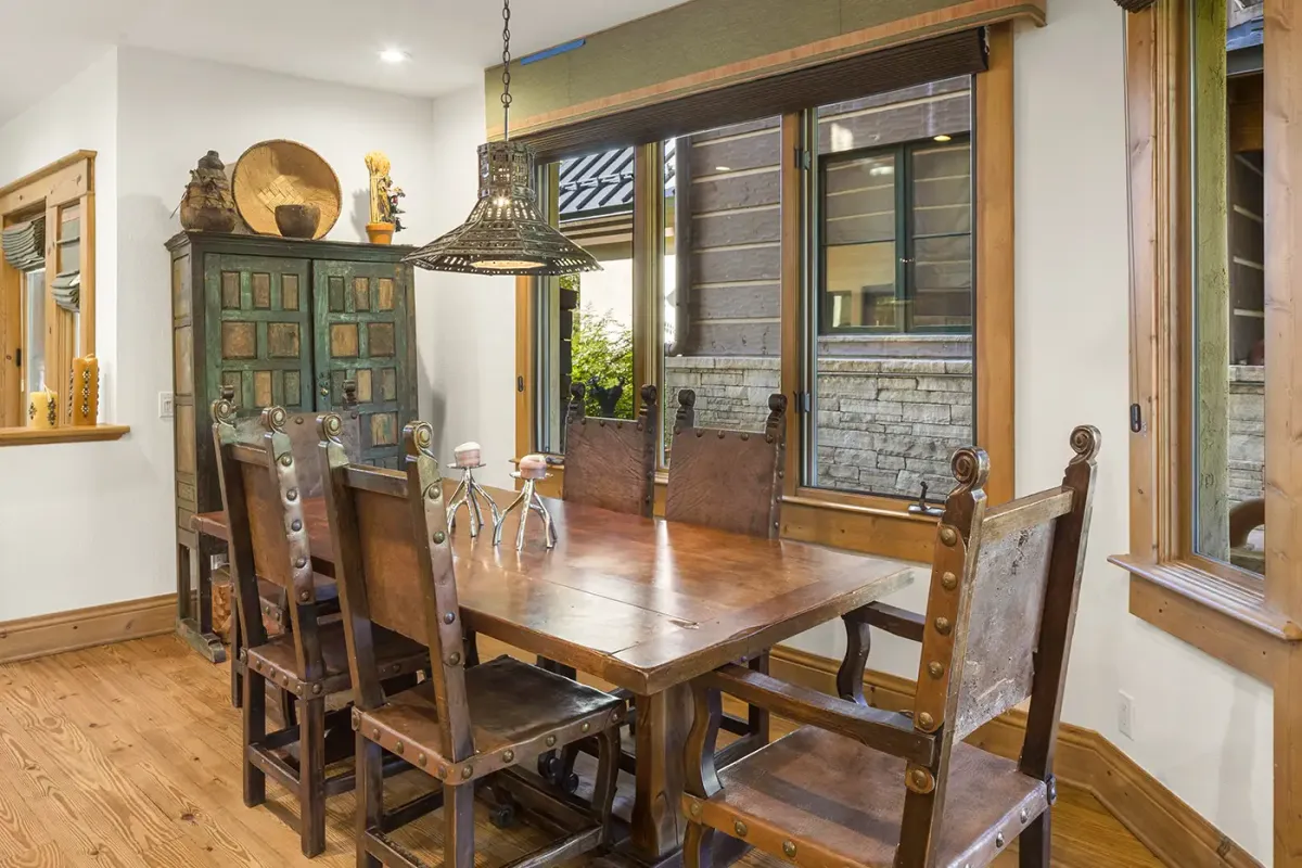 The gourmet kitchen is seamlessly connected to the living space, complete with high-end appliances and all the essentials to prepare a cozy dinner or hearty mountain breakfast. The dining area seats six, creating the perfect setting for shared meals and memorable conversation. A convenient half bath is located just off the main living area.