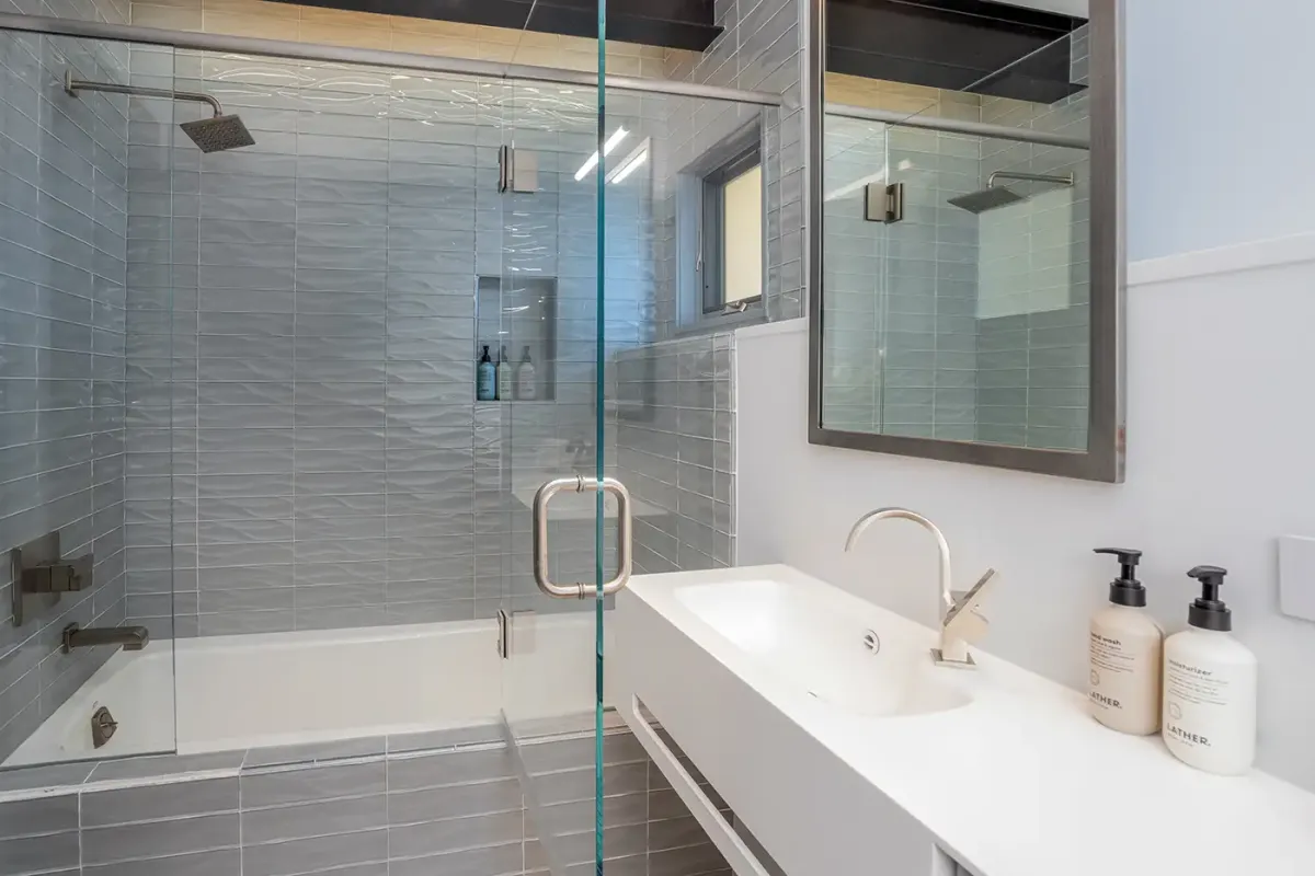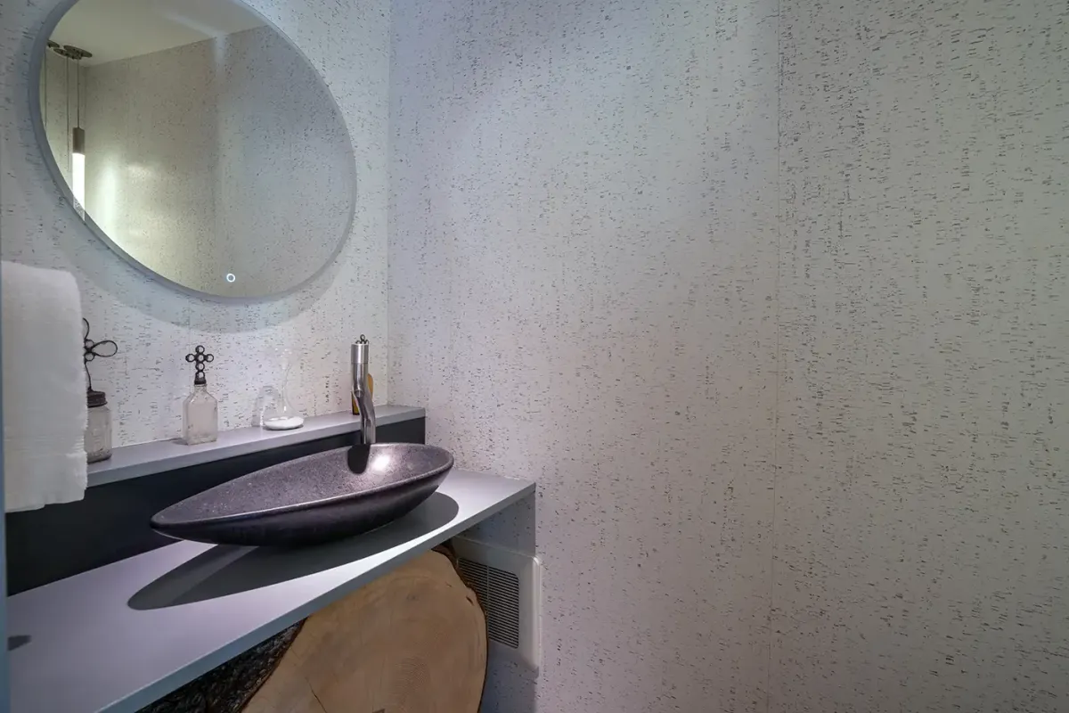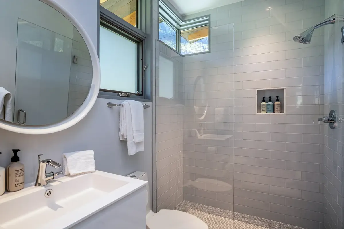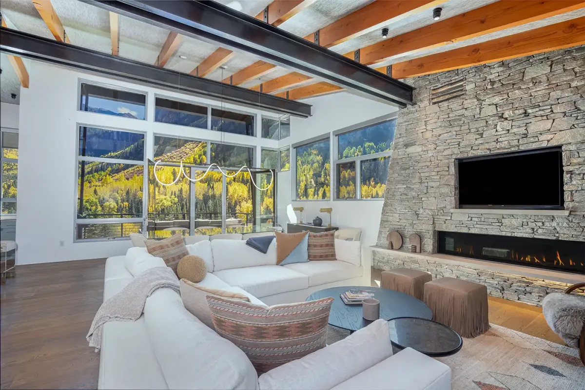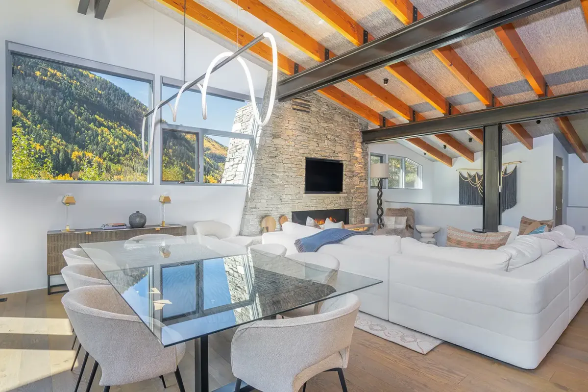 Designed to complement its National Park–like surroundings, Bridal Veil Retreat showcases floor-to-ceiling windows, rich organic finishes, and abundant daylight throughout. Custom interiors by Sage House Designs exude a sense of serenity and livable sophistication, balancing minimalist lines with warm, textural elements. Every detail — from the sculptural lighting to the exposed wood beams — draws the eye outward to the dramatic scenery. The result is a home that feels both grounded and ethereal, seamlessly uniting craftsmanship and alpine beauty.