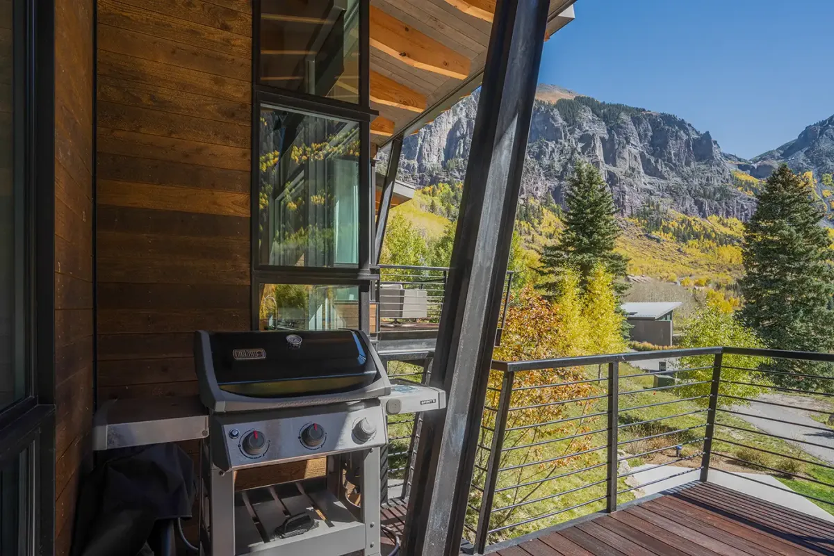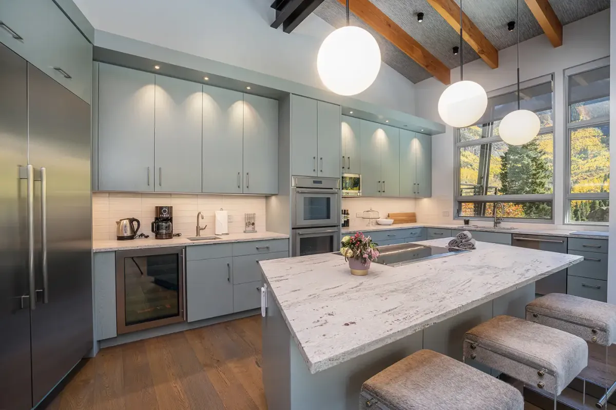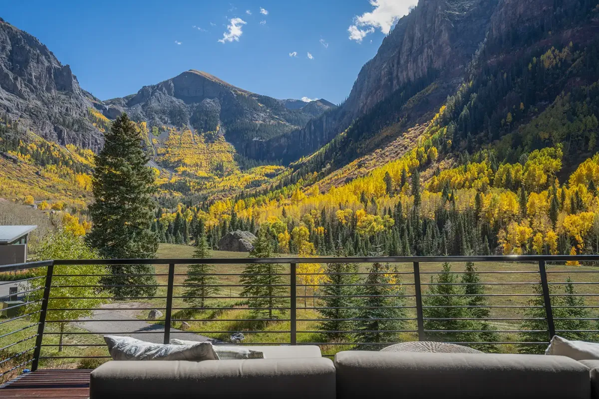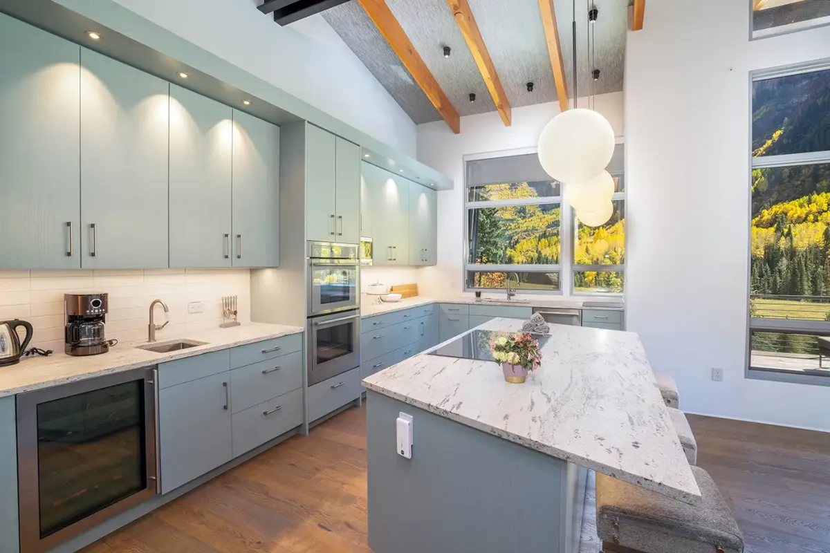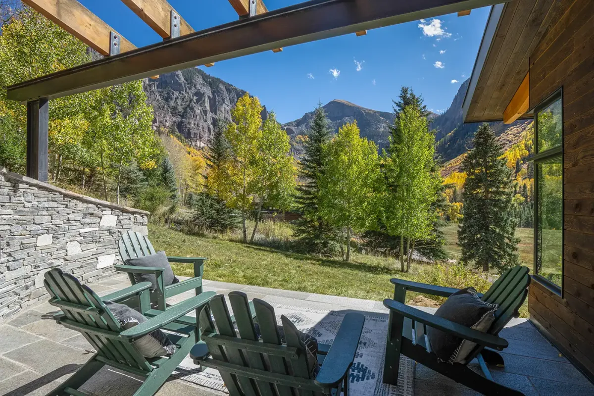 The main level welcomes guests into a sunlit great room, where a large sectional sofa, stone fireplace, and expansive windows frame unobstructed views of the canyon and its famed waterfalls. The adjoining dining area comfortably seats eight beneath custom lighting, while the chef’s kitchen delights with robin’s egg blue cabinetry, high-end appliances, and island seating for three. Glass doors open completely to a spacious patio furnished with a sectional and coffee table — the perfect spot for morning coffee or sunset gatherings surrounded by Telluride’s peaks.