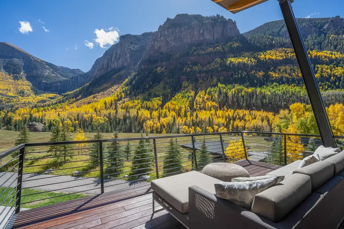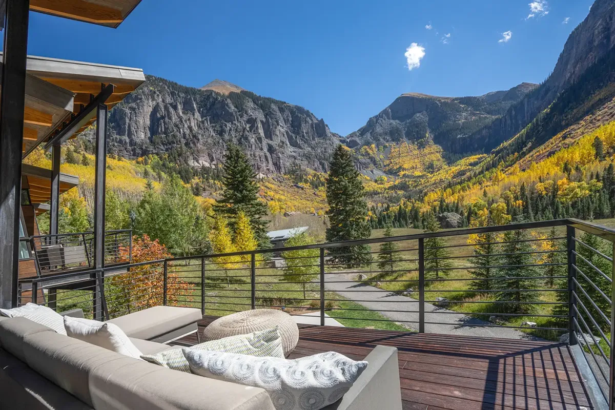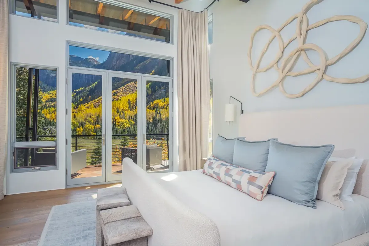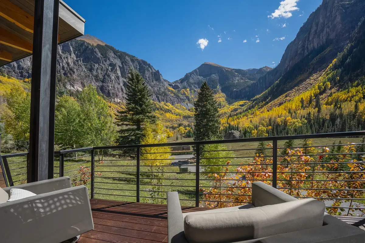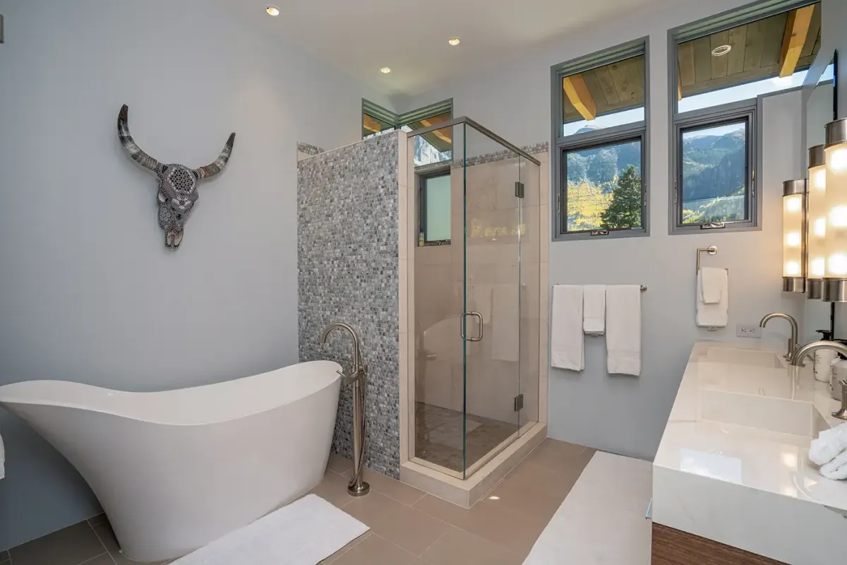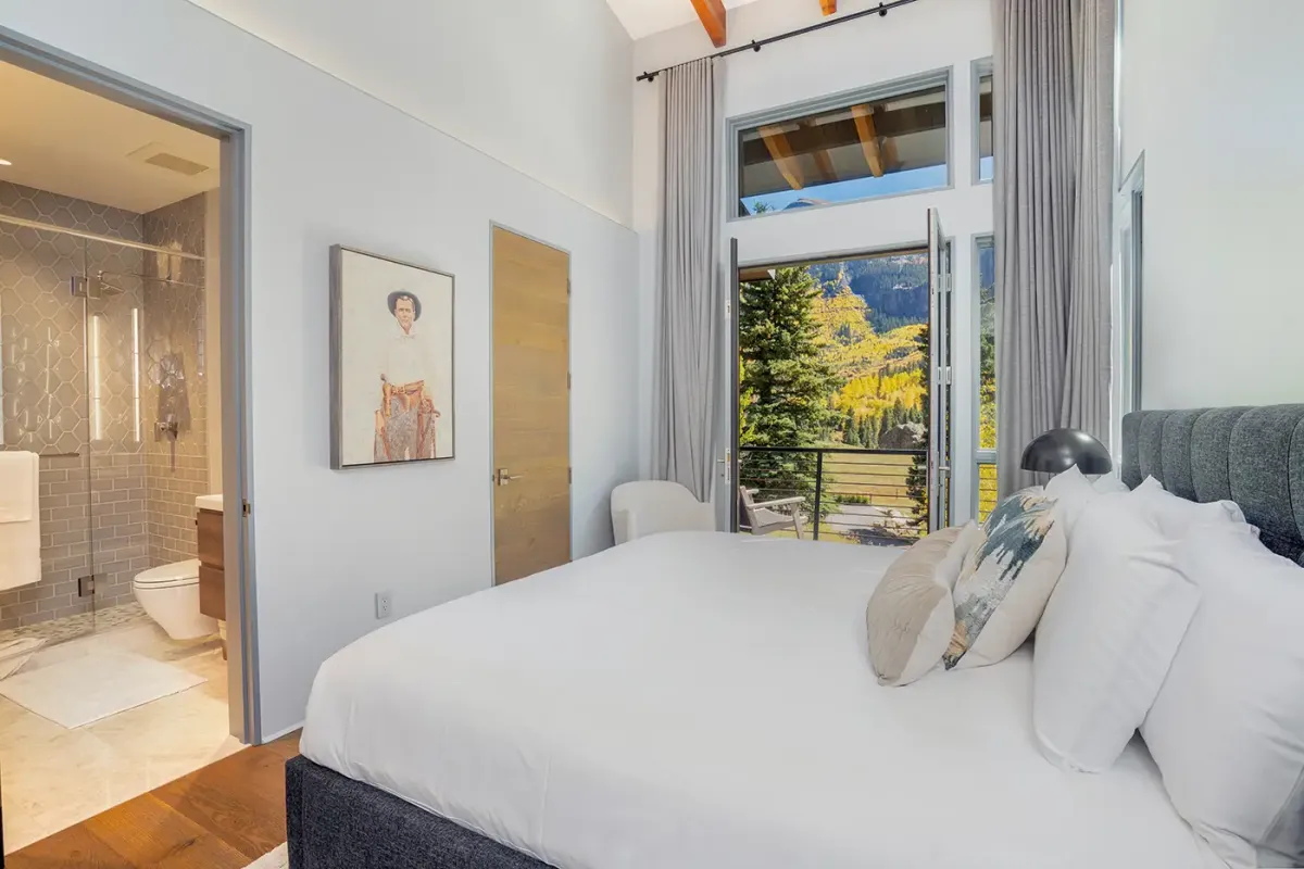 The primary suite offers a king bed, private deck with seating for two, and breathtaking vistas of Ajax Peak and Bridal Veil Falls. Its spa-inspired bath features dual vanities, a soaking tub, and glass-enclosed shower.