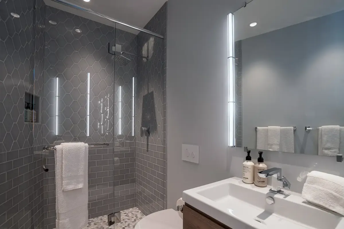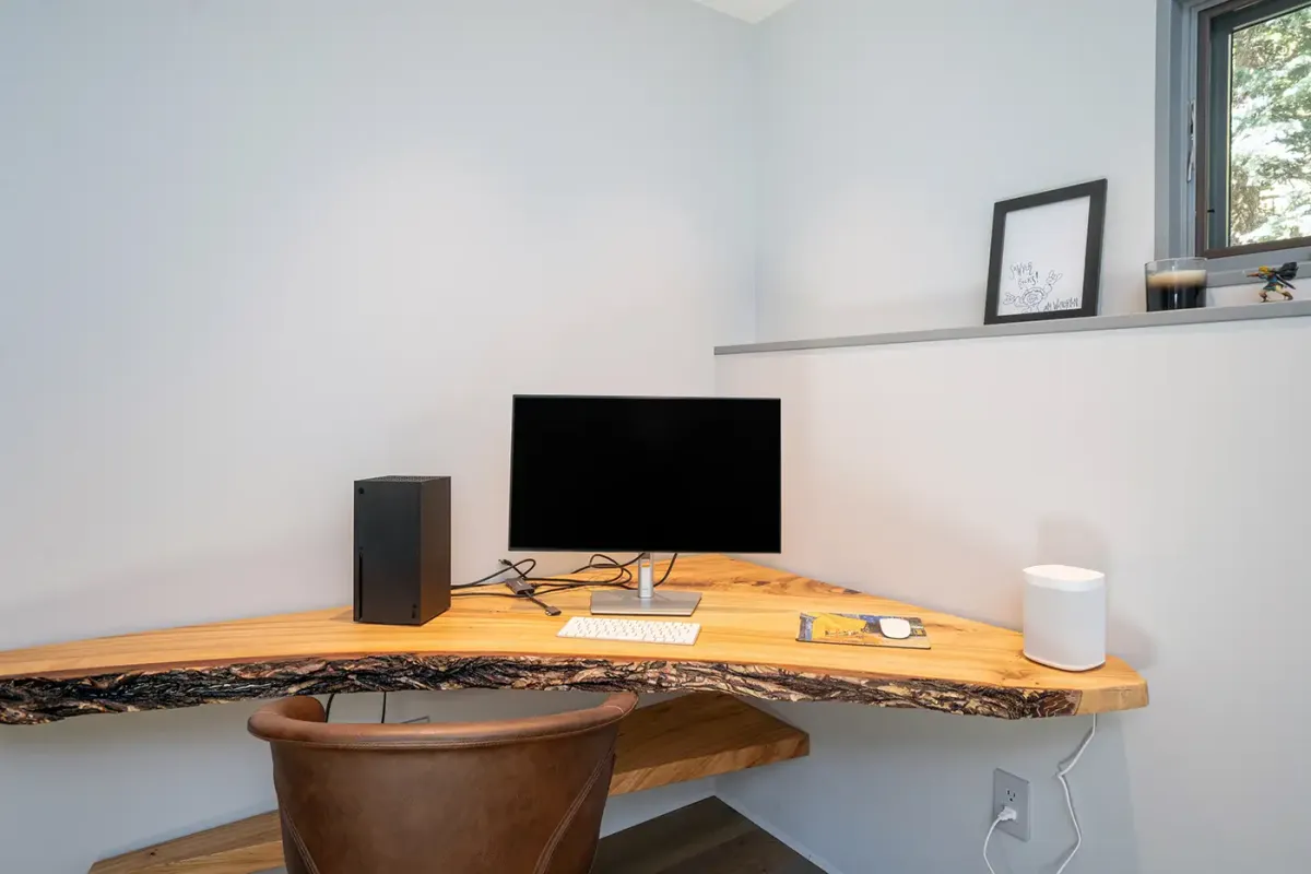 A third king suite features an en suite with a tub-shower combination, while the bunk room — with two queen bunk beds, a desk, and an en suite bath with glass shower — provides a bright and playful space for younger guests.
