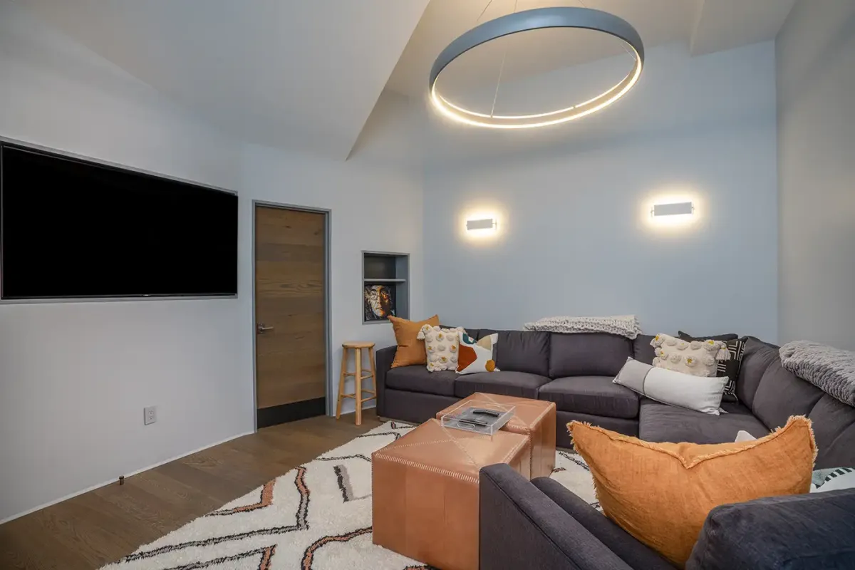 Downstairs, a multi-purpose wellness suite functions as both media room and fitness center. A plush sectional and flat-screen TV invite cozy movie nights, while a Peloton, free weights, and full gym setup allow for energizing workouts. The adjacent sauna, located just off the garage, offers a rejuvenating finish to days spent exploring the mountains.