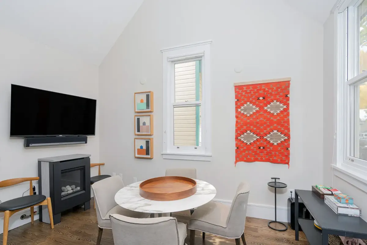 Step inside to a sunlit living room with a deep sectional sofa and two cozy armchairs, perfect for relaxing after a day on the trails or slopes. Adjacent to the living area, a dining nook with a fireplace, TV, and seating for four sets the scene for leisurely meals or game nights. The nearby kitchen is compact yet fully equipped, and a convenient powder room completes this level.