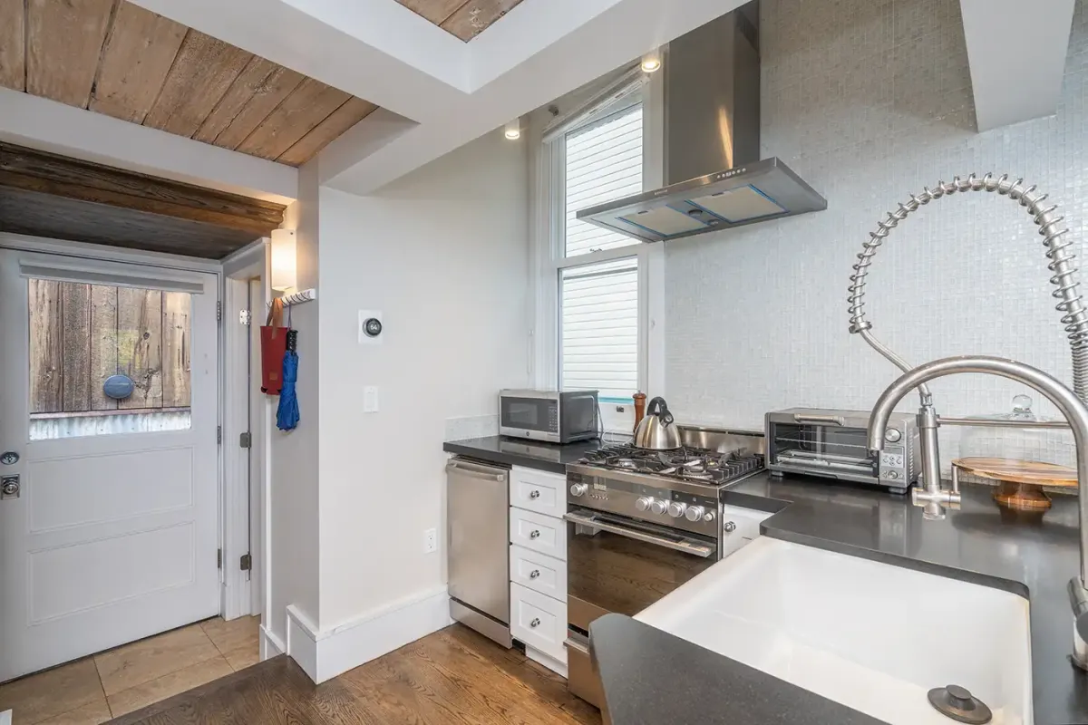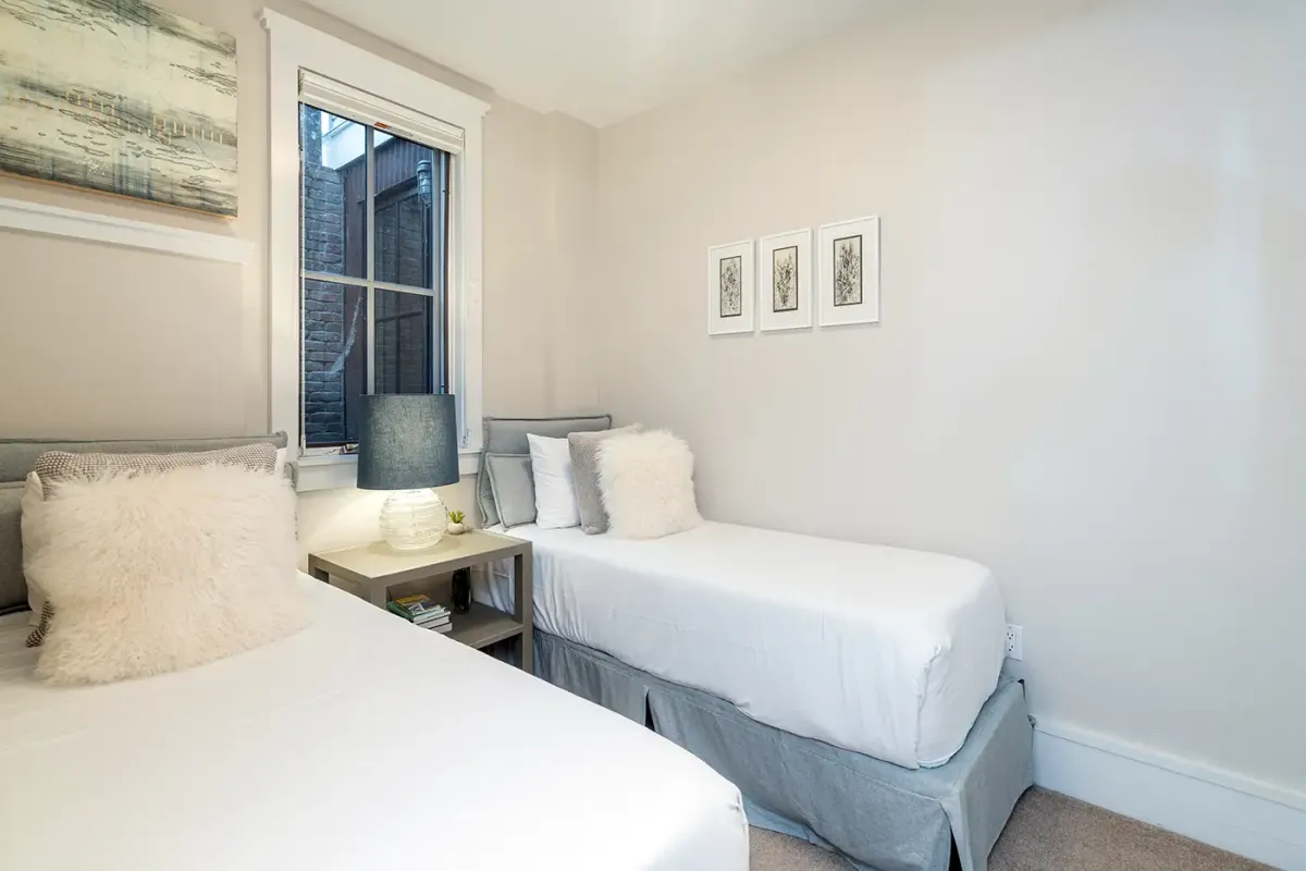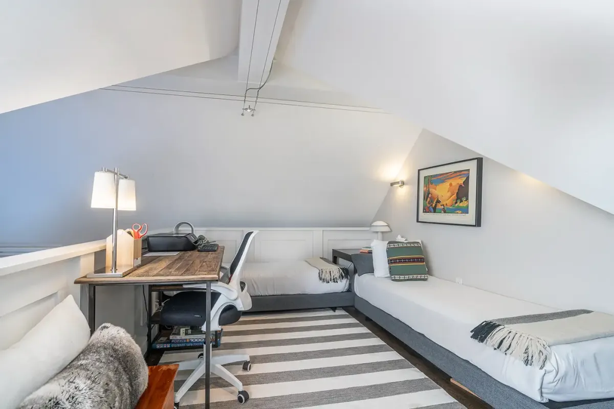 Upstairs, a loft with a desk, printer, and two convertible twin beds offers a quiet spot for reading, remote work, or extra guests.