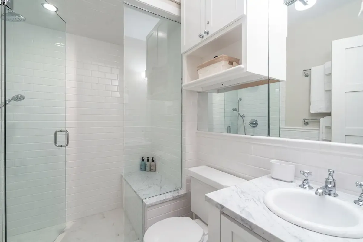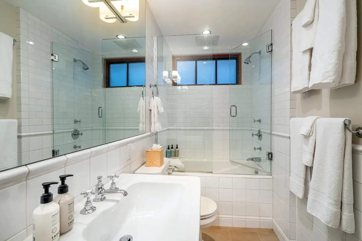 The lower level features the serene primary suite with a king-size bed and en-suite bath with a glass-enclosed shower. A second bedroom with a split queen bed shares this floor, along with a full bath with a tub/shower combination. A stackable washer/dryer can be found off the hall for added convenience.