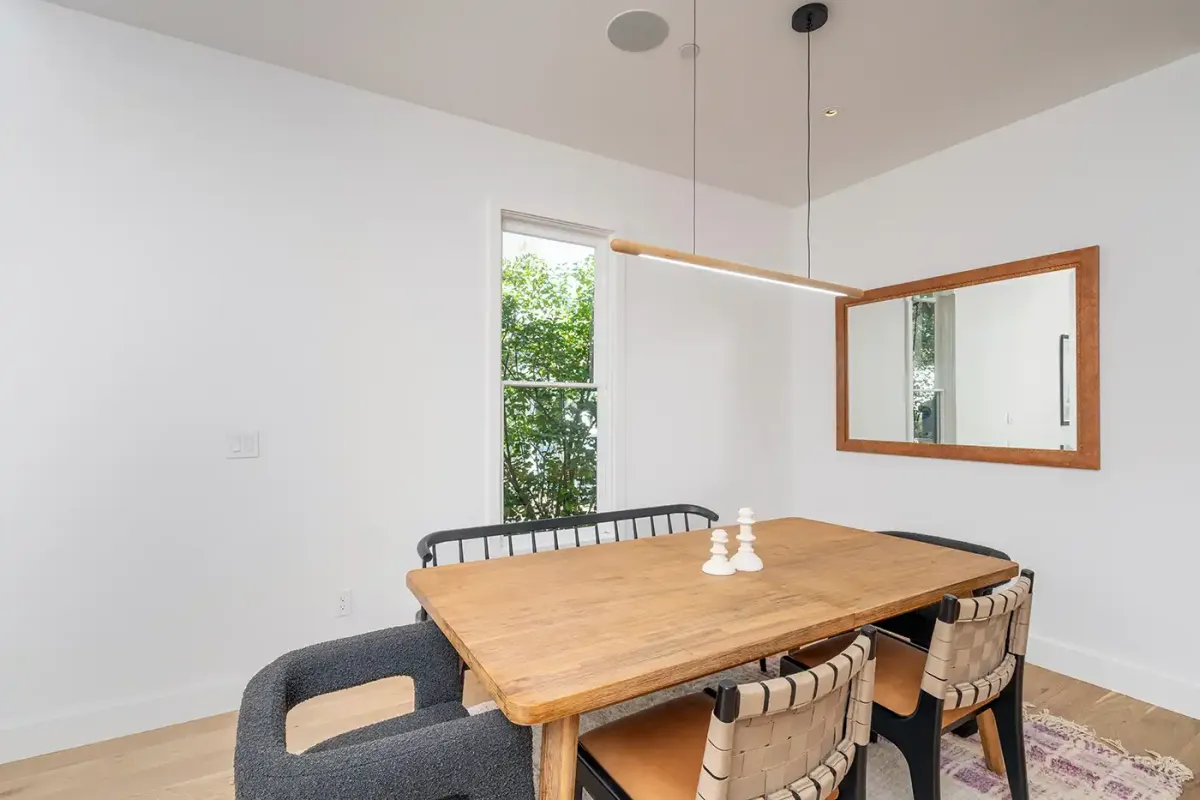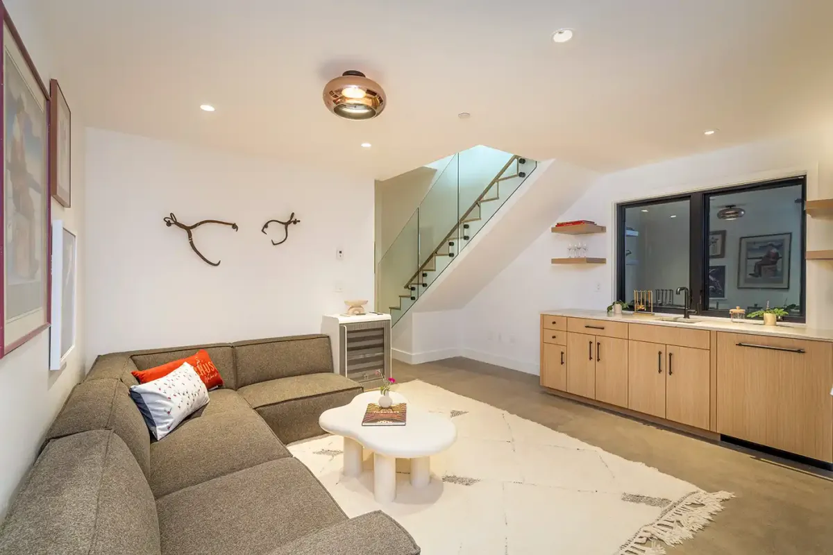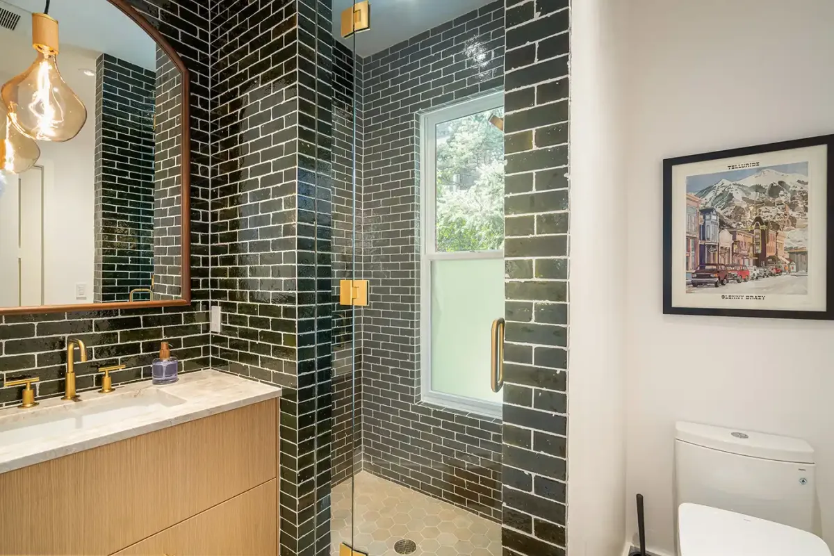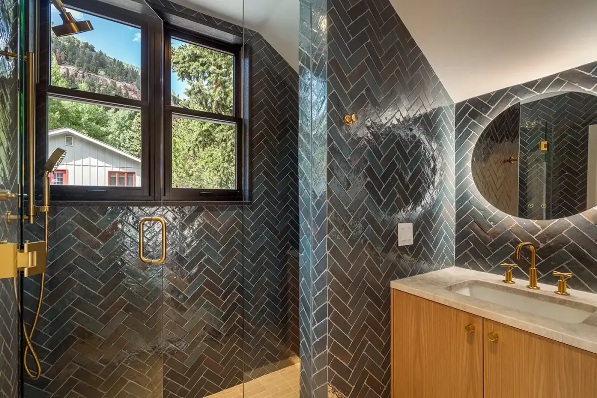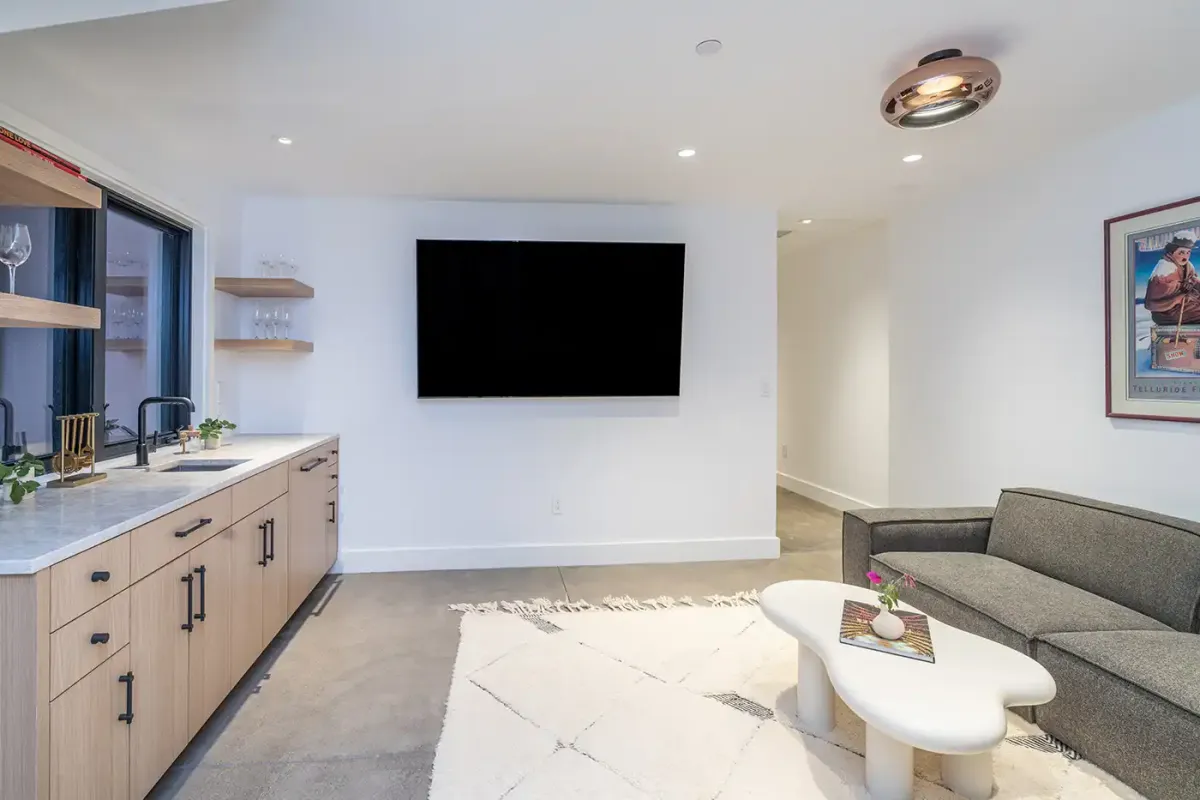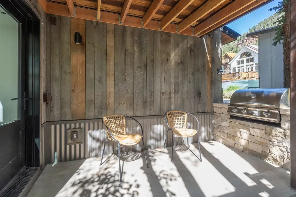 Welcome to Magic on Main, a newly built 5-bedroom home located in the heart of Telluride's vibrant Main Street. Enter into an inviting, light-filled living, kitchen, and dining area where luxury meets comfort. The kitchen features a half waterfall Taj Mahal leathered countertop, custom cabinetry, and high-end stainless steel appliances, perfect for preparing a casual meal or a gourmet feast. Step out back to the grill for a perfect evening barbecue. The main floor also boasts a bathroom with a stunning Moroccan tile shower and an adjacent office with a queen sleeper sofa, ideal for additional guests.