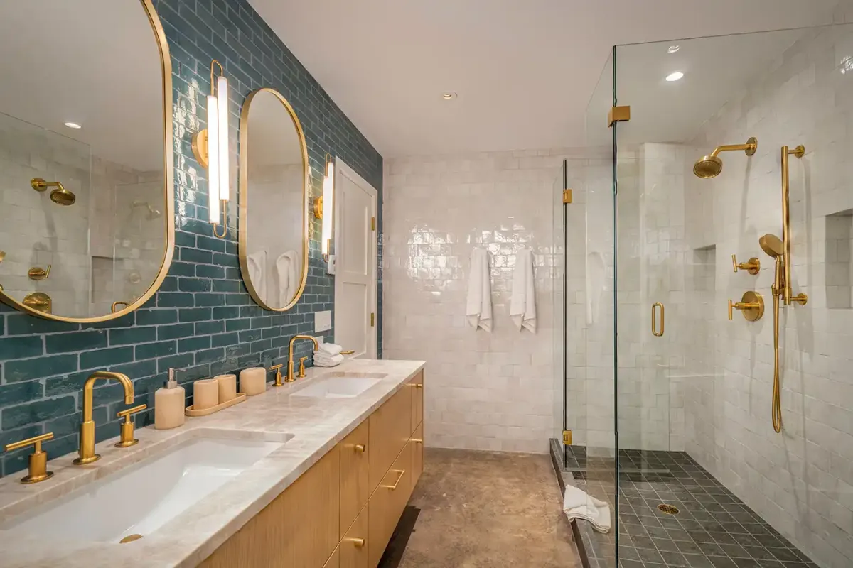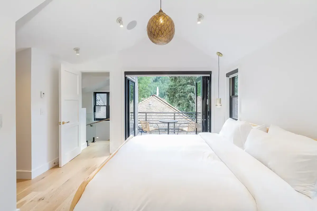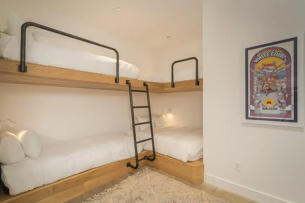 Magic on Main offers five luxurious bedrooms designed for ultimate relaxation. The primary suite upstairs features two private decks, including one with two chairs overlooking the Telluride Ski Resort - perfect for coffee and conversation. Accordion glass doors allow the outside to flow seamlessly into the room. Enjoy a flat-screen TV and an ensuite bath with dual vanity sinks and a spacious shower. The bottom floor includes a bunk room with three twin beds and one queen bed, two guest rooms with a king bed and a split king bed respectively, and a shared, beautifully appointed bathroom with a glass walk-in shower. There is also a bathroom directly adjacent to the bunk room for added convenience.