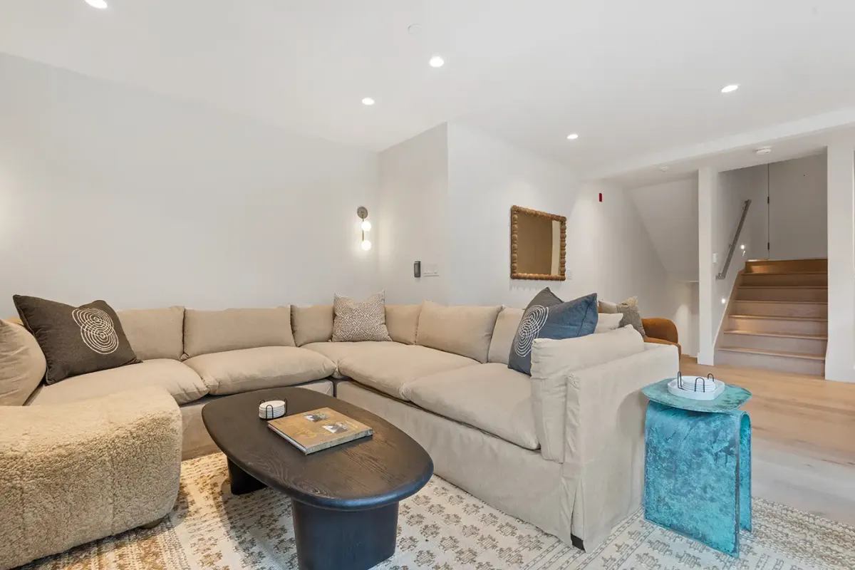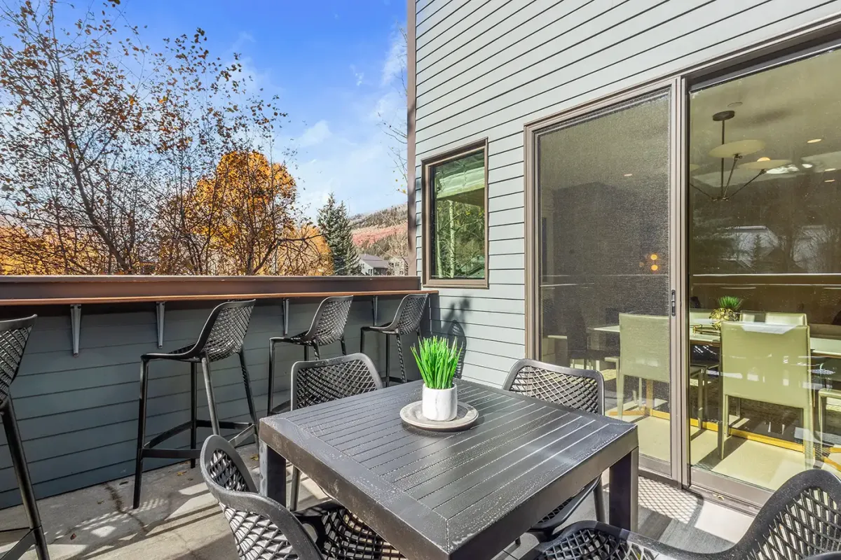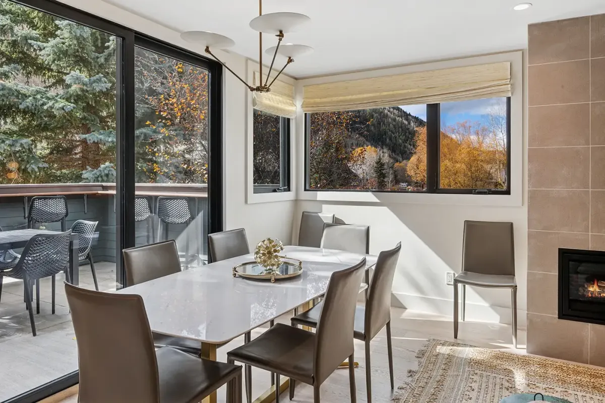 The great room sets the tone for contemporary alpine living with wide-plank white oak flooring, a floor-to-ceiling intricate tile fireplace, and expansive windows framing Telluride’s world-renowned ski resort. The open-concept design seamlessly connects the living, dining, and chef’s kitchen, where custom white oak cabinetry, Taj Mahal quartzite counters, and a jade Moroccan tile backsplash elevate every gathering. A stylish dining area with seating for eight and plush sectional seating in the living area make this the perfect space to entertain or unwind after a day outdoors. Looking to extend your time in nature? The adjacent, generous patio area, complete with bar height and patio seating is ideal for entertaining during warm summer evenings and sunny après ski afternoons.