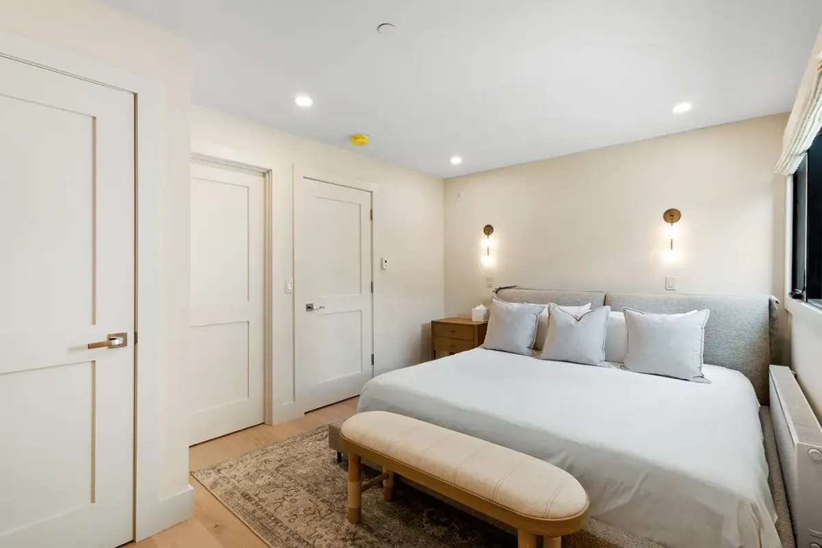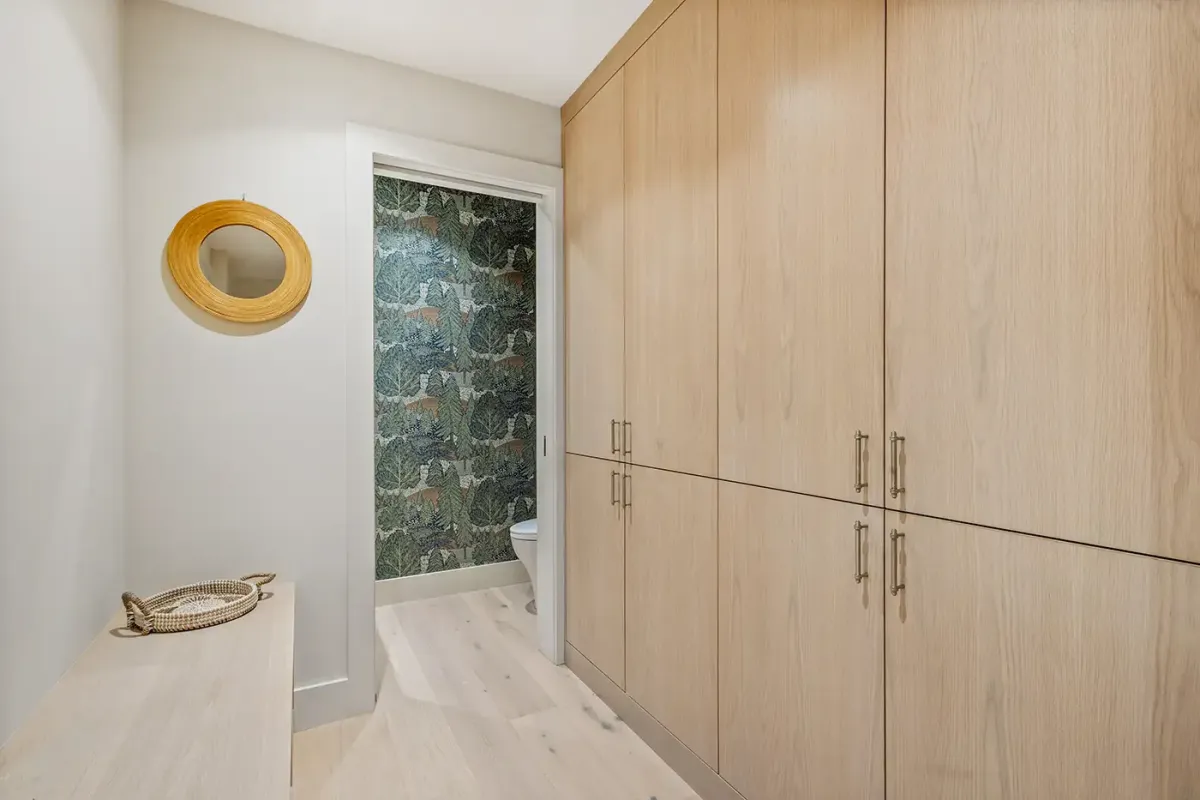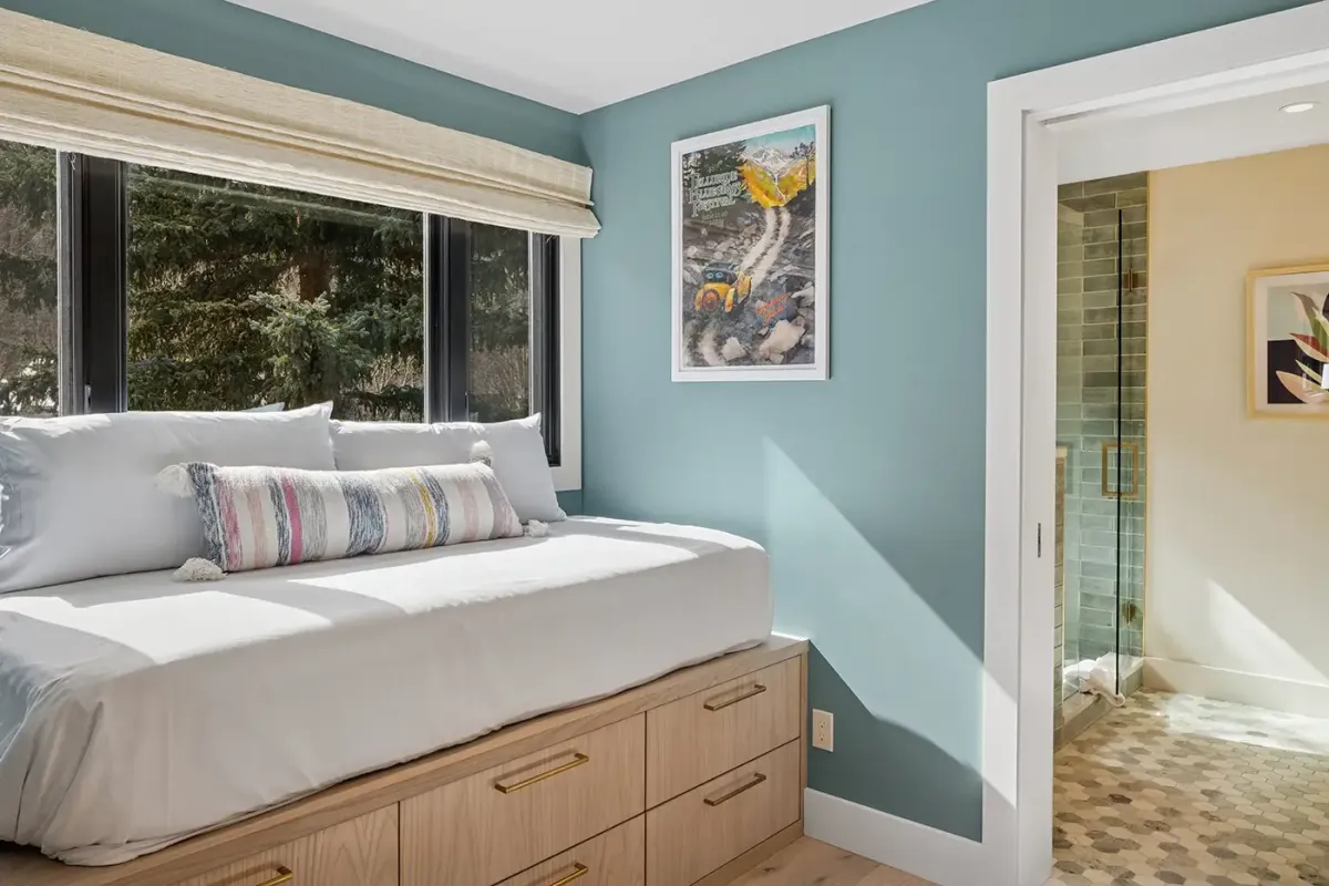 One level below, the primary suite includes a king bed, a cozy reading nook with twin-size bed and desk, and a spa-inspired ensuite with dual vanity sinks, a walk-in shower, and beautiful Morroccan tile, which continues throughout each of the home’s bathrooms.