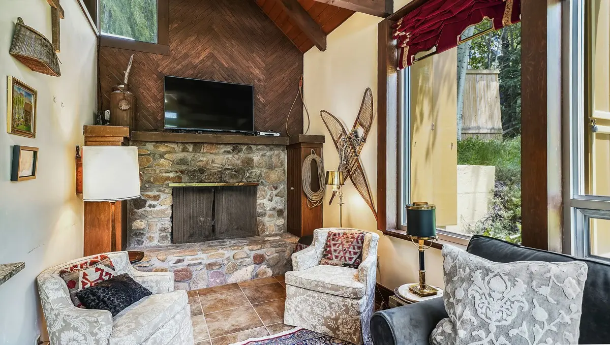 Antique furniture and original lighting fill the home (accompanied by some modern conveniences, of course), transporting you back into the days of Telluride's rich mining history. The kitchen is lined with original cabinetry and new granite countertops, accompanied by stainless steel appliances serving the adjacent dining room for four. Lying beyond this space is the living room, boasting large picture windows and the same breathtaking views enjoyed by the patio. The living room is furnished with a new sectional sofa, as well as two armchairs and a flat-screen TV above the decorative stone fireplace and hearth.